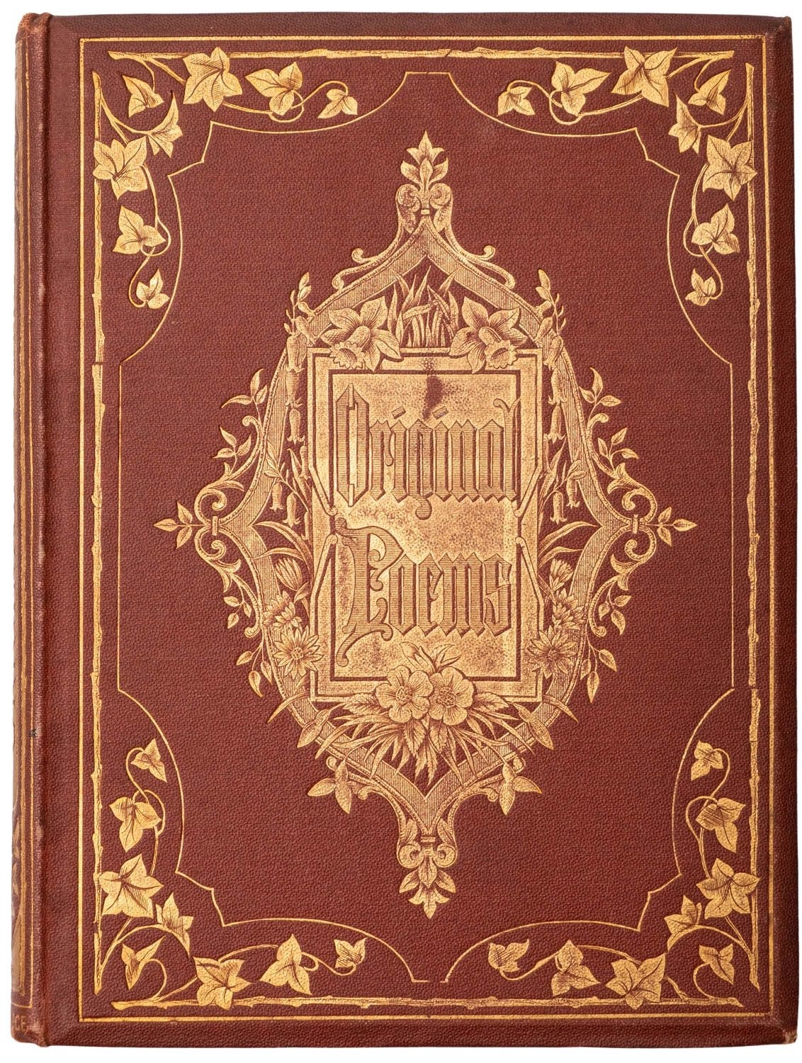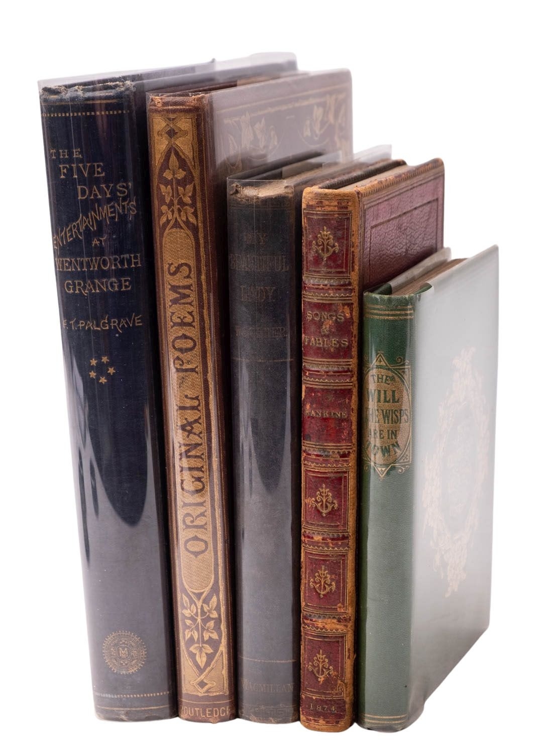 ILLUSTRATED, C19th. Five vols: PALGRAVE, Francis Turner. The Five Days Entertainments at Wentworth Grange, London: Macmillan and Co., 1868, half-title, engr. vignette title bordered in red, 6 woodcut plates, illustrations, decorative blue cloth gilt by Burn & Co. (binder's ticket to rep), rubbed, splitting to hinges, t.e.g., 8vo; WOOLNER, Thomas. My Beautiful Lady, London: Macmillan and Co., 1866, (3rd ed.), half-title (contemp. ink ownership inscription), engr. vignette title, decorative blue cloth gilt, rubbed, toning to spine, 12mo; RANKINE, William J. Macquorn. Songs and Fables, Glasgow: James MacLehose, 1874, (2nd ed.), half-title, tipped-in photographic portrait frontis., 10 plates, contemp. red panelled morocco gilt, rubbed, a.e.g., 12mo; ROUTLEDGE (pub.). Original Poems, London and New York: George Routledge & Sons, 1868, contemp. decorative gilt gift inscription recto to frontis., illustrations, spotting, orig. brown cloth gilt, rubbed, a.e.g., 8vo; ANDERSON, Hans Christian. The Will-O'-The-Wisps are in Town, Lonson: Alexander Strahan, nd [c.1867], half-title, engr. frontis, 6 plates, orig green cloth gilt, 16mo. (5)
