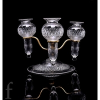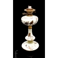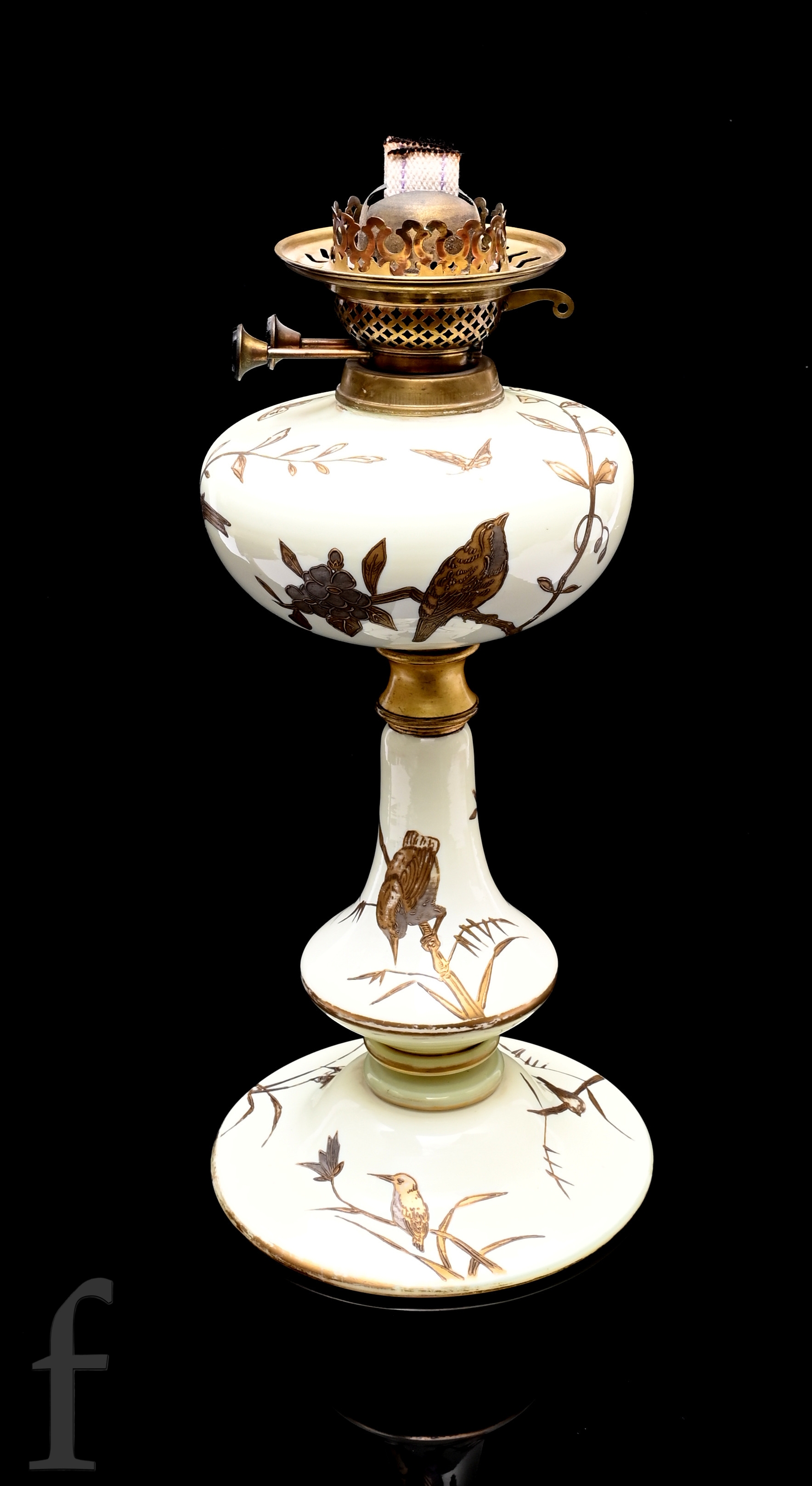 A late 19th Century Stourbridge glass table lamp attributed to Edward Webb, the upper paraffin reservoir above a swept shouldered column and wide swept foot, relief past gilded in the Aesthetic taste with various birds amongst foliage to the ivory ground unmarked, height 43cm.