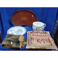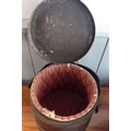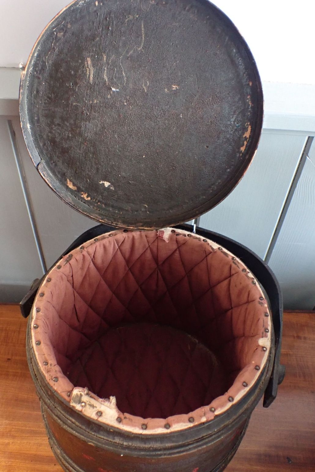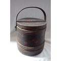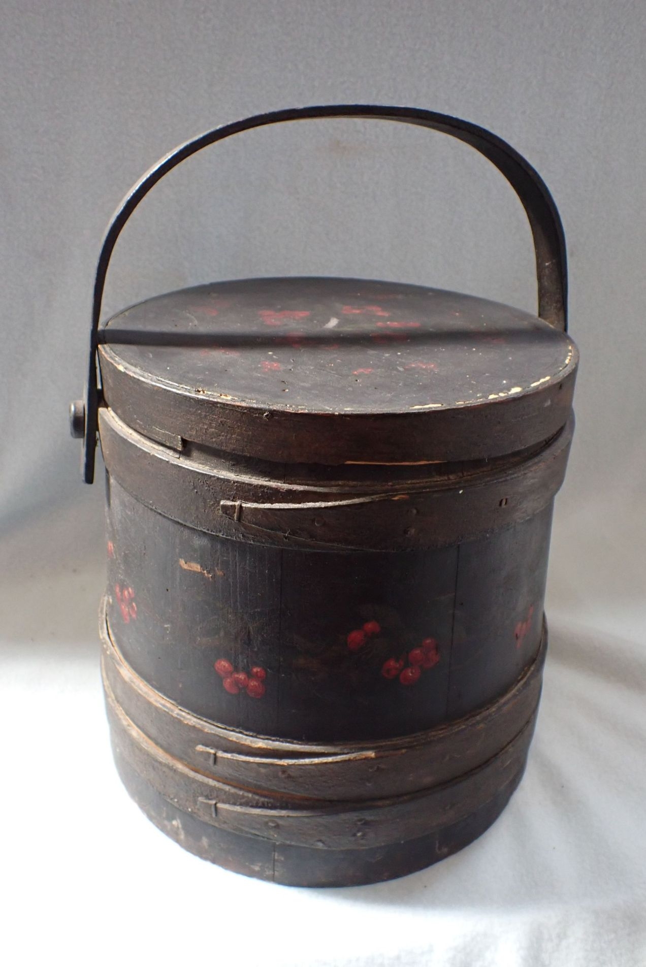 A WOODEN LIDDED BUCKET, PAINTED WITH CHERRIES ON A BLACK GROUND lined as a sewing box, with retailer's stamp 'J. JENKINS, BRUSH & BASKET WAREHOUSE, 24 BROADMEAD, BRISTOL' (woodworm)