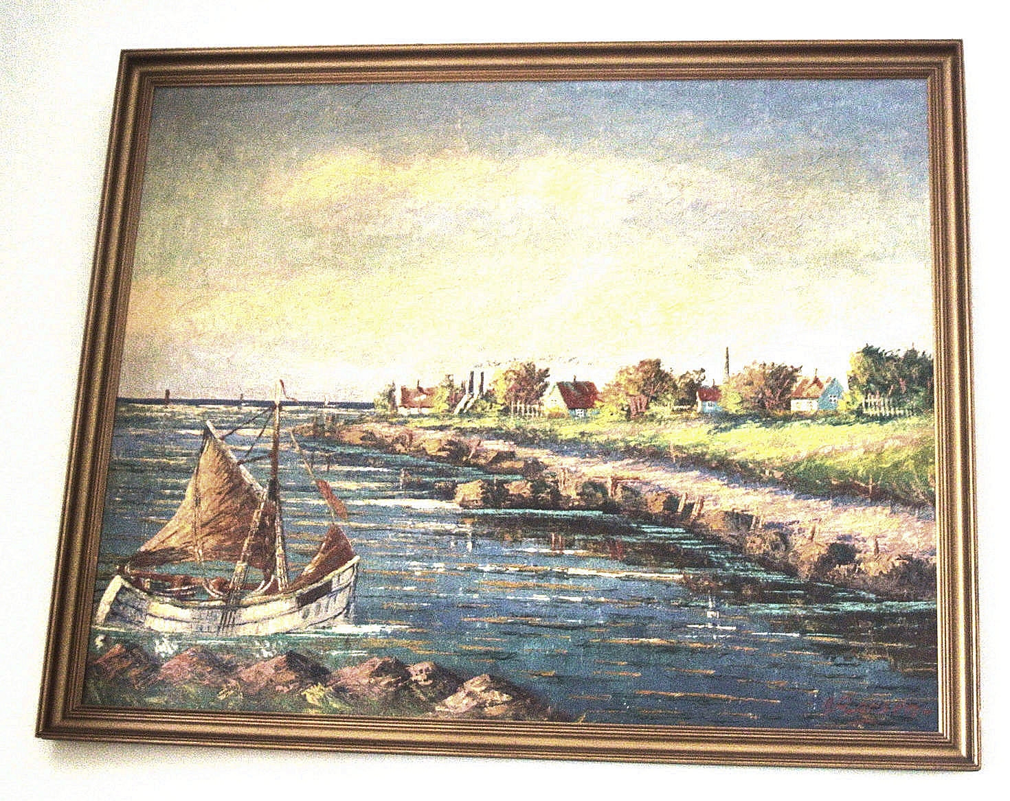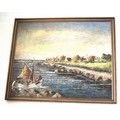 Continental School 'Riverside study with boats and cottages' oil on canvas, signed H88 x 73cm
