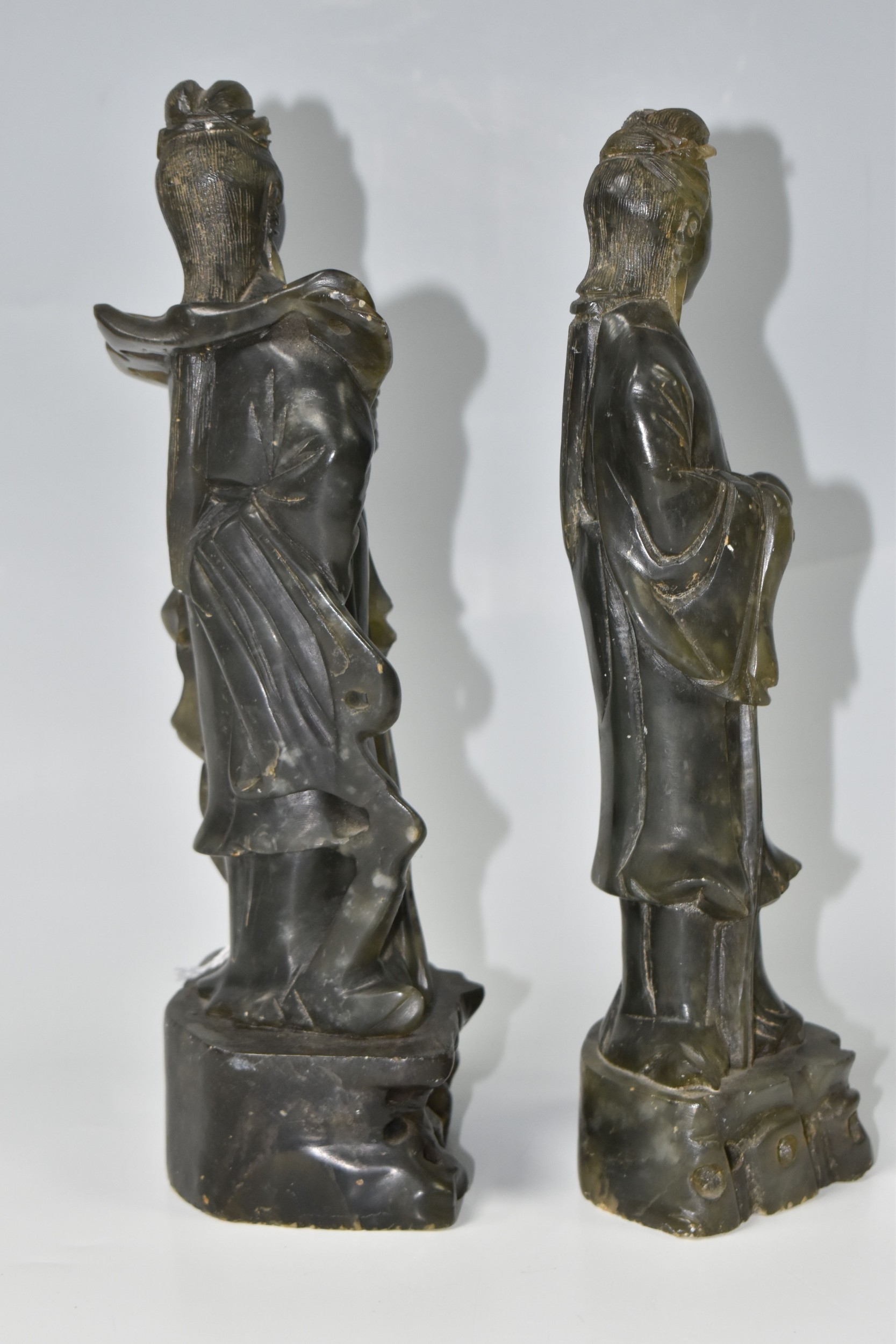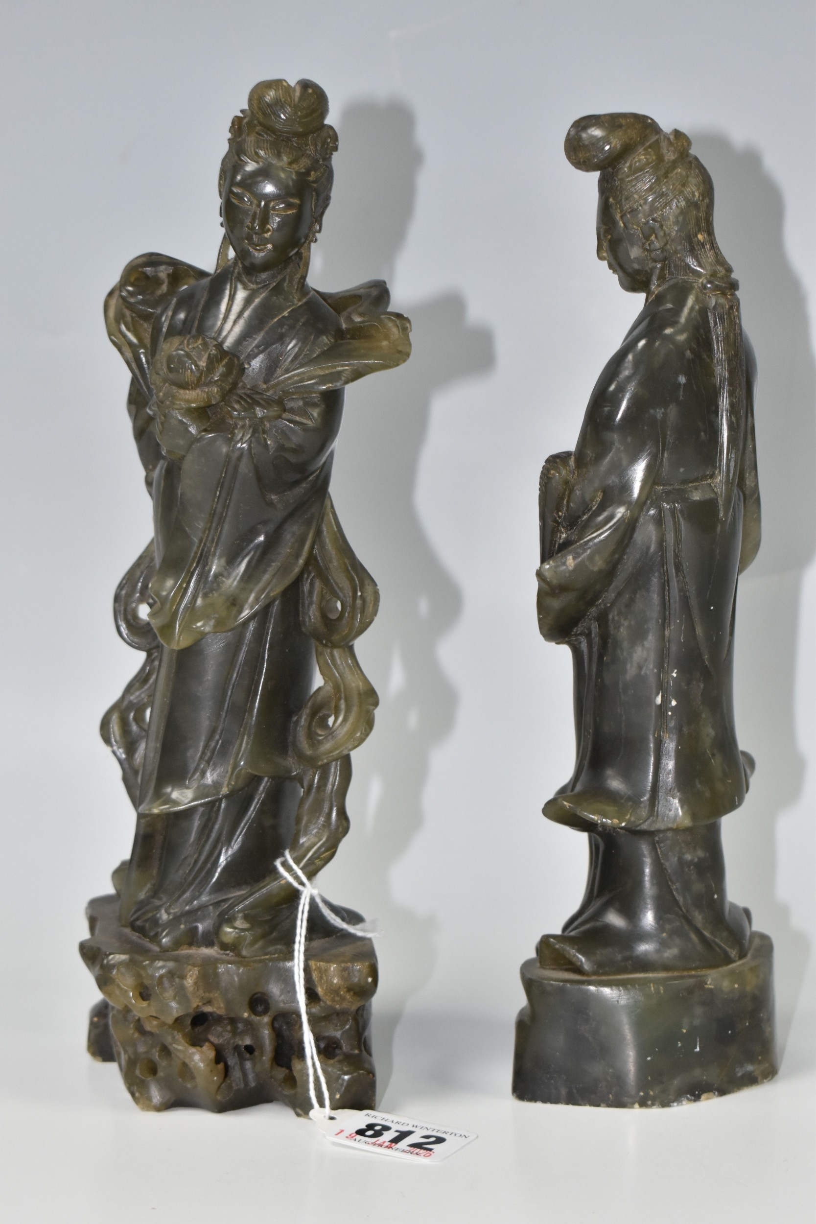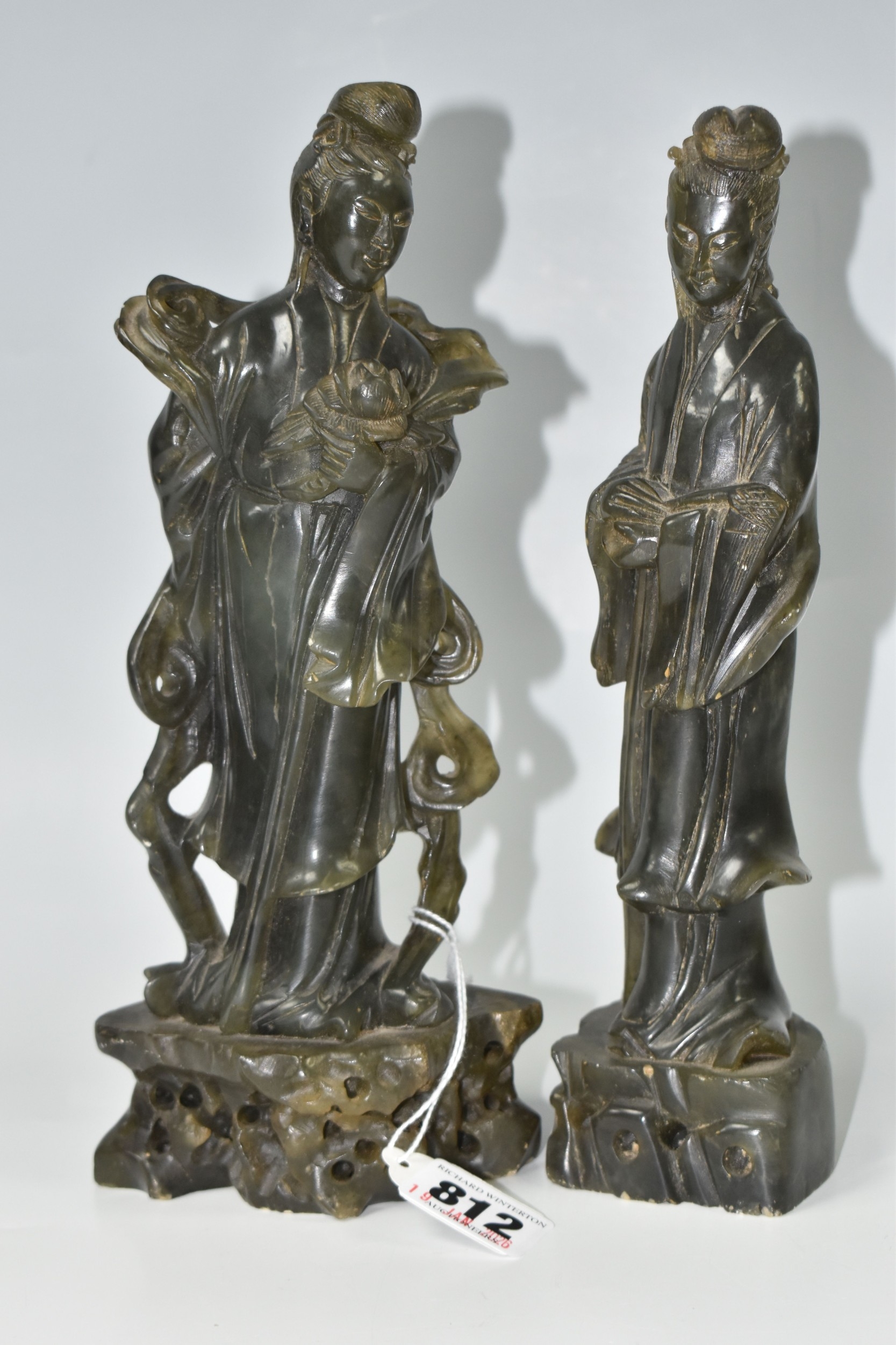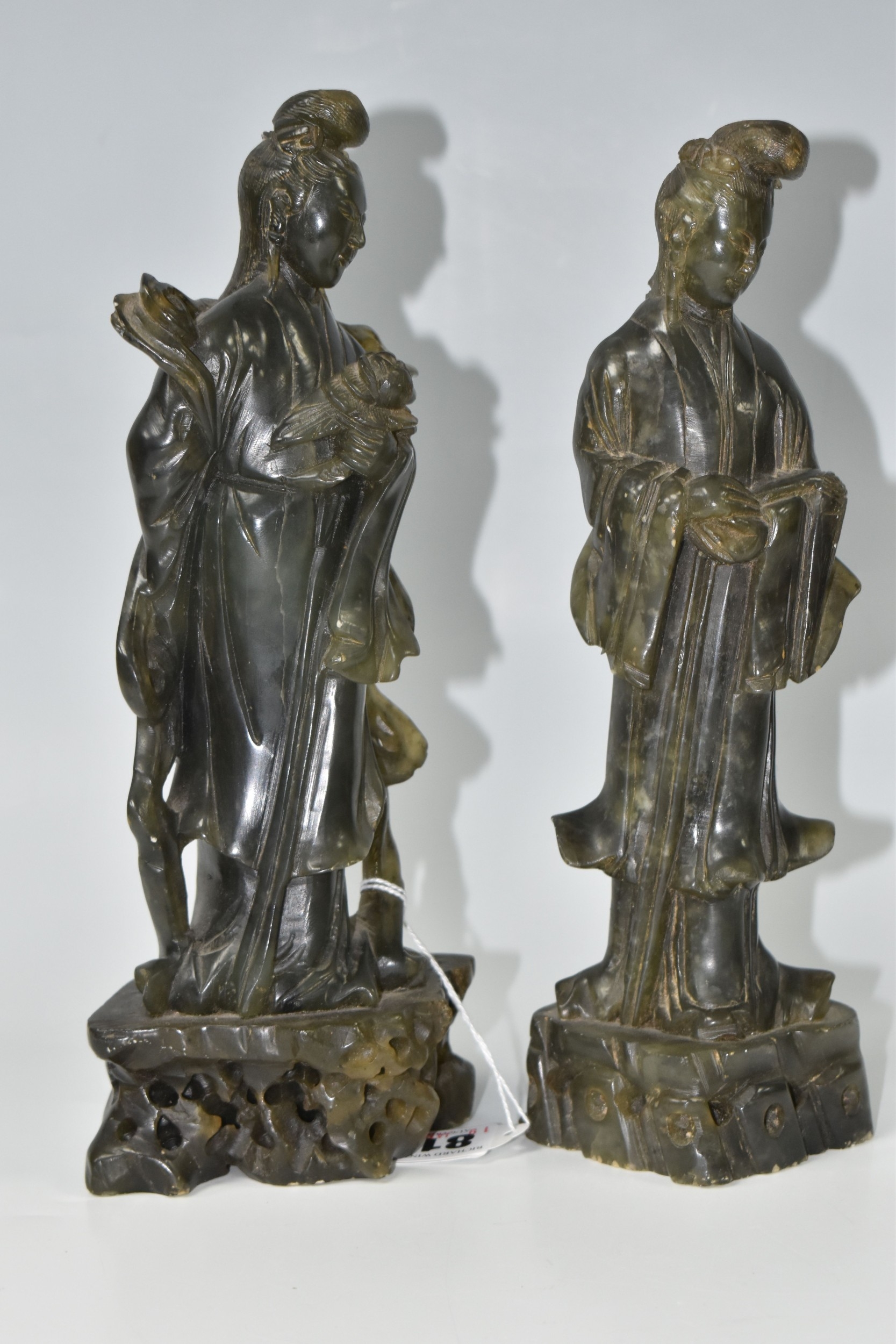TWO CHINESE CARVED NEPHRITE FIGURES possibly depicting He Xiangu comprising a sculpture of the figure carrying a fly whisk height 24.5cm, and a figure holding a lotus flower height 25.5cm, both with integrated decorative pierced bases (2) (Condition Report: nibbles in places, flecks of white paint)