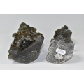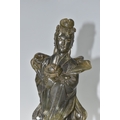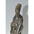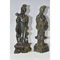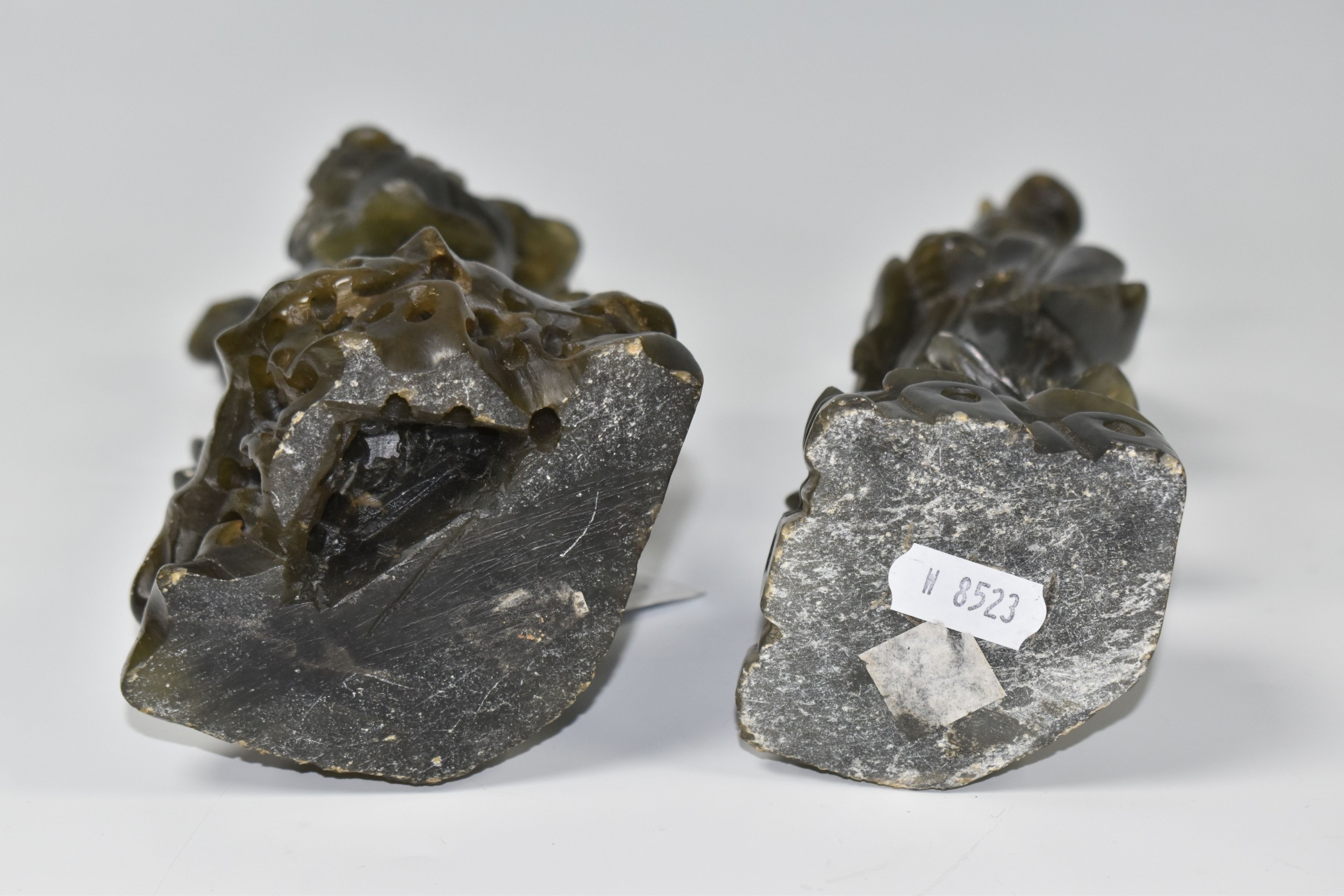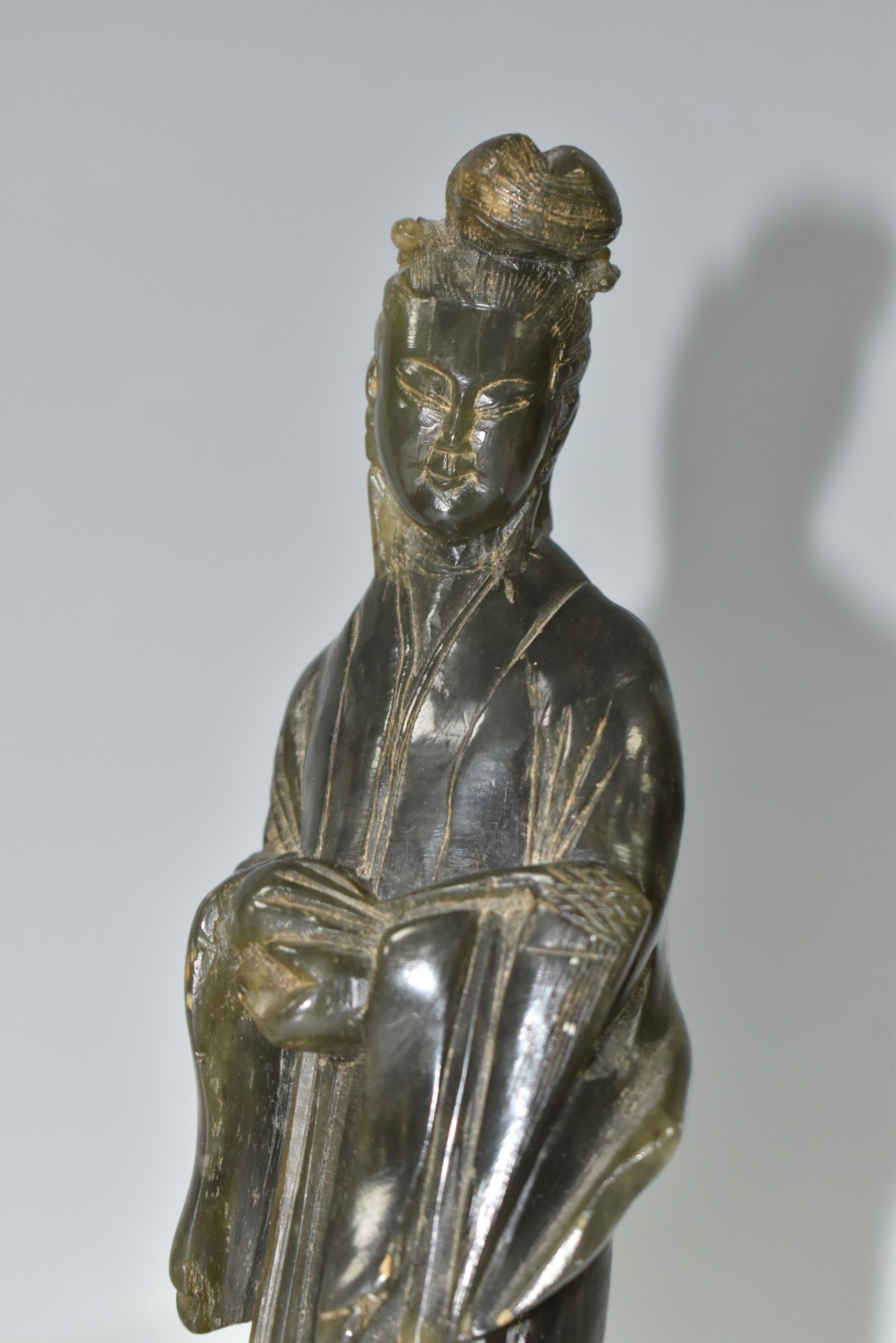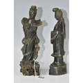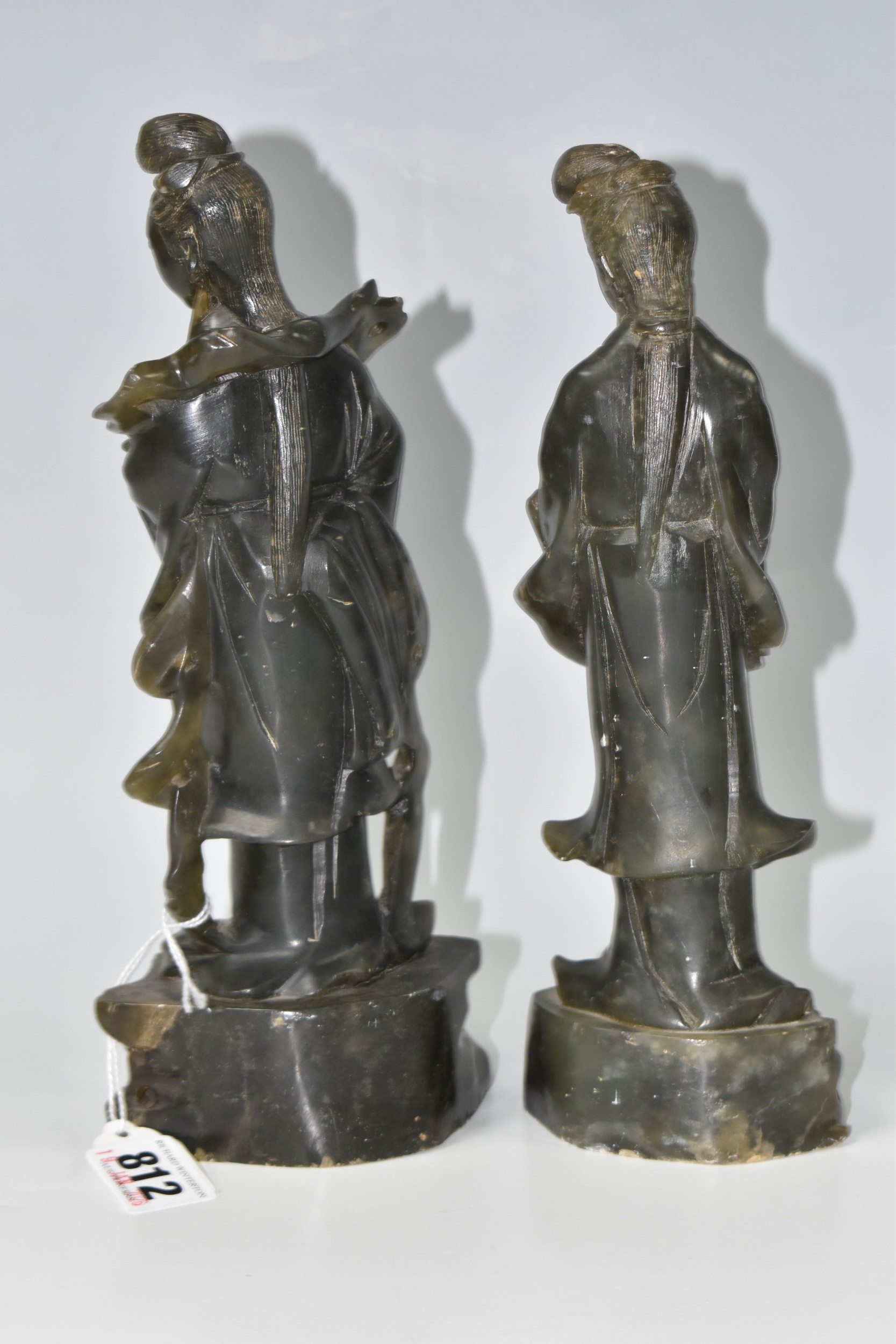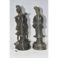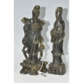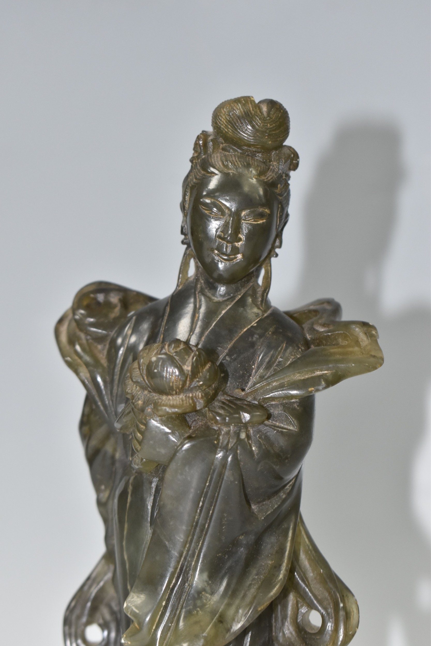 TWO CHINESE CARVED NEPHRITE FIGURES possibly depicting He Xiangu comprising a sculpture of the figure carrying a fly whisk height 24.5cm, and a figure holding a lotus flower height 25.5cm, both with integrated decorative pierced bases (2) (Condition Report: nibbles in places, flecks of white paint)