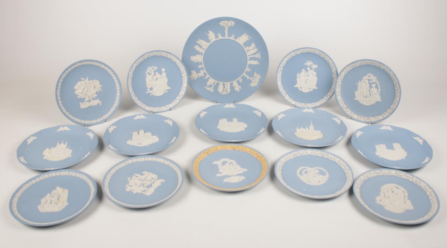 A collection of Wedgwood Jasperware plates. Valentine's Day Limited Edition 1989, 1991 'Romeo and Juliet', 1993 'Helen and Paris' examples etc