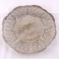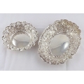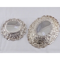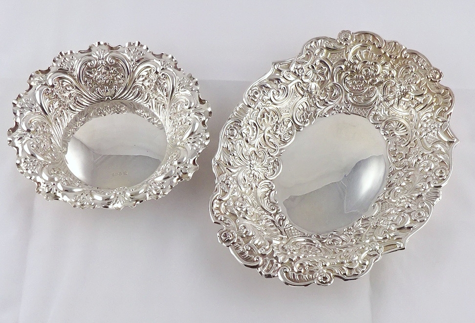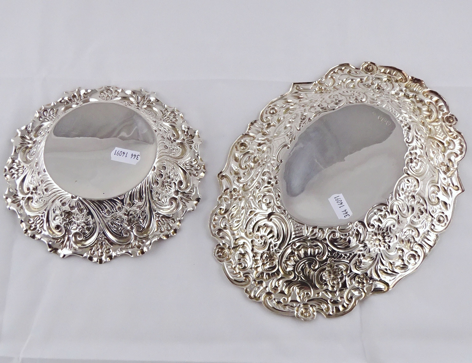 A late Victorian oval silver dish having repousse decoration; a similar circular dish. Oval dish 260mm long / 360gr (by instruction of the family of Dame Fanny Waterman)
