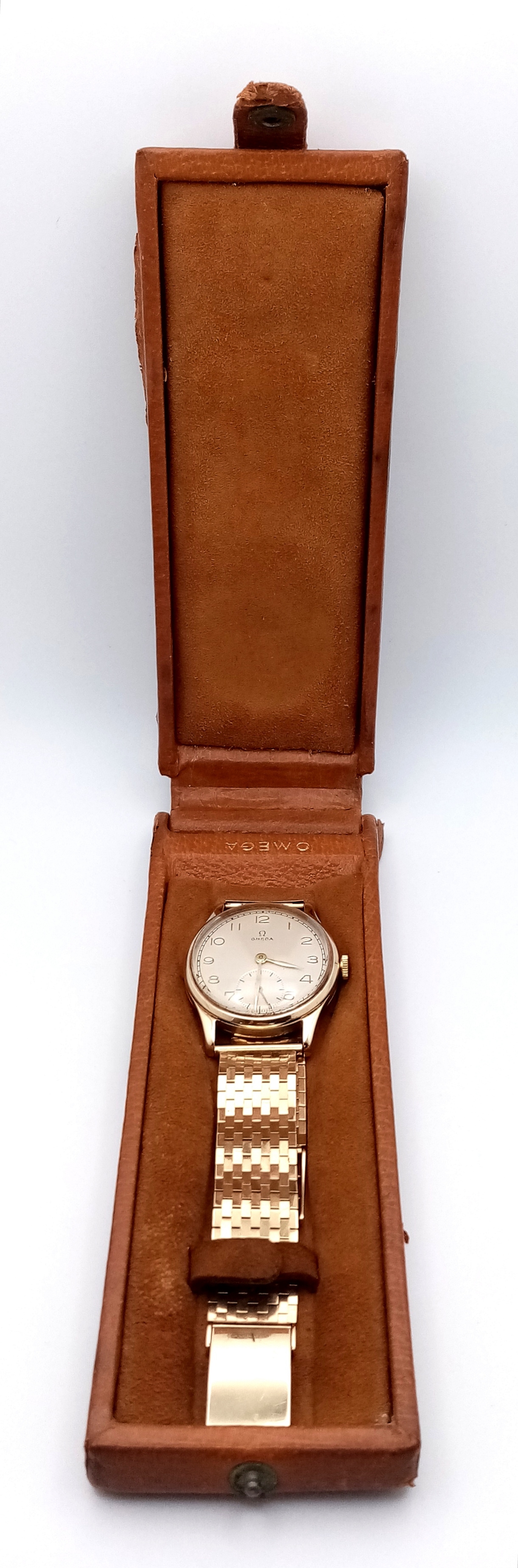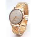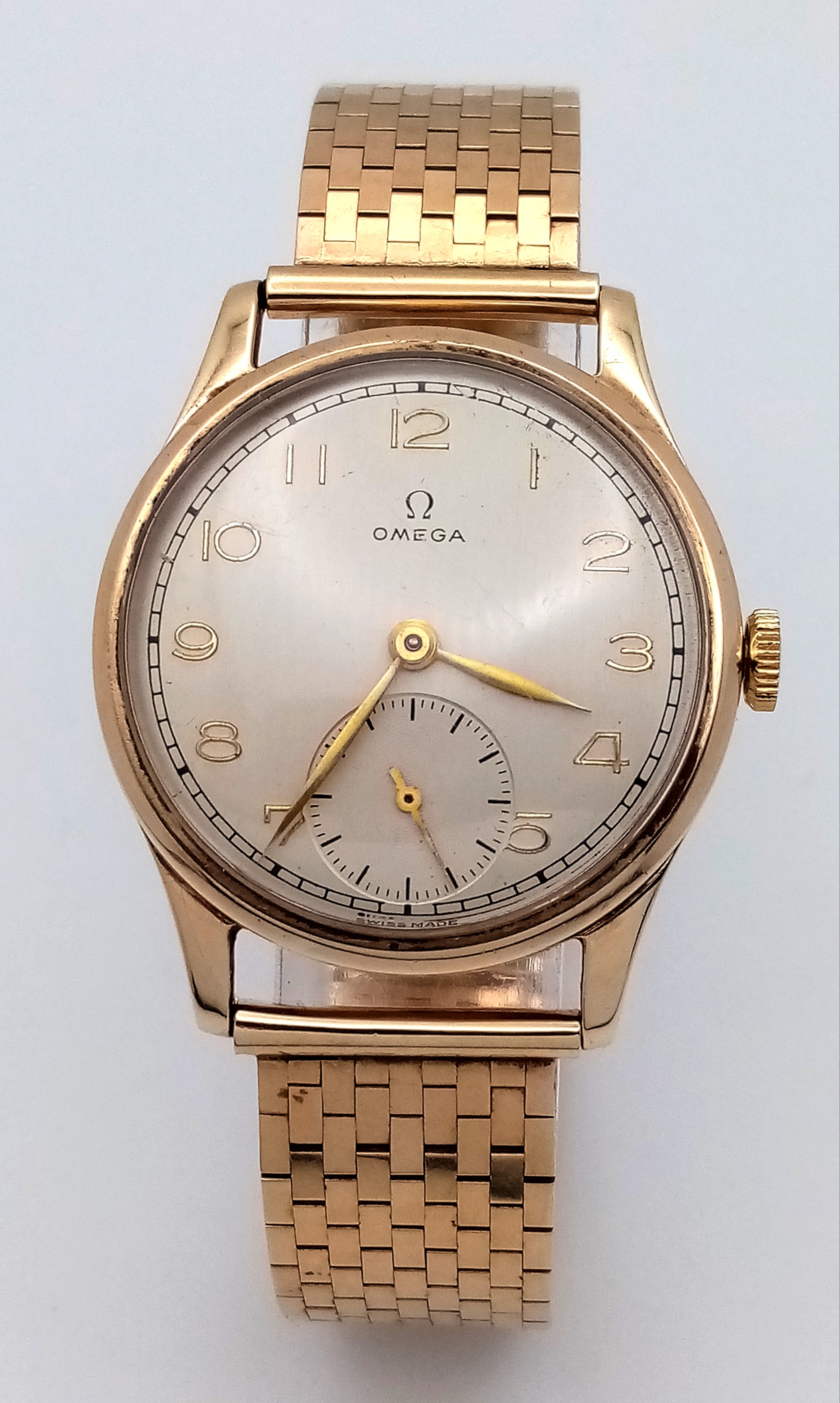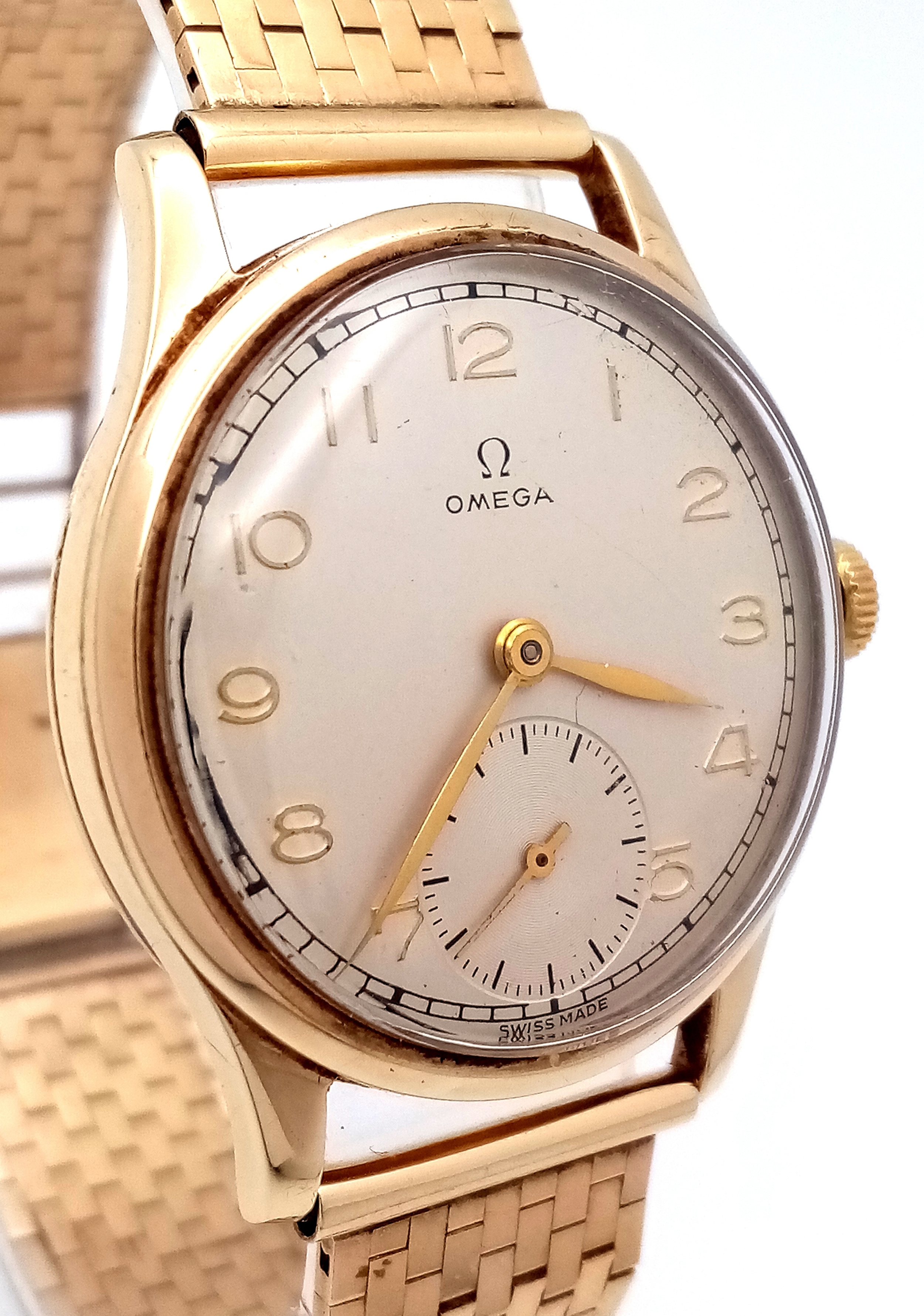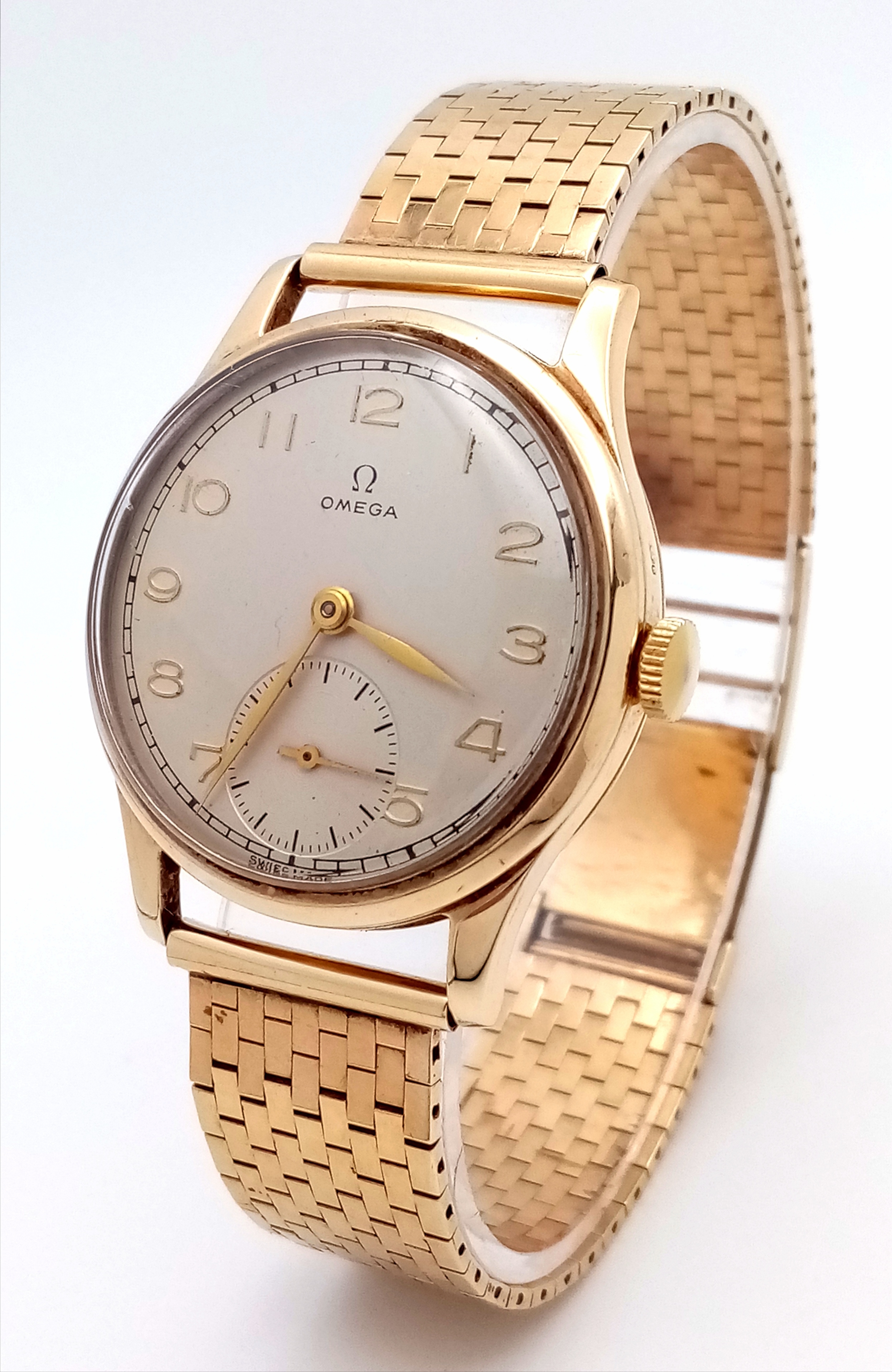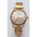 A Vintage Omega 9K Gold Gents Dress Watch. 9k gold bracelet and case - 34mm. Cream dial with second sub dial. Mechanical hand wind movement. Recently serviced, in full working order. In wonderful condition for its age. Comes with an Omega case. 59.7g total weight.
