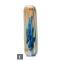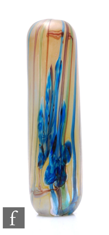 Elizabeth Harris - Isle of Wight - A contemporary studio cased glass Iridaceae (The Iris) Torpedo vase, irridised pastel lemon/ochre ground, decorated with blue flowerheads on green blue and amethyst stems, with original paper label to base, unsigned, height 31cm.