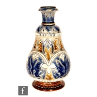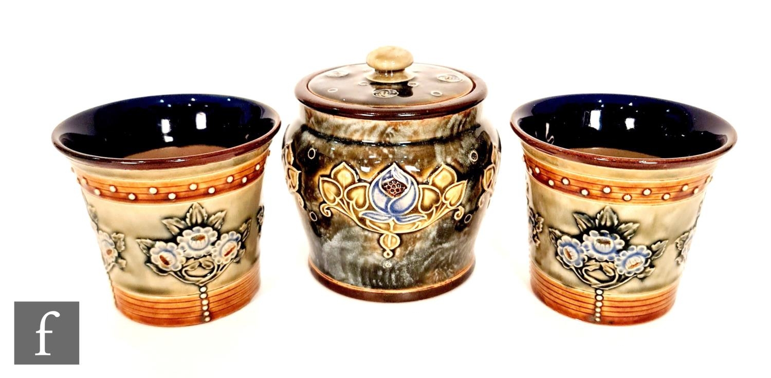Royal Doulton - An early 20th Century jar and cover decorated in the Art Nouveau style with tubelined flowers and foliage against a mottled green ground, impressed marks, height 12cm, together with a pair of Royal Doulton fern pots each with sprays of flowers, height 9cm. (3)