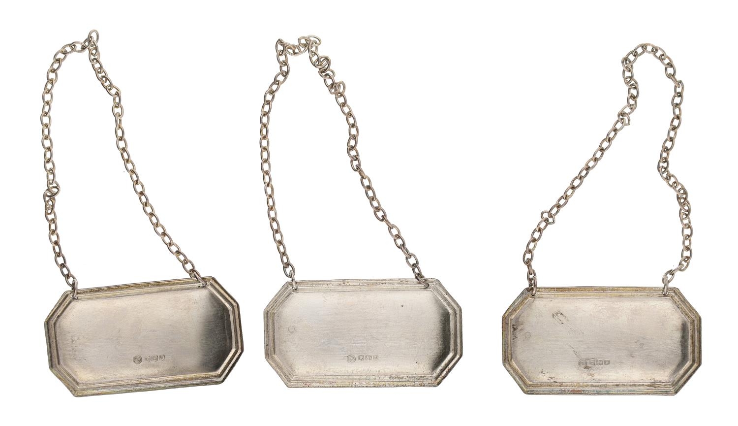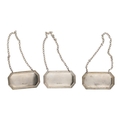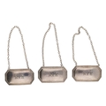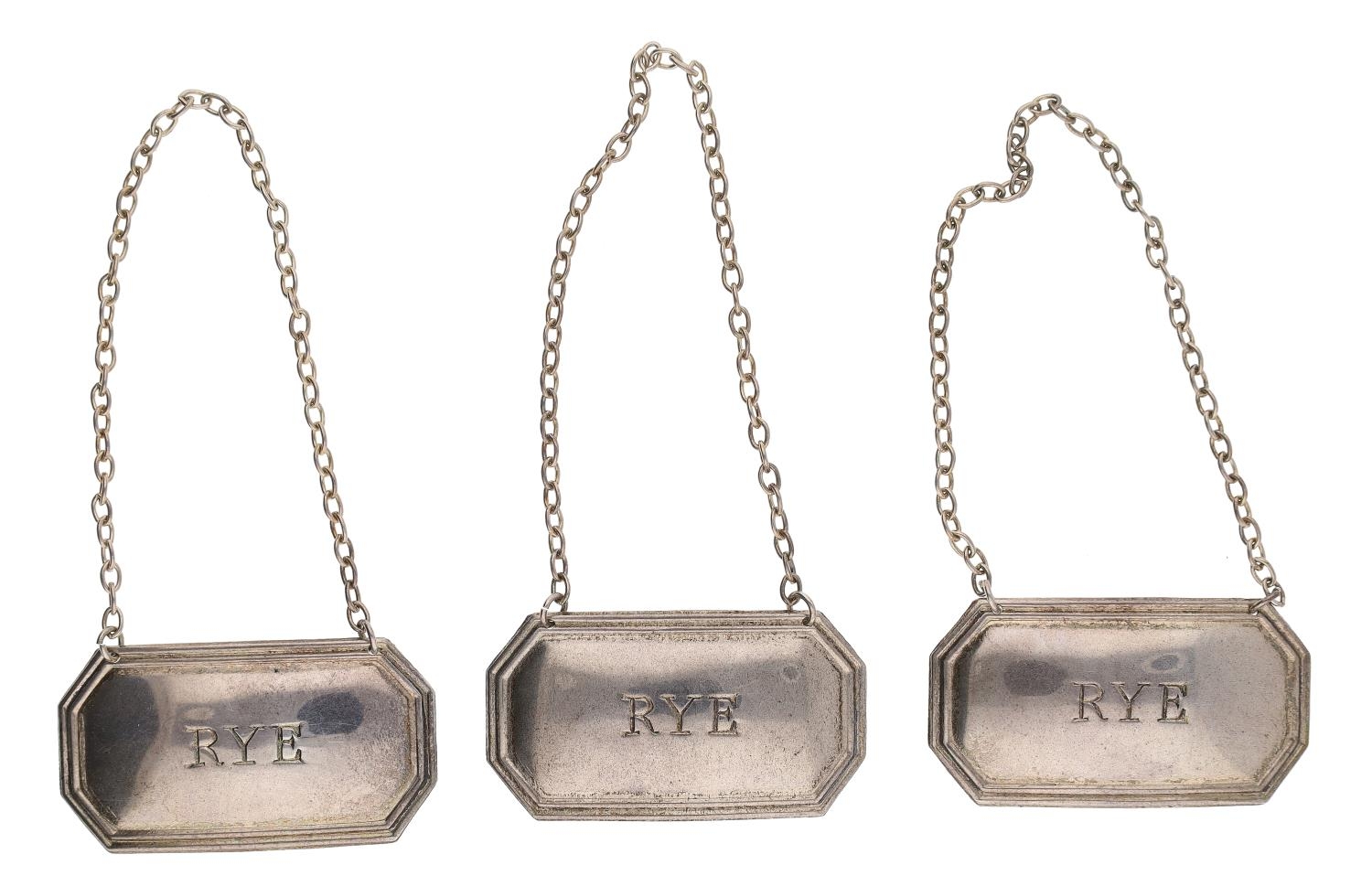 Three Francis Howard Ltd. silver Rye bottle labels, all hallmarked Sheffield 1974, 2" wide, 28gm total (3)