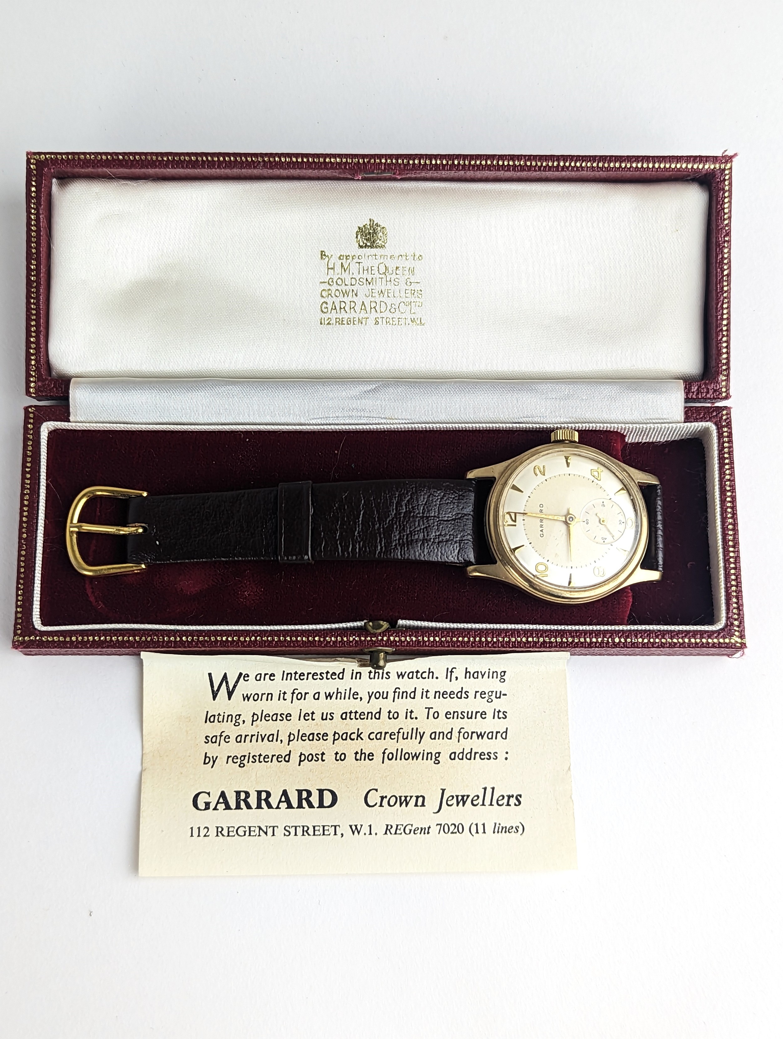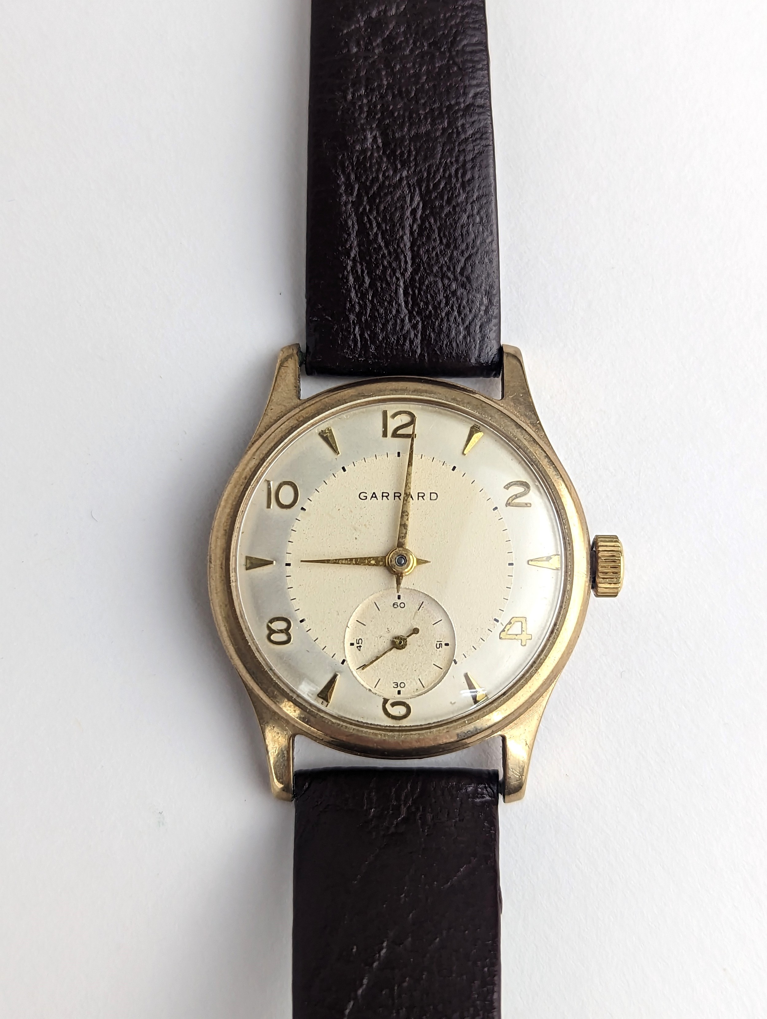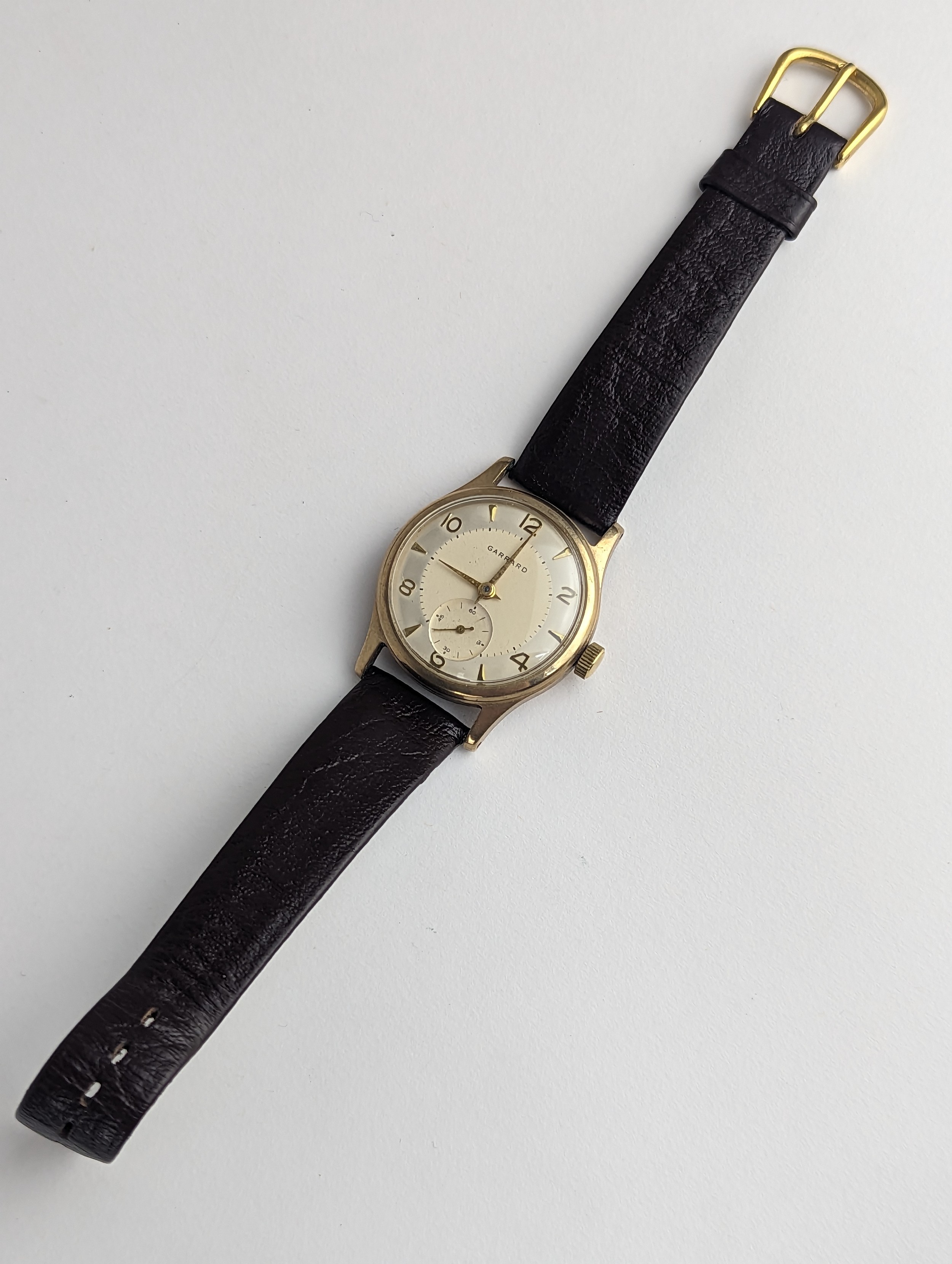 A Garrard gents 9ct gold cased manual wind wristwatch, having a silvered dial with Arabic numerals, subsidiary seconds and gilt applied hands, the 18 jewels movement unsigned, case back numbered 22277 and engraved reverse, on a later brown leather strap, with fitted Garrard box, 33.5mm