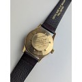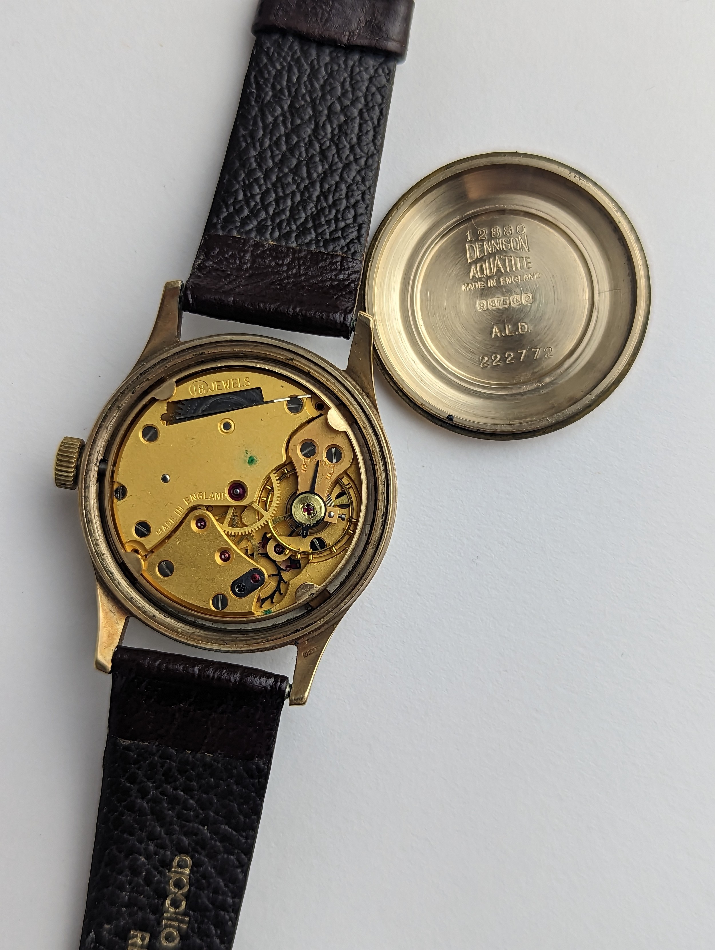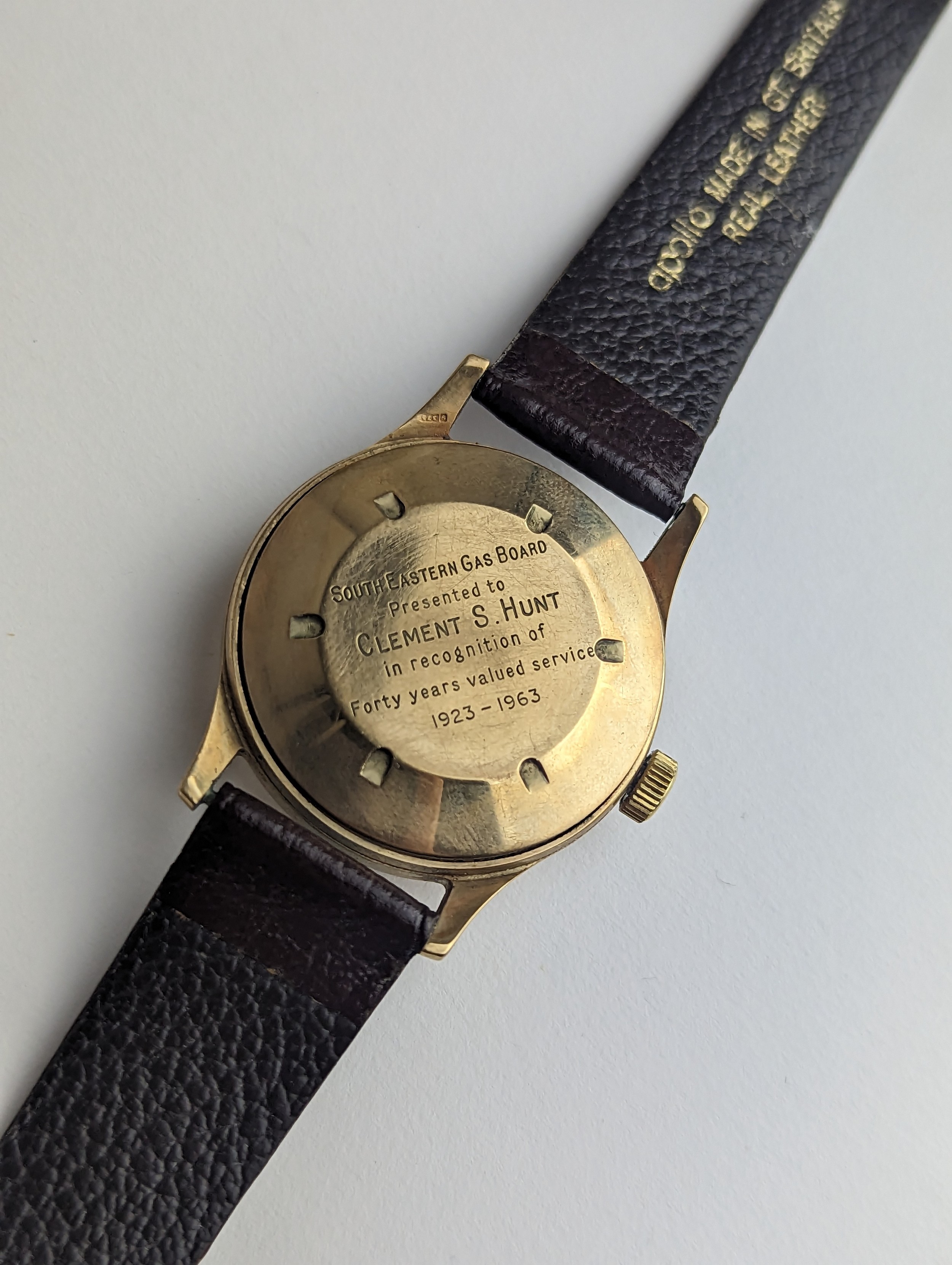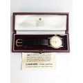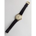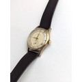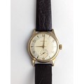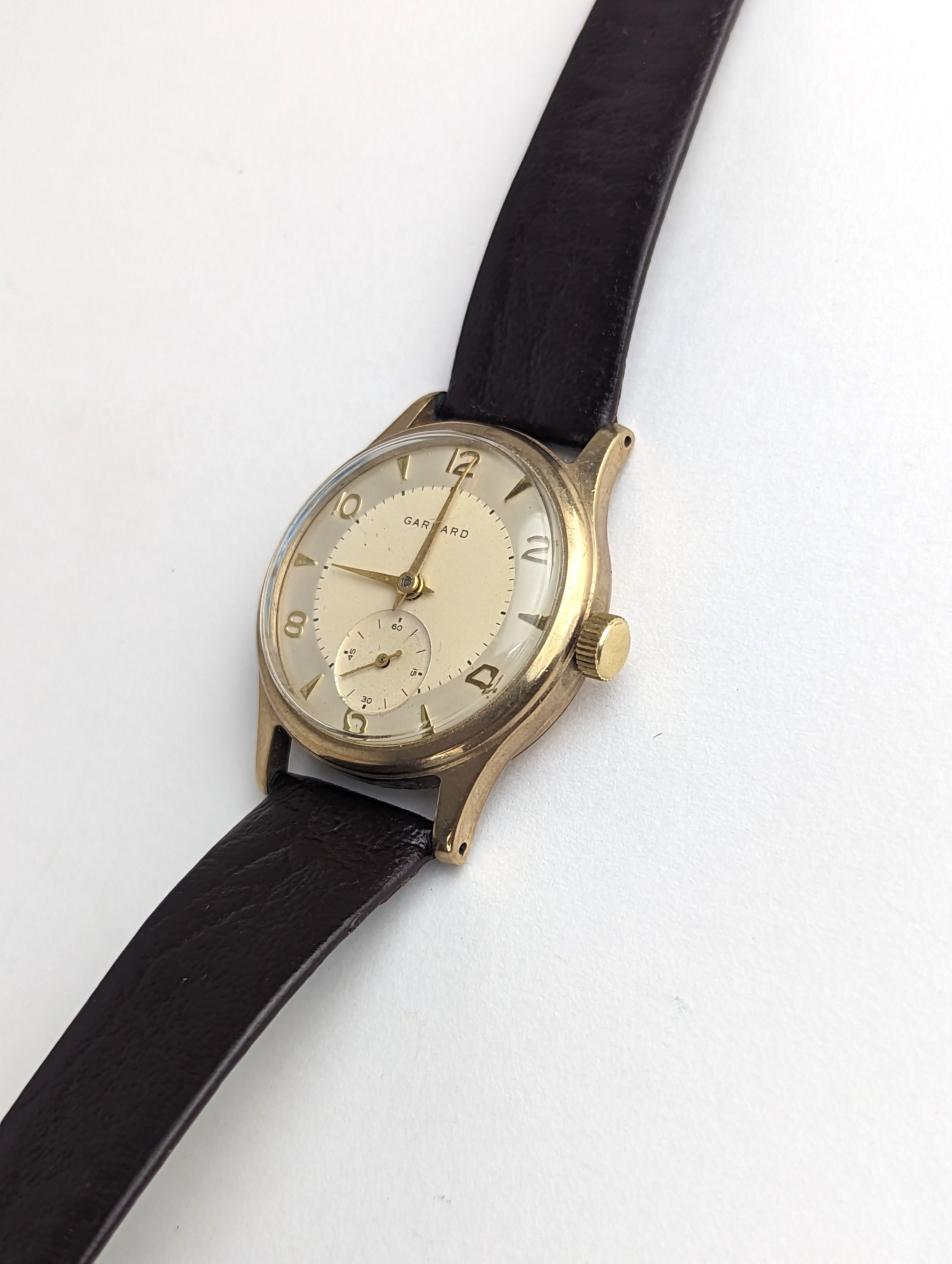 A Garrard gents 9ct gold cased manual wind wristwatch, having a silvered dial with Arabic numerals, subsidiary seconds and gilt applied hands, the 18 jewels movement unsigned, case back numbered 22277 and engraved reverse, on a later brown leather strap, with fitted Garrard box, 33.5mm