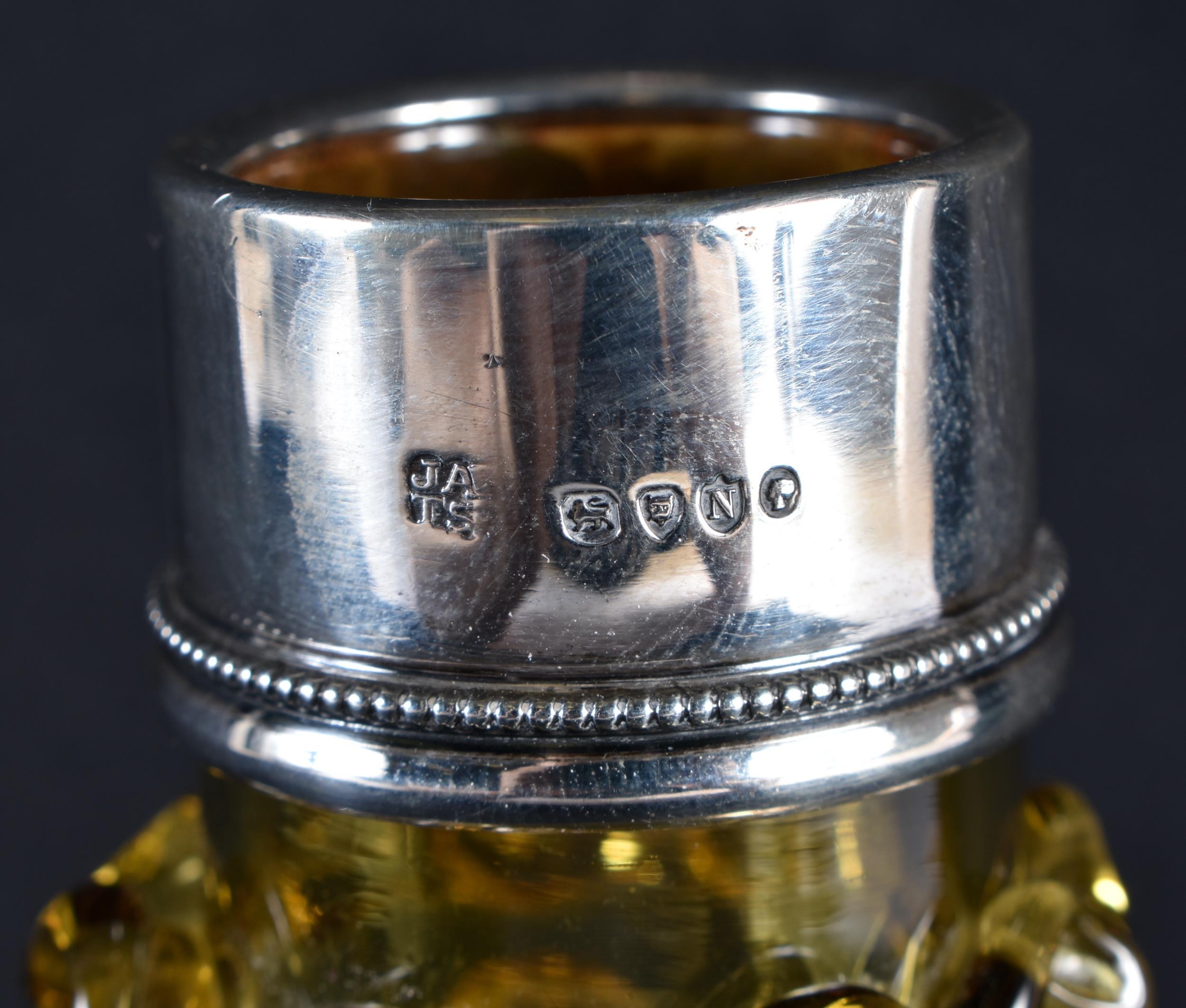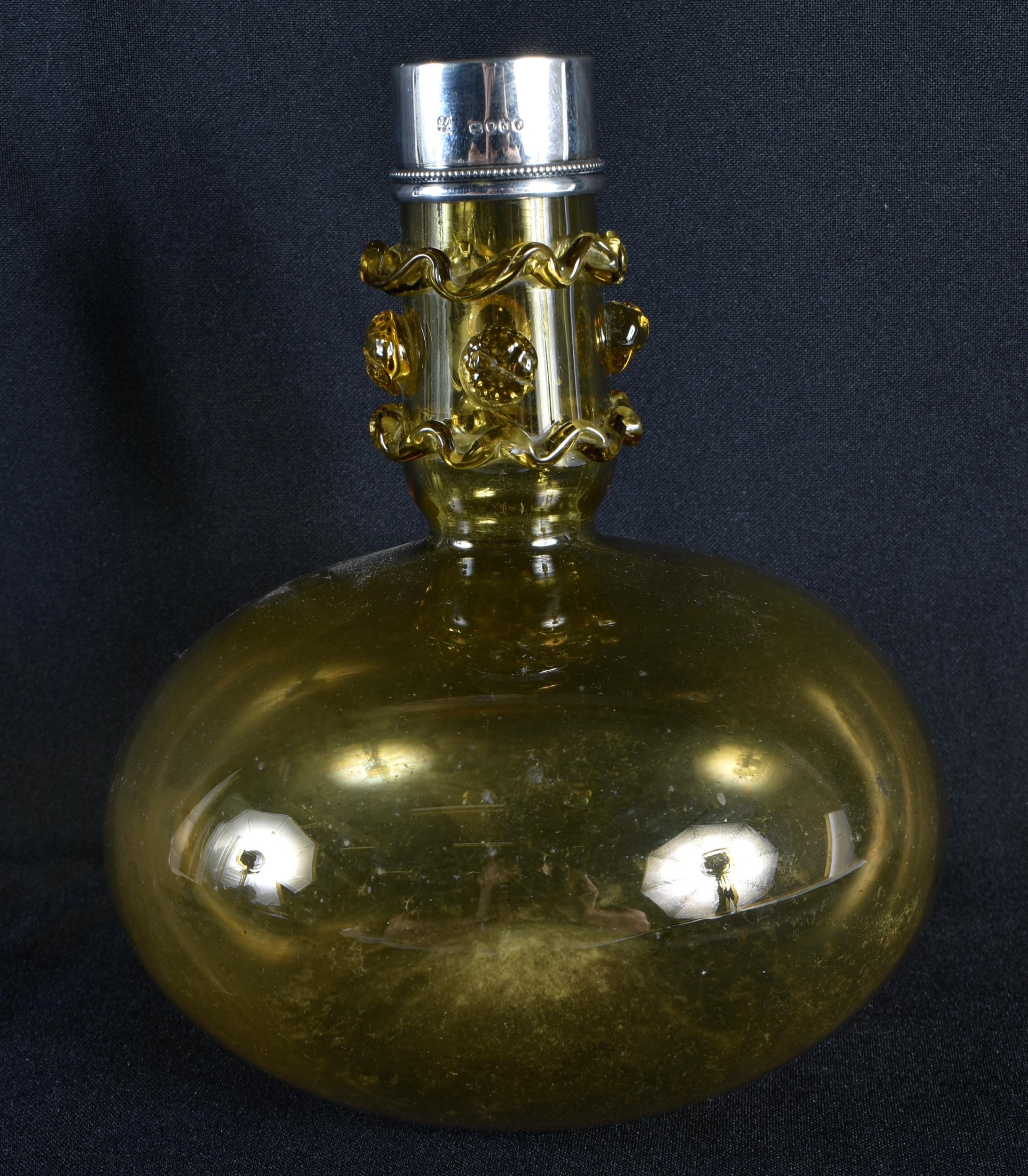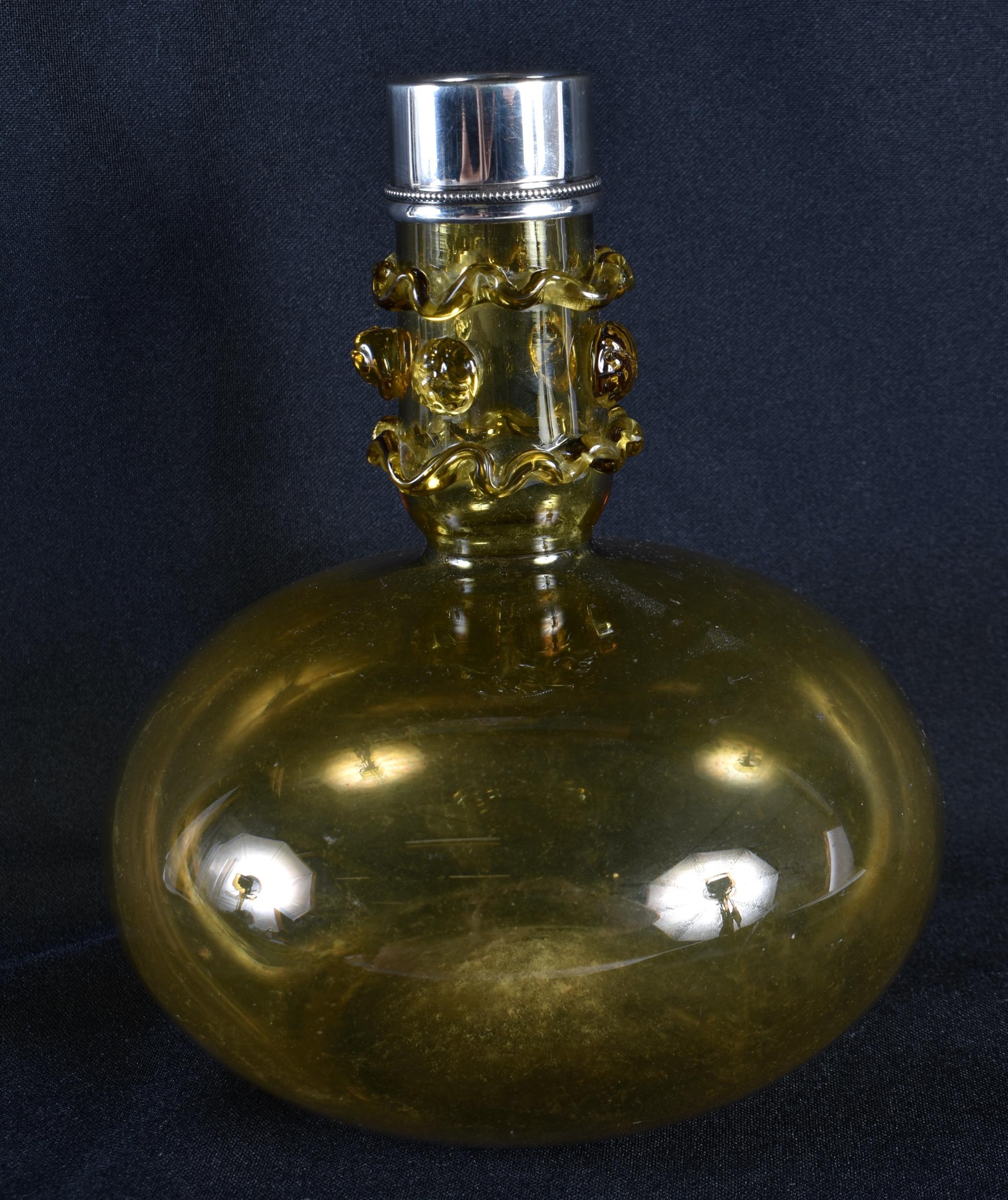 A VICTORIAN SILVER MOUNTED SMOKEY AMBER GLASS DECANTER. 18 cm x 14 cm.