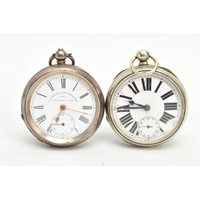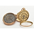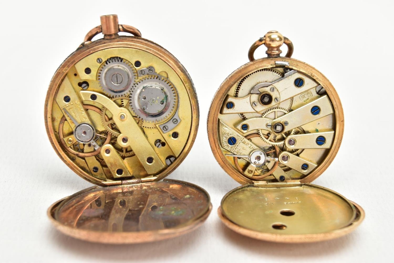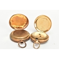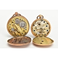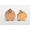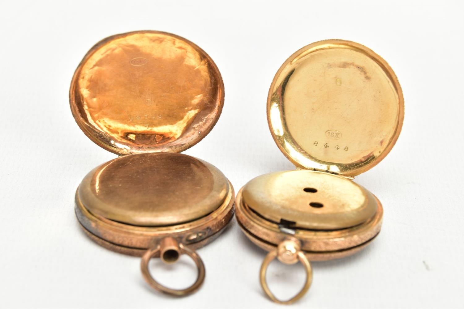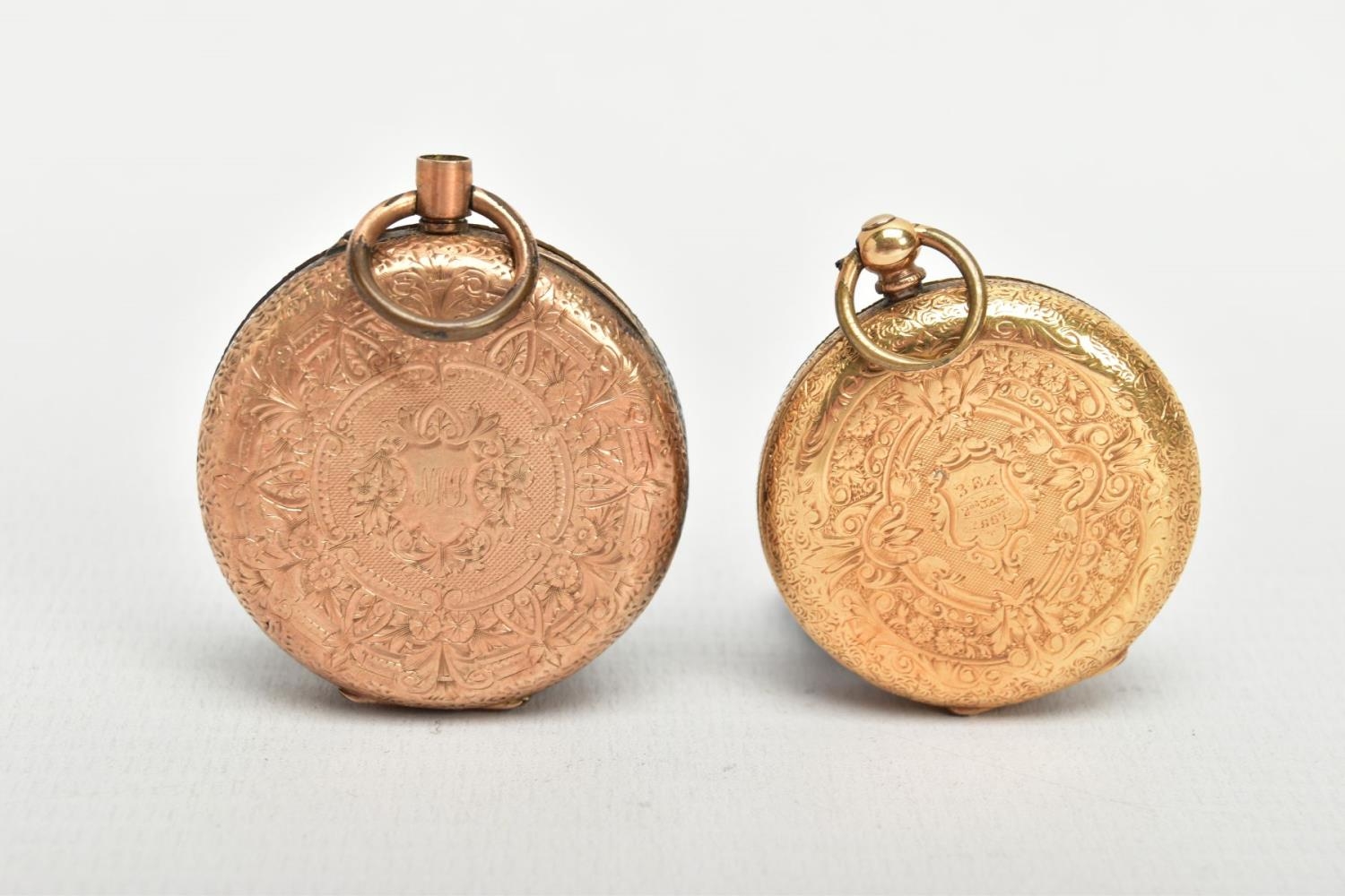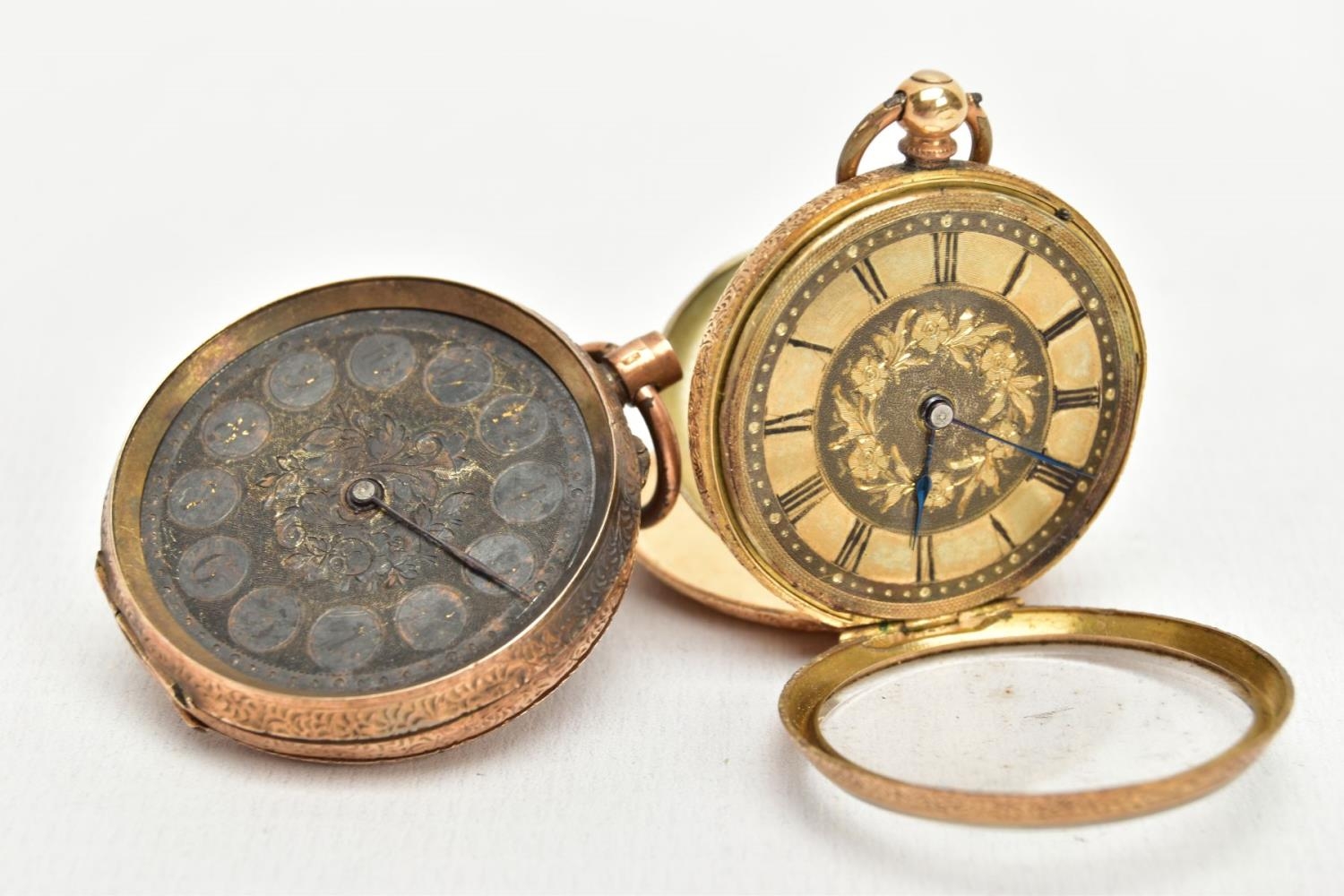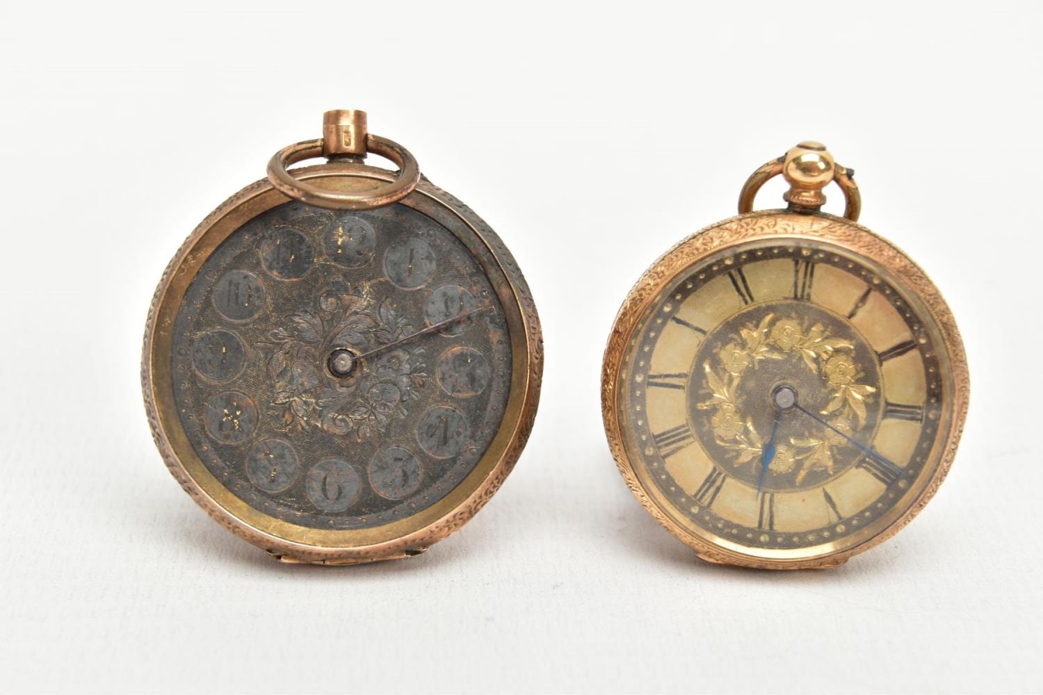 TWO YELLOW METAL LADIES POCKET WATCHES, hand wound movement, yellow tone dial with floral detailing, Roman numerals, a yellow metal case with floral engraving with an engraved cartouche, approximate width 32mm, inside case back signed 8448, stamped 18k with a Swiss control mark, approximate gross weight including movement 25 grams, hand wound movement, discoloured dial, Arabic numberals, a yellow metal case with floral engraving and engraved cartouche, approximate width 36mm, inside case back signed 94708 7, stamped 14k with a Swiss control mark, approximate gross weight including movement 32.4 grams (condition report: general moderate wear, second watch glass missing and dial discoloured, currently not running, not tested)