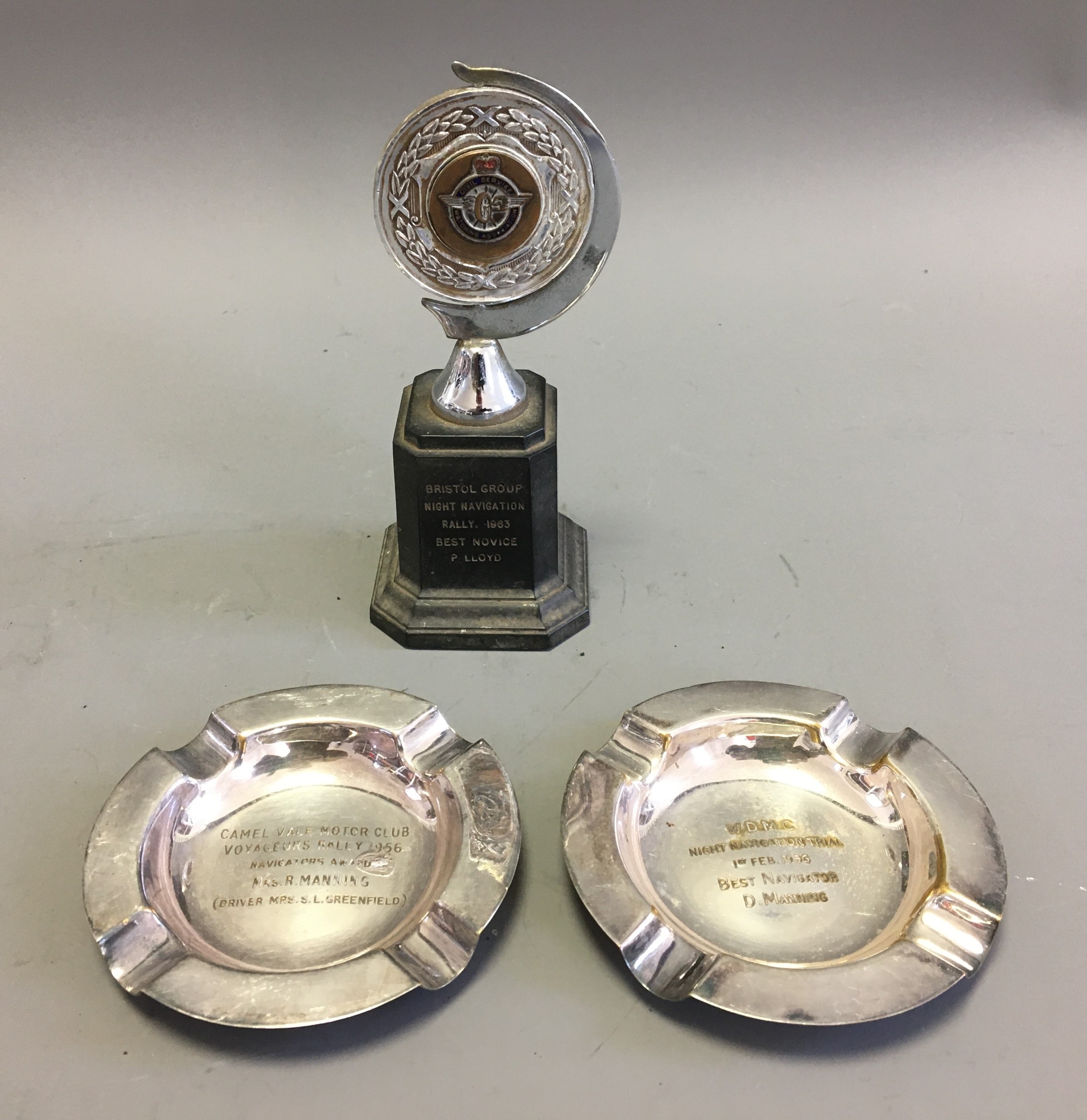 Vintage Civil Service Motoring Association Navigational Trophy and Camel Vale Motor Club 1956, W.D.M.C 1956 Silver Plated Dishes.