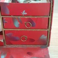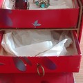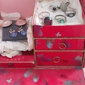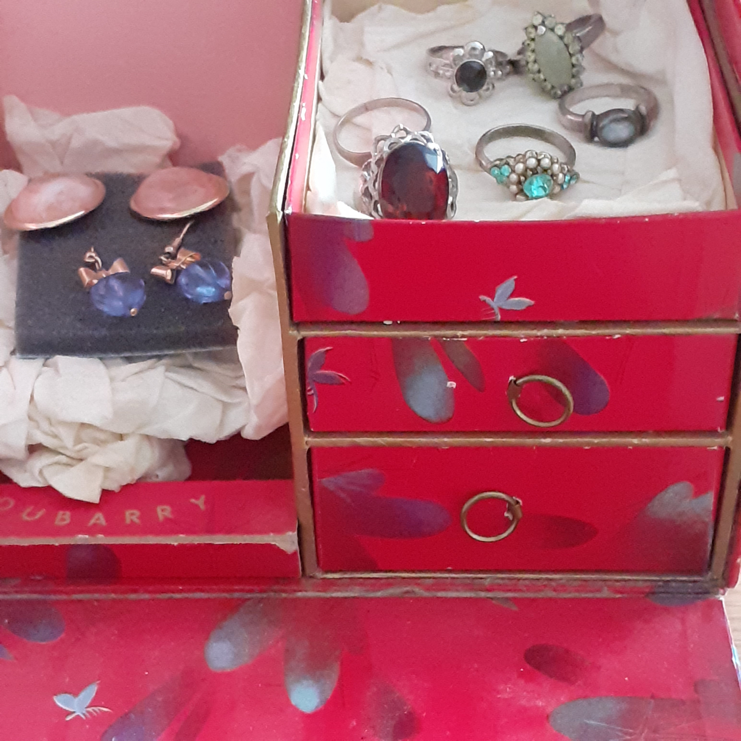 Jewellery box with various costume rings and earrings with some eye-catching stones. All complete with no damage.