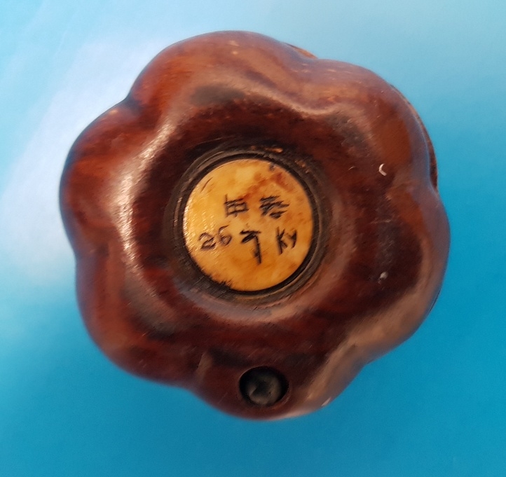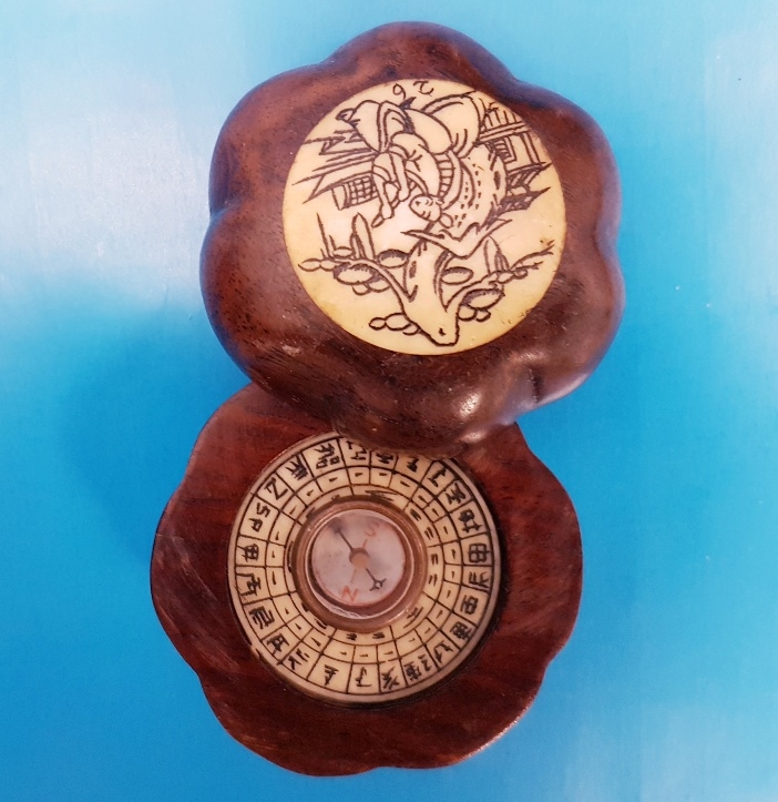 A small foldaway compass in a Chinese Design with carved bone inlay in wood