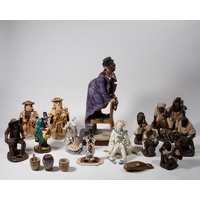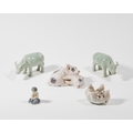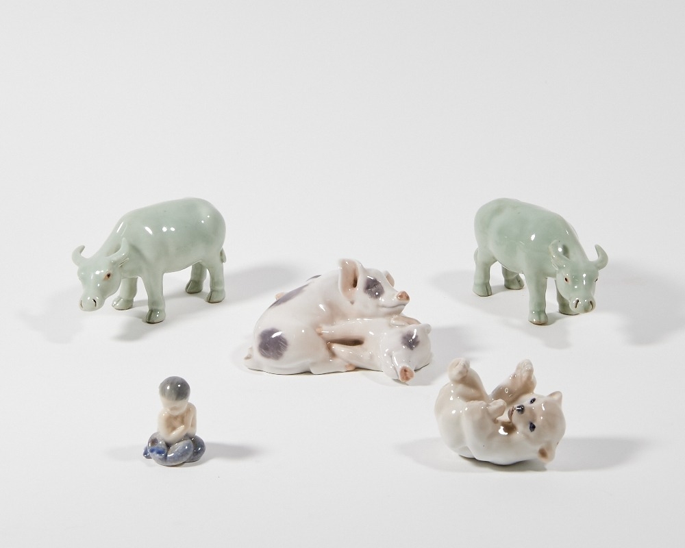 A group of ceramic figurines, 20th century, comprising: three small Royal Copenhagen figures including two pigs, no. 683, 6cm high, a polar bear cub, no. 1124, 6cm high, and a mermaid, no. 2313, 4cm high, together with two Chinese celadon water buffalo, modelled standing foursquare with heads slightly turned, each 6.6cm high (5)