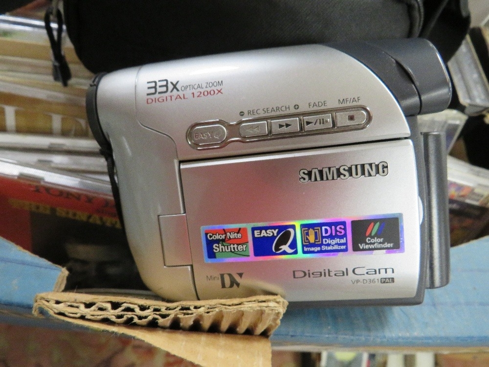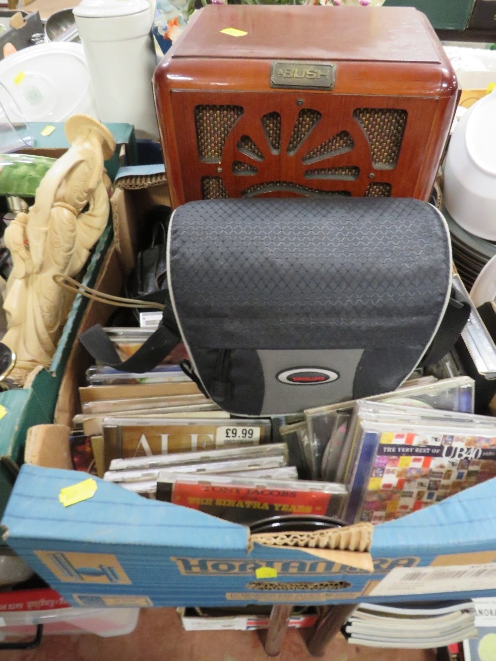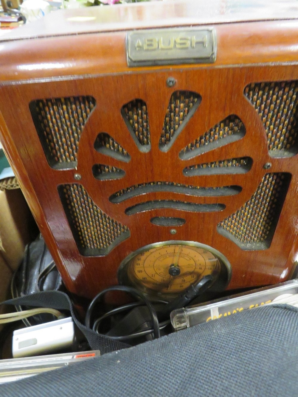 A reproduction Bush radio, Samsung digital camera, CDs etc