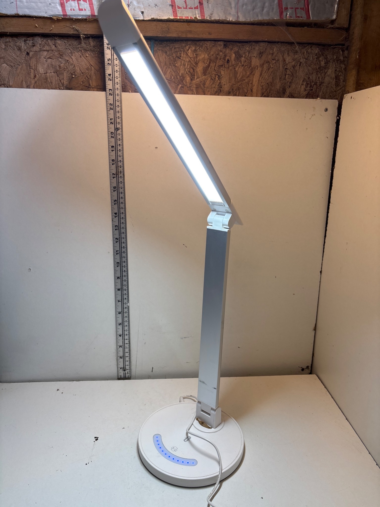 Adjustable LED desk lamp with touch controls and power cord.