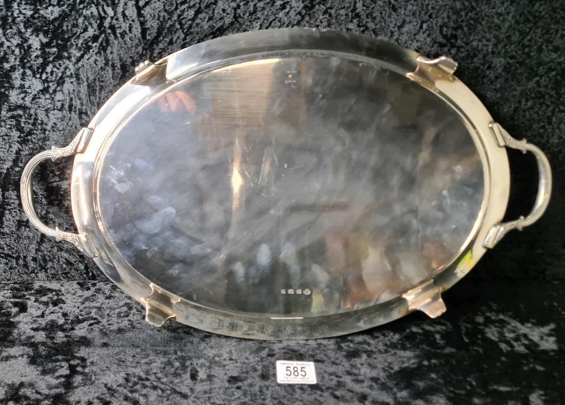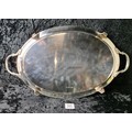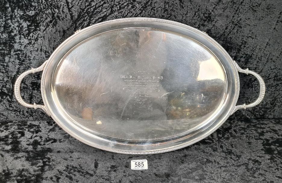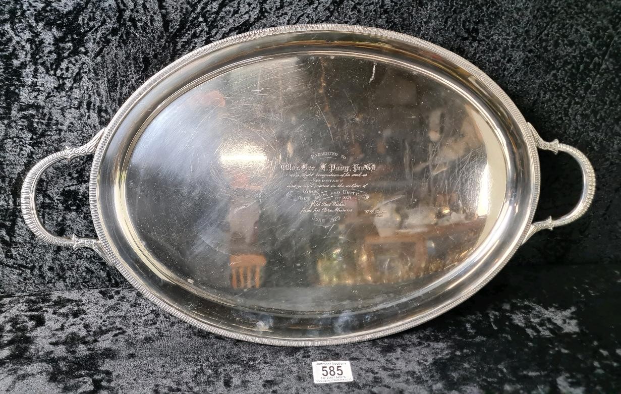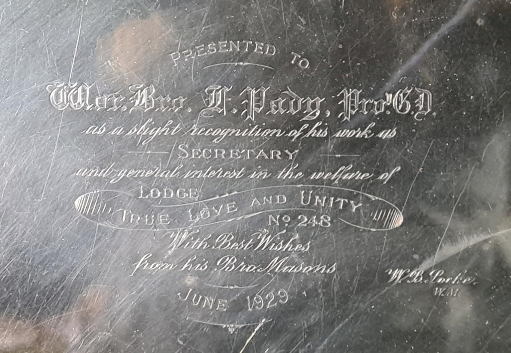 Magnificent solid silver gallery tray with Masonic dedication inscription dated 1929, William Hutton & Sons, Sheffield 1927, approx 1800g. Measures W57cm (including handles) x H33cm.