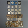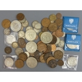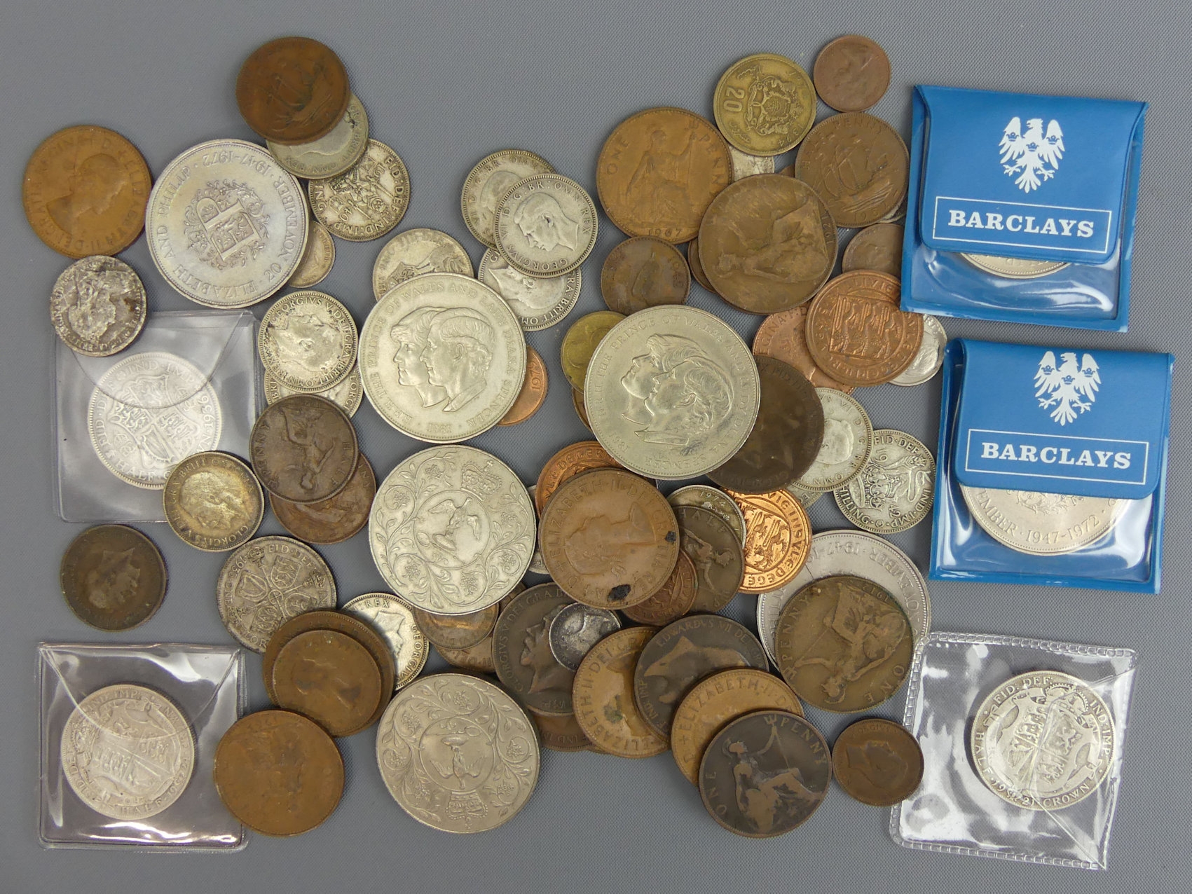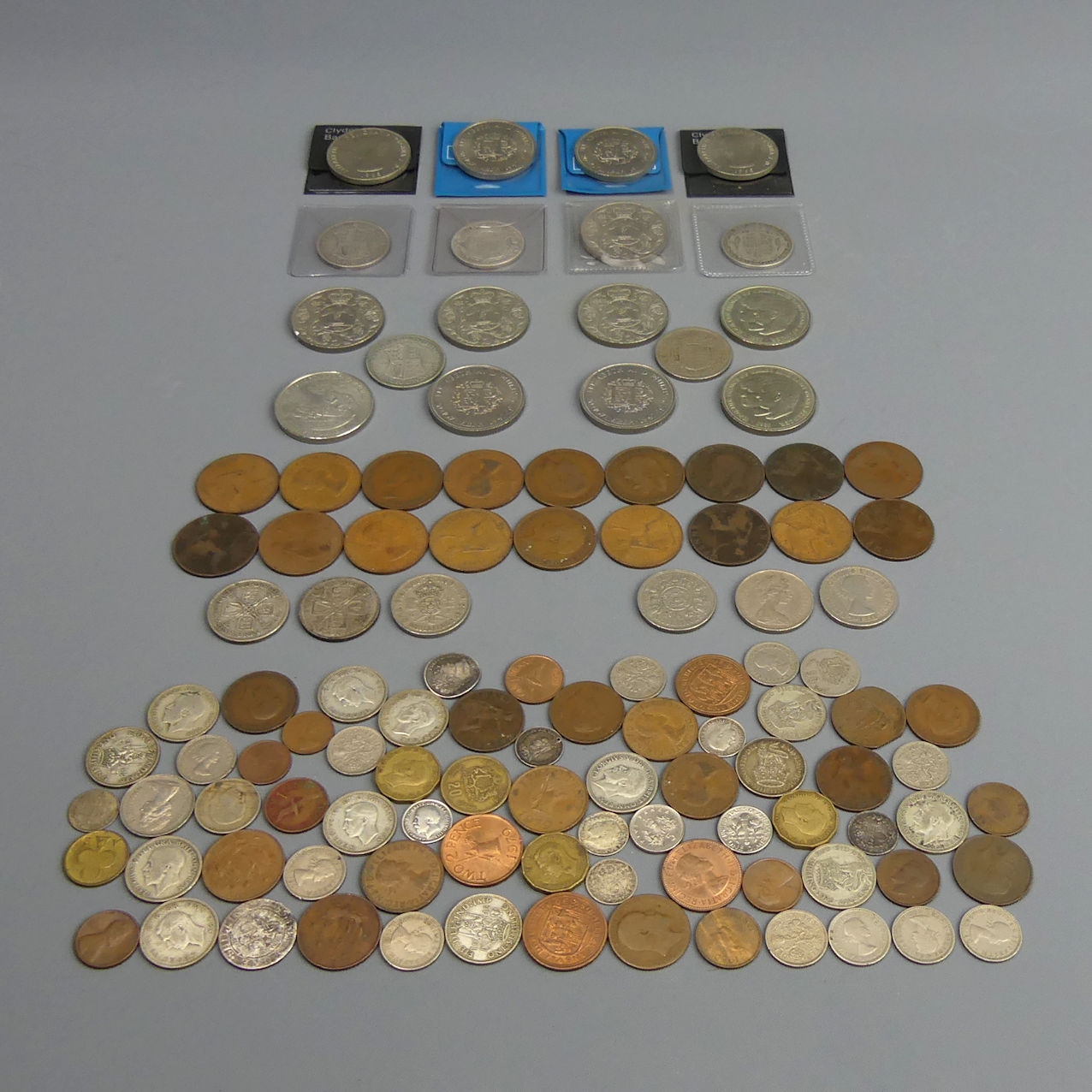 Various English coins including silver examples, crowns and pennies. UK Postage £15.