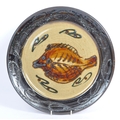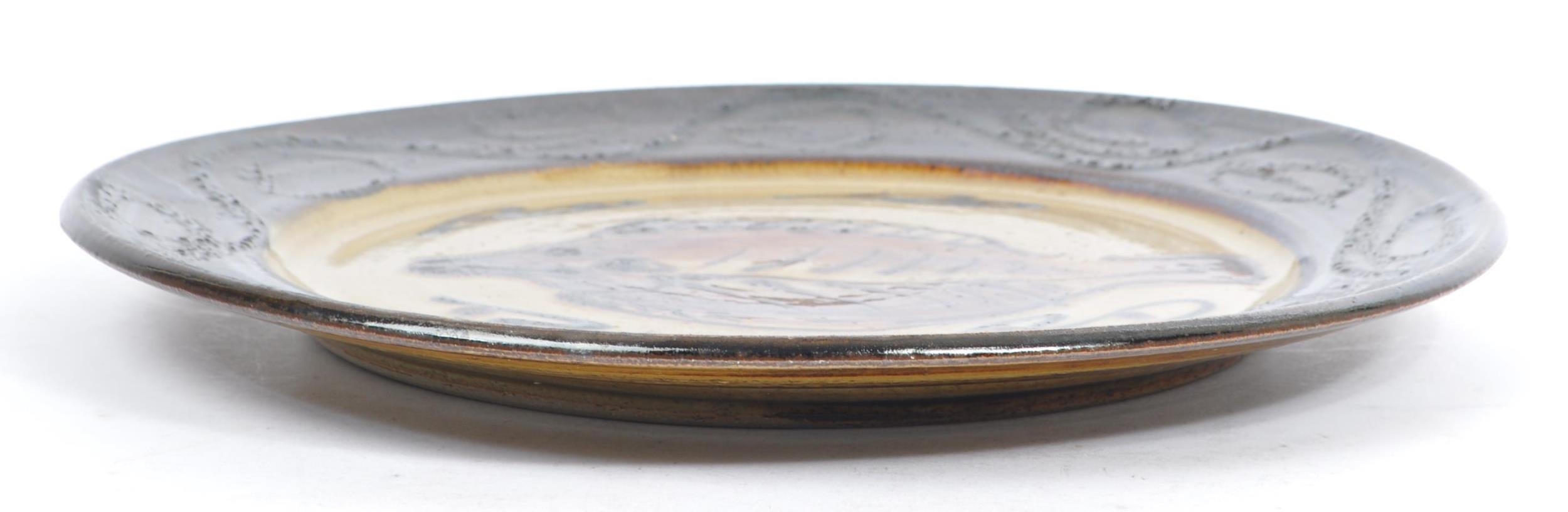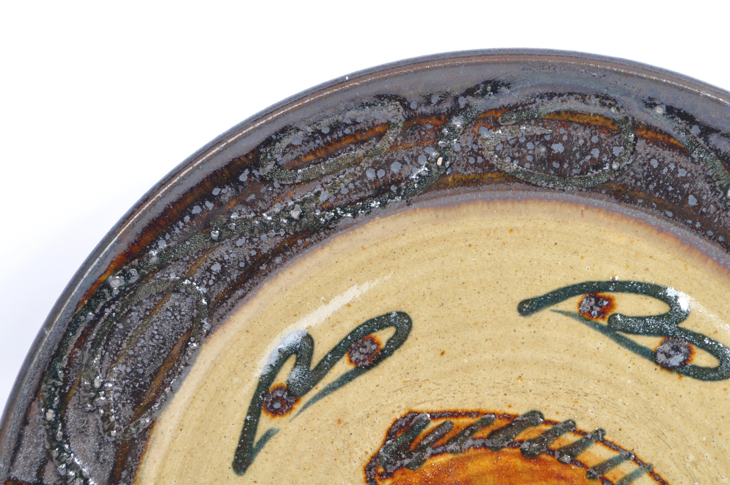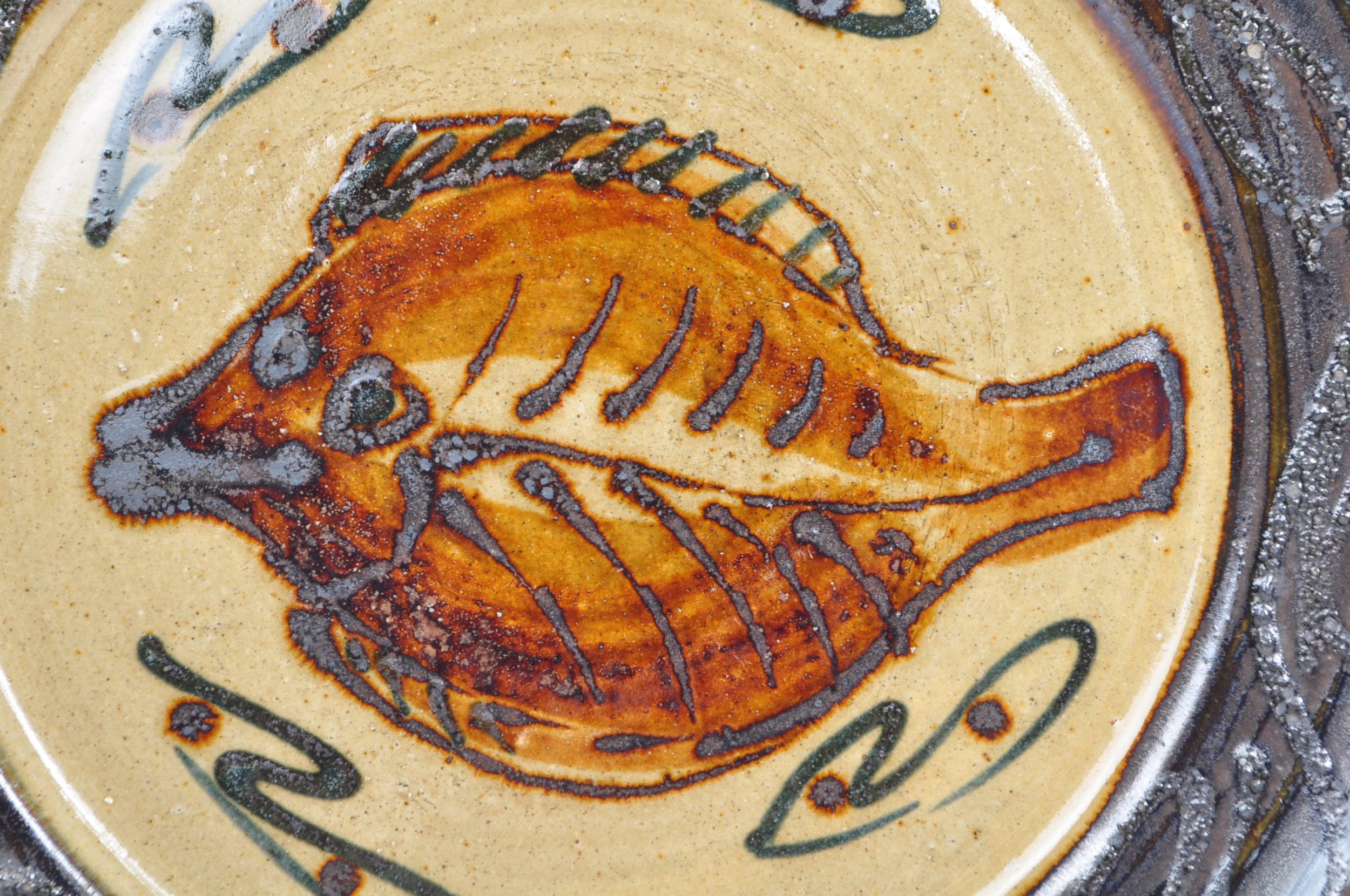 Michael Leach - A vintage mid 20th century large Michael Leach studio pottery stoneware plate charger. Of circular form with hand pained earthenware tones with fish figure to central. With impress stamps to underside ML & Y. Measures approx. 40cm