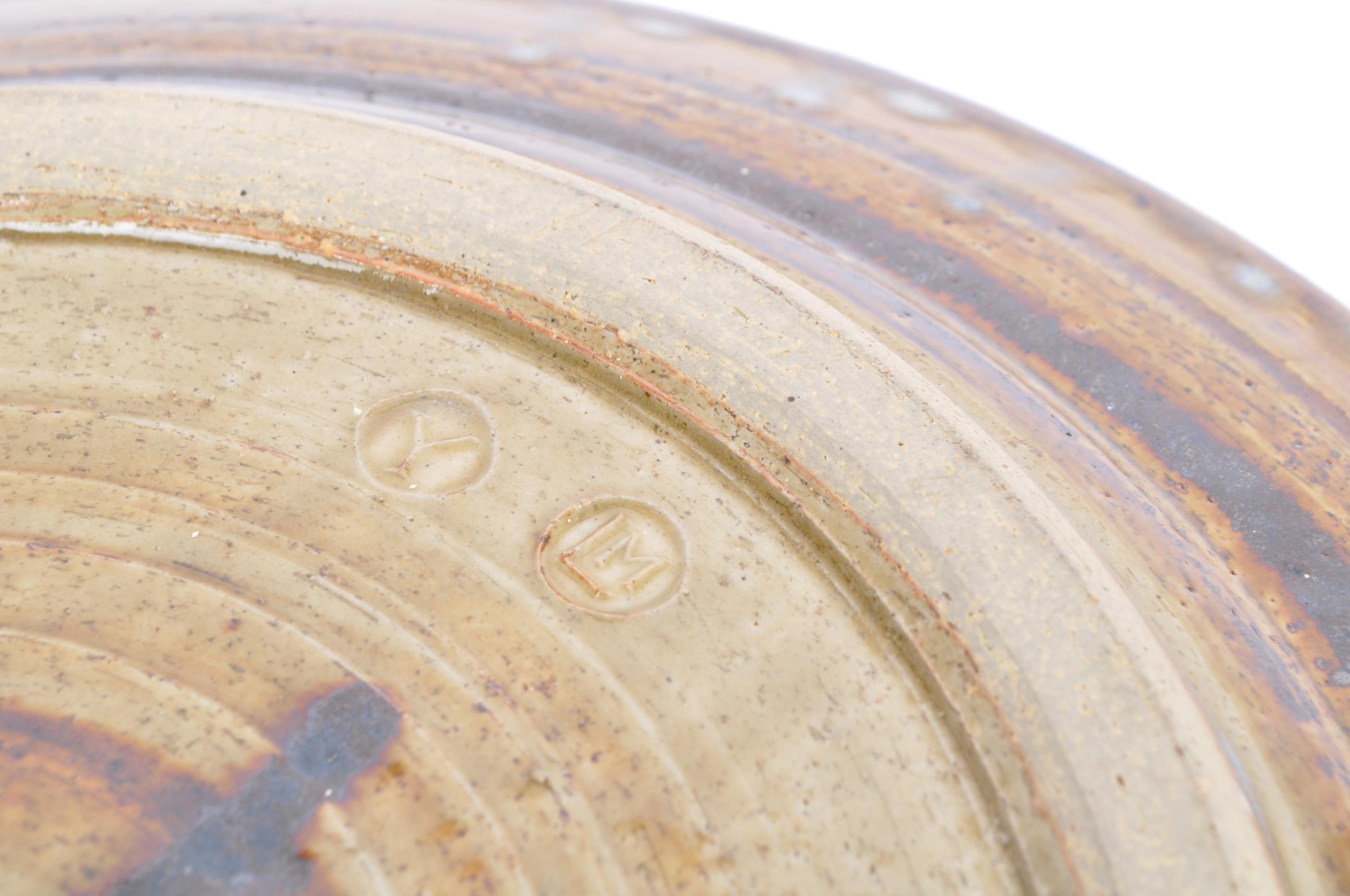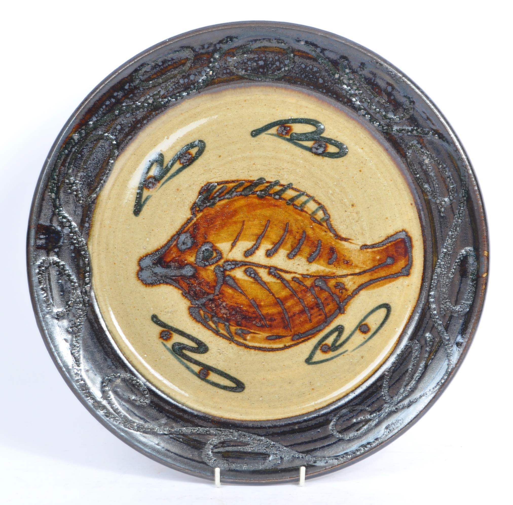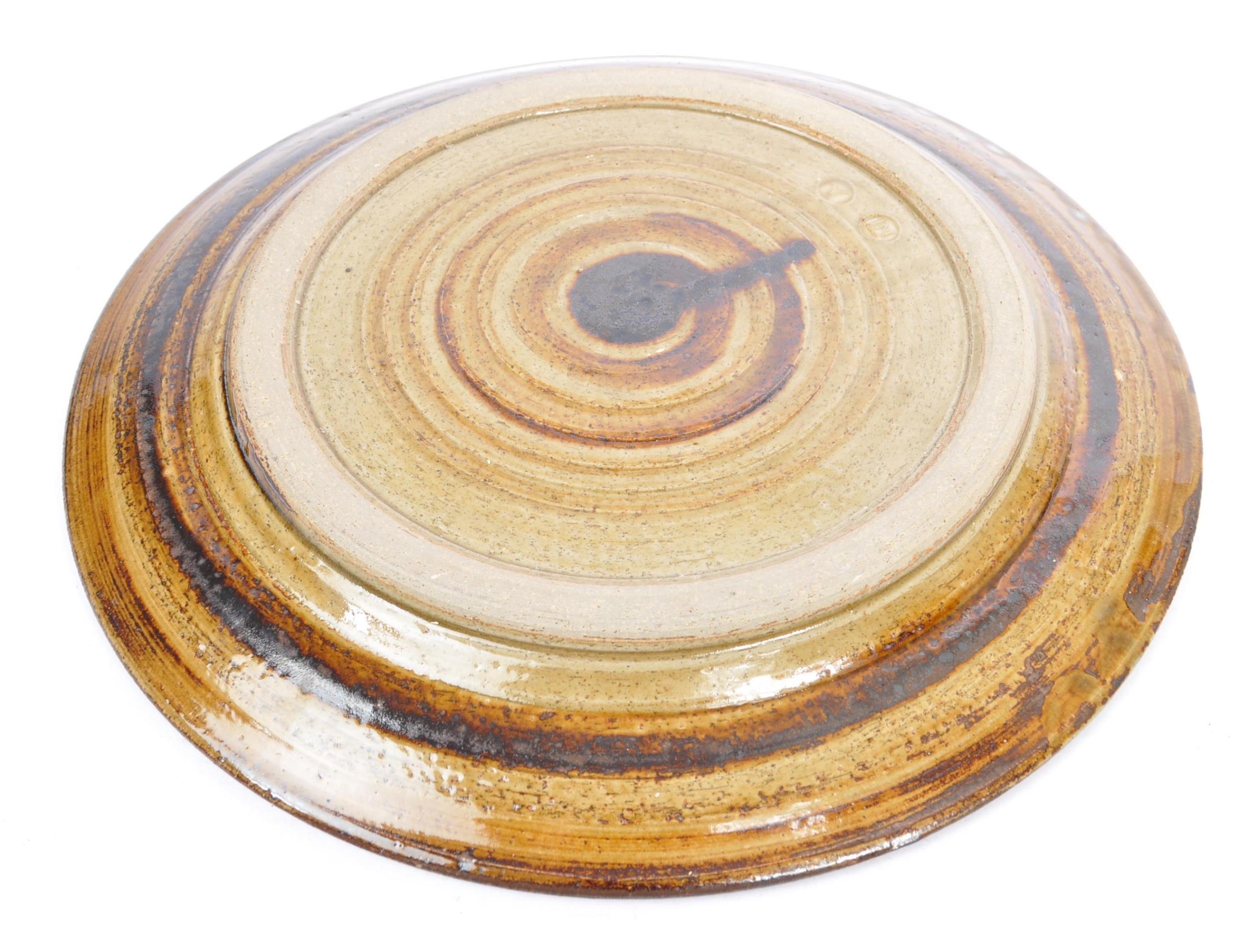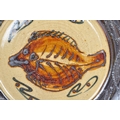 Michael Leach - A vintage mid 20th century large Michael Leach studio pottery stoneware plate charger. Of circular form with hand pained earthenware tones with fish figure to central. With impress stamps to underside ML & Y. Measures approx. 40cm