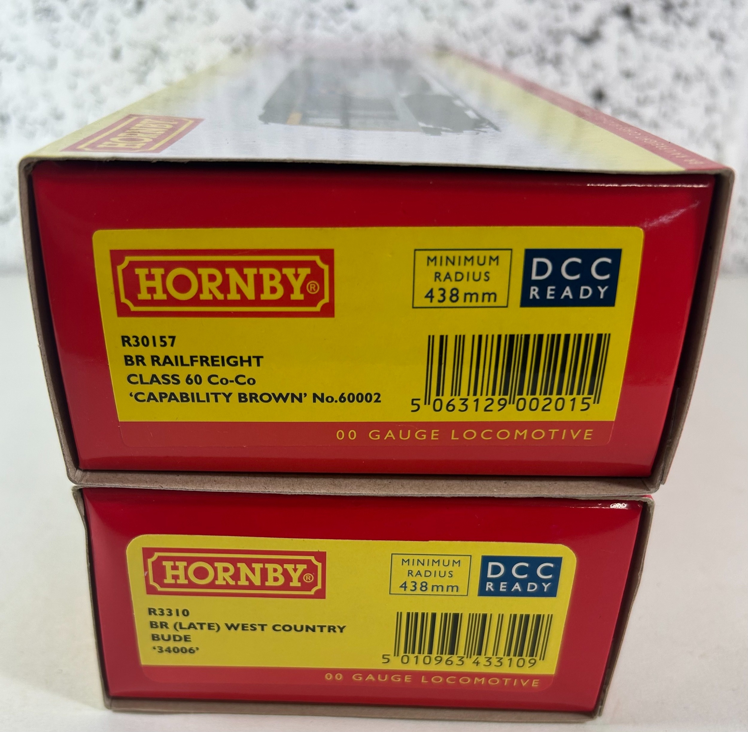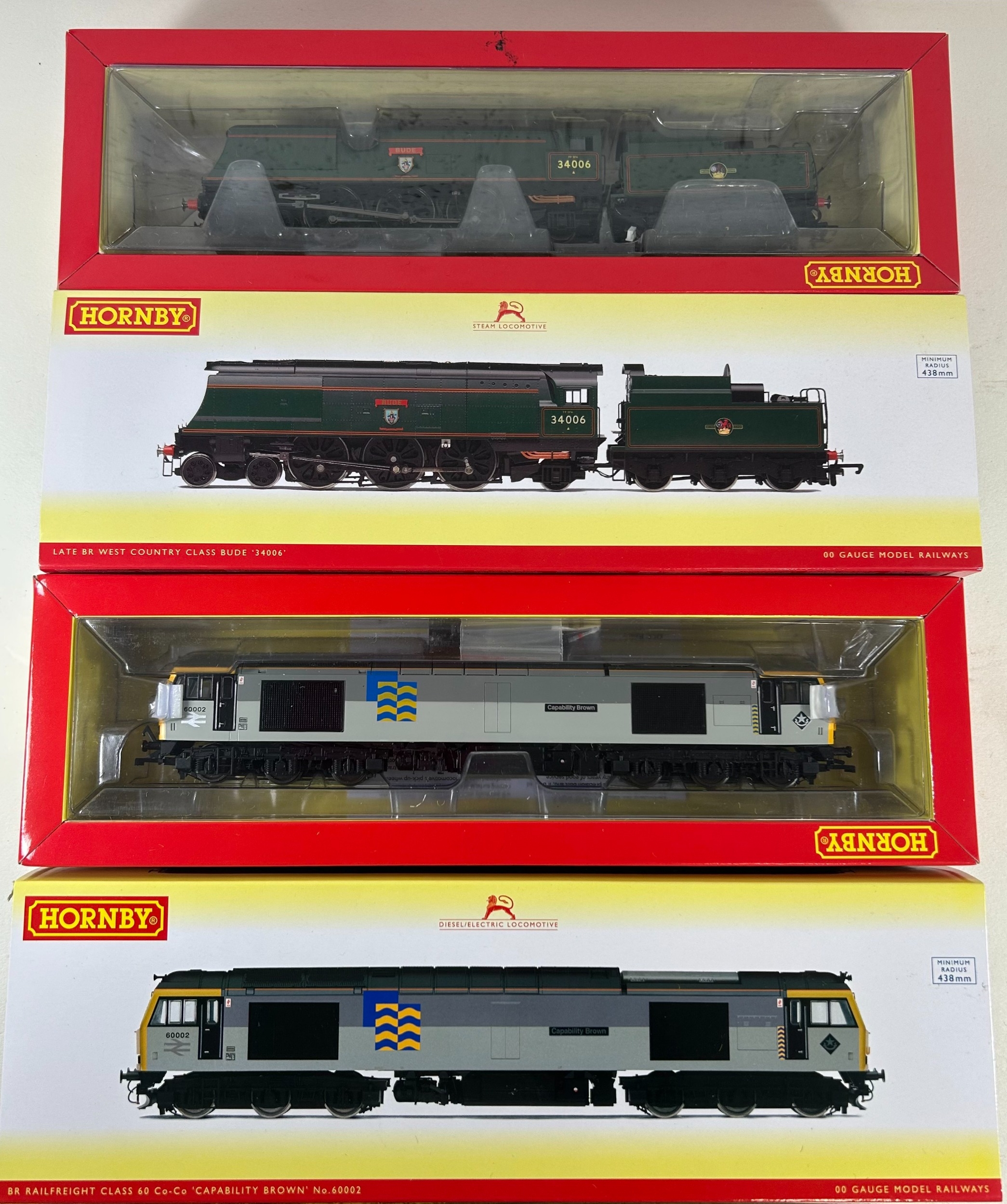 2 Hornby OO Gauge Locomotives, R3310 BR (Late) West Country Bude '34006'. Together with a R30157 BR Railfreight Class 60 Co-Co 'Capability Brown' No.60002. Both boxed and DCC Ready. GC