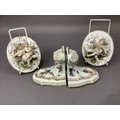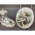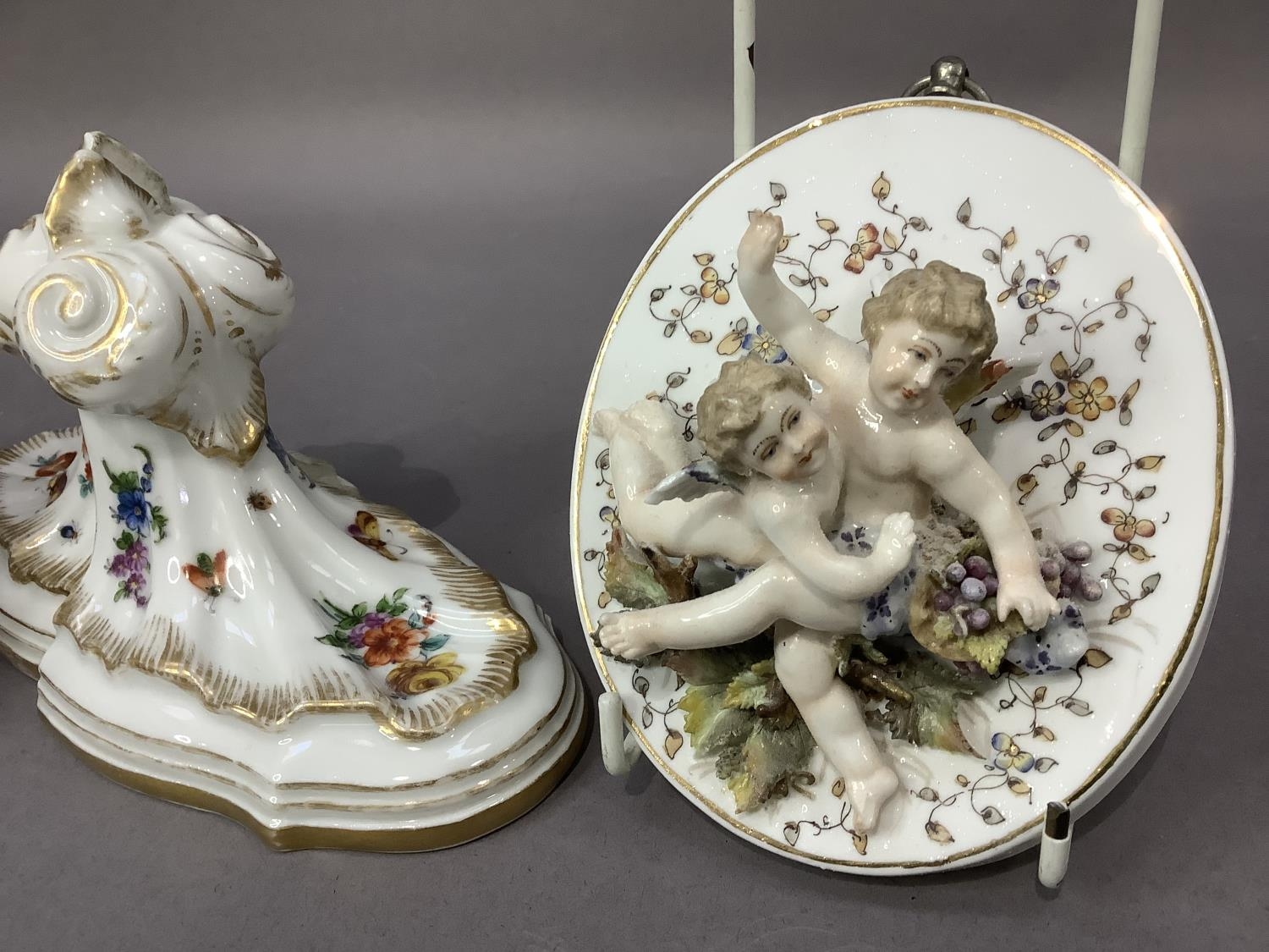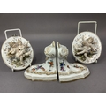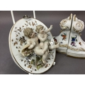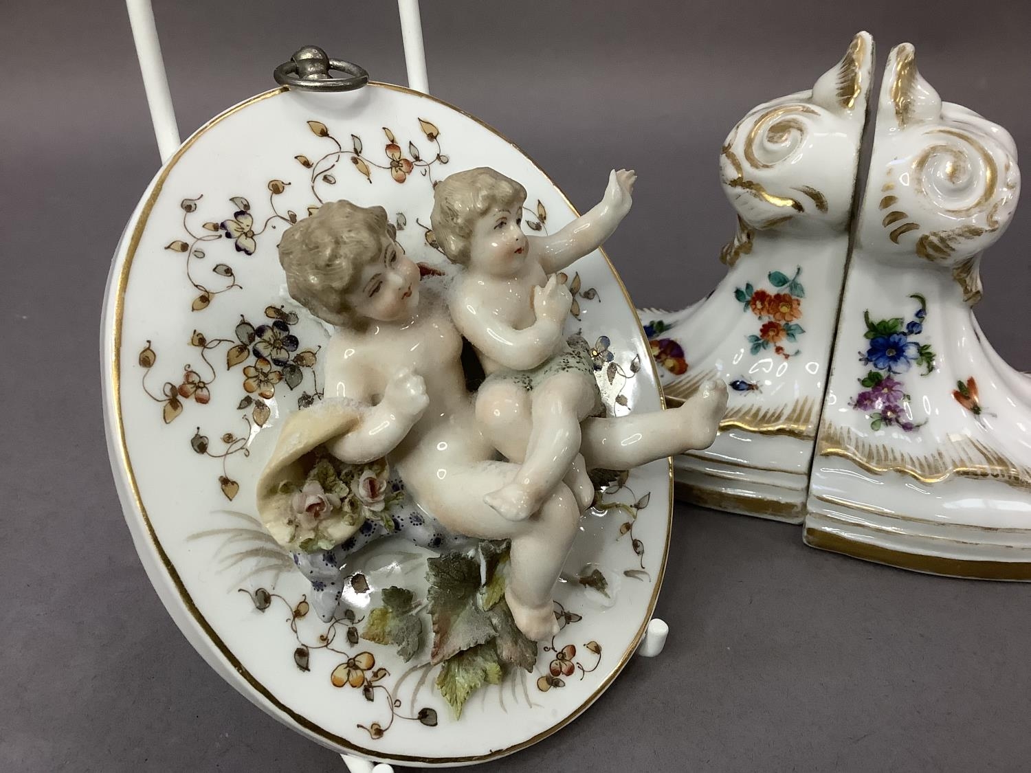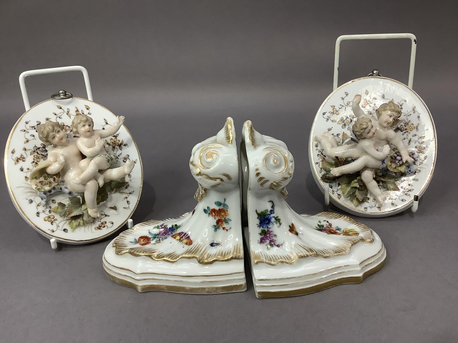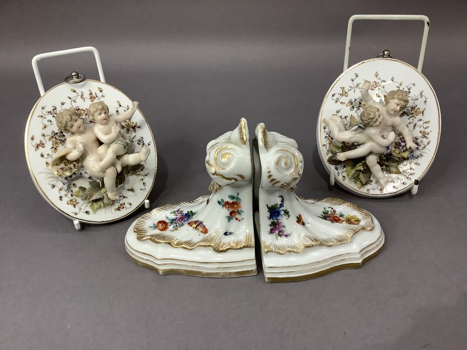 A pair of continental china wall plaques mounted in relief with pairs of cherubs together with a pair of china wall brackets decorated with flowers and insects, gilt feathered and lined highlighting, plaques 12cm x 1ocm, the brackets 9.5cm by 10cm high
