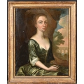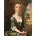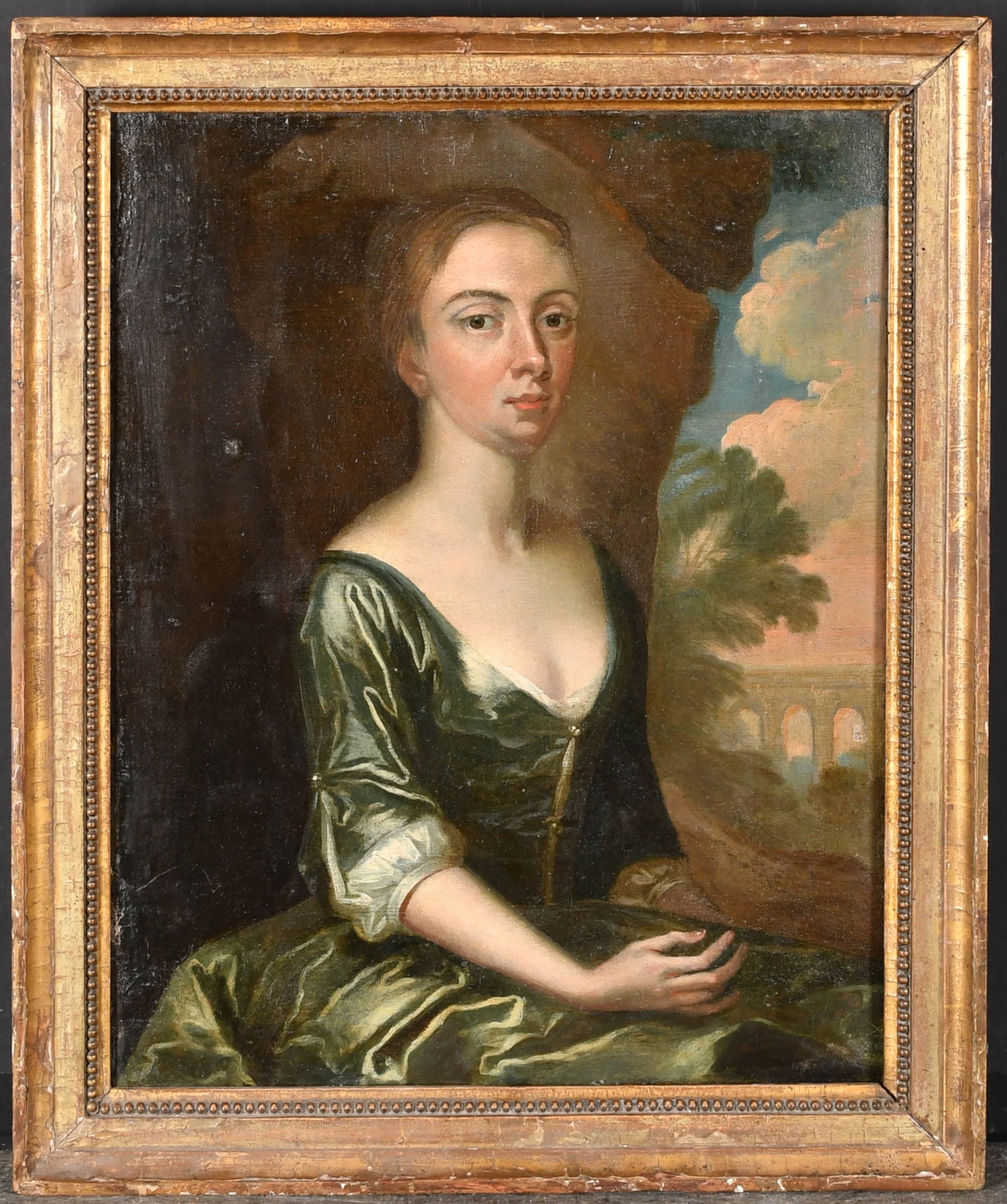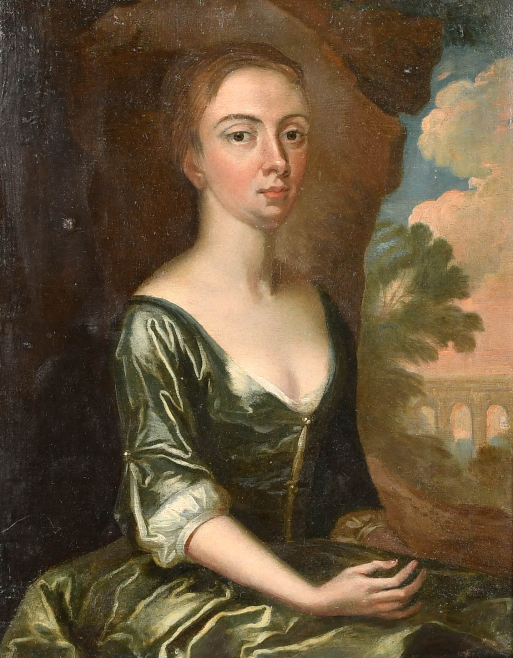 Circle of Enoch Seeman (1689-1745) British. Half Length Portrait of a Seated Lady, with a bridge beyond, Oil on canvas, 16.25" x 12.75" (41.3 x 32.4cm)