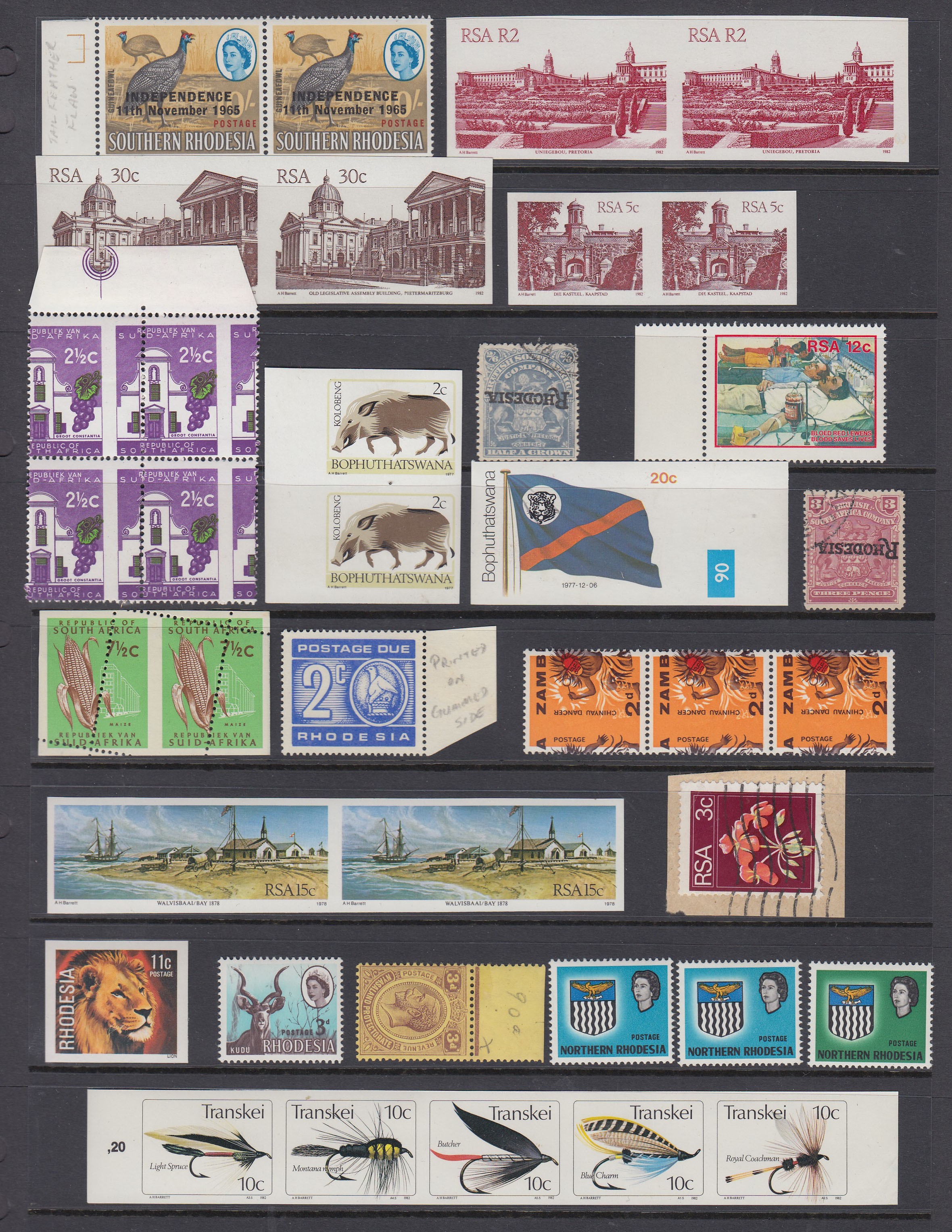 A mint and used collection of African stamp varieties/errors, mainly RSA and Homelands including imperforates/miss-perfs/missing colours, noted RSA 1949 UPU ‘Lake in Africa’, 1976 3c missing intaglio printing with certificate 1980 Buildings issue with various flaws including imperforate pairs, Northern Rhodesia QEII missing values, Southern Rhodesia QEII 10/- Tail Feather Flaw , good Cat value