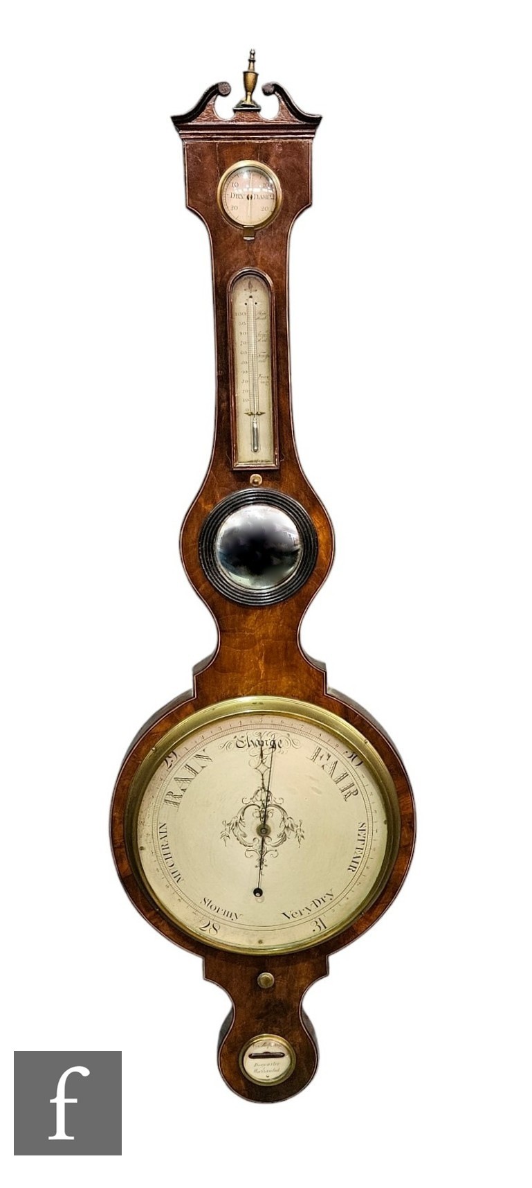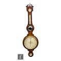 A large 19th Century mahogany wheel barometer by C Soprani Doncaster incorporating dry/damp dial, thermometer, mirror over a silvered dial and level, height 120cm.