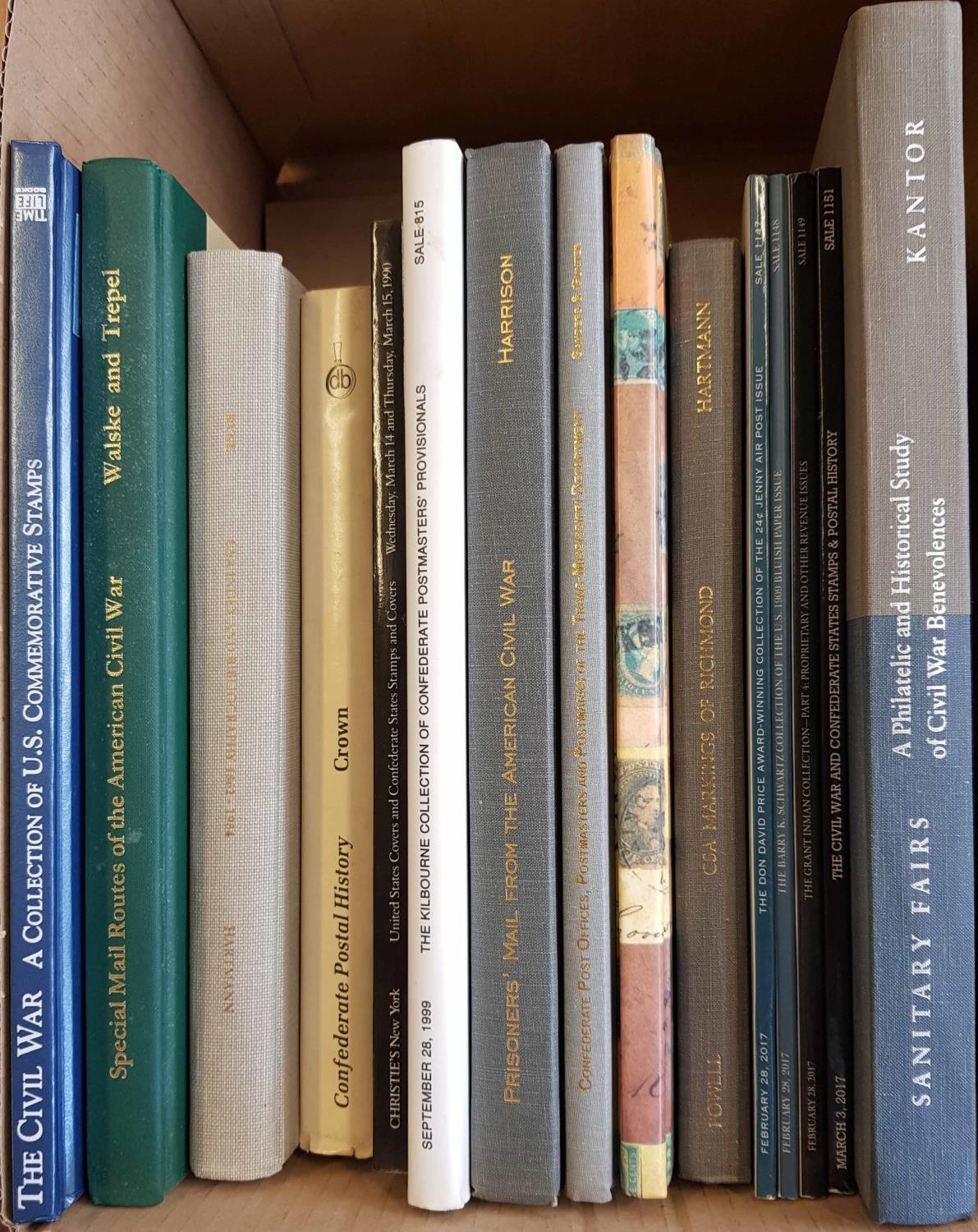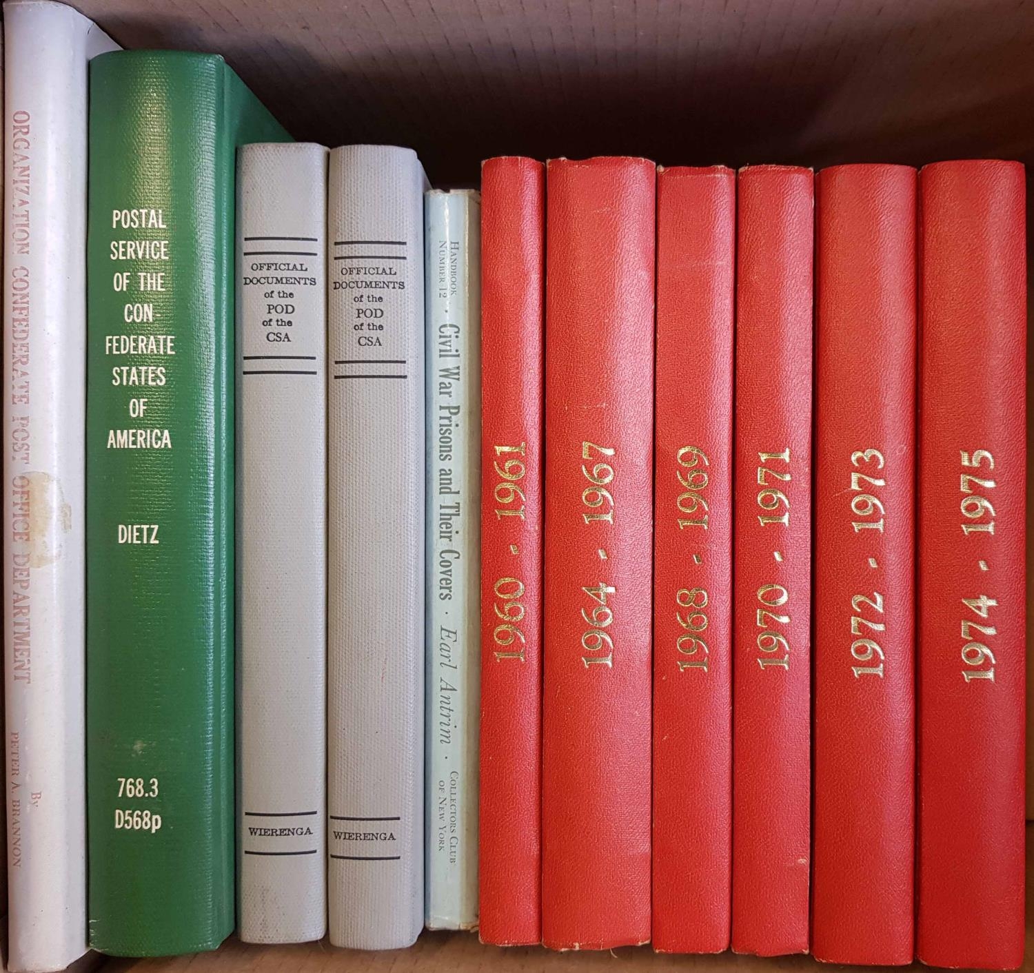 USA - CONFEDERATE STATES & CIVIL WAR: 2 cartons of books on postal history, stamps, routes, etc. inc. The Postal Service of the Confederate States of America by Dietz, Prisoners' Mail from the American Civil War by Harrison, plus some auction catalogues and a short bound run of the Confederate Philatelist journal 1960-75. (27) Cross Reference: CIVIL WAR, UNITED STATES OF AMERICA