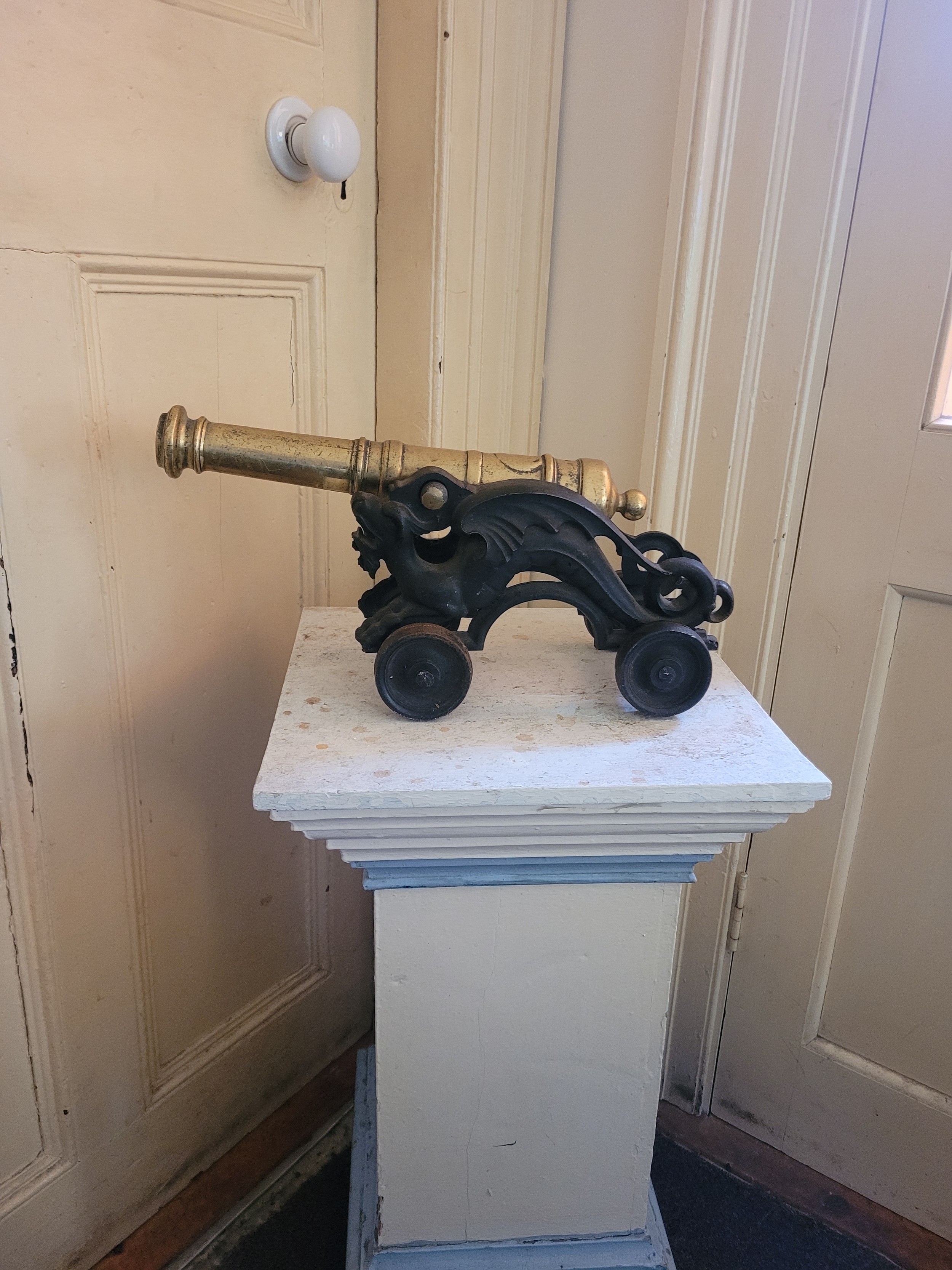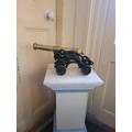 A brass cannon on a cast iron wheel base. 15'L and 10'H
