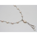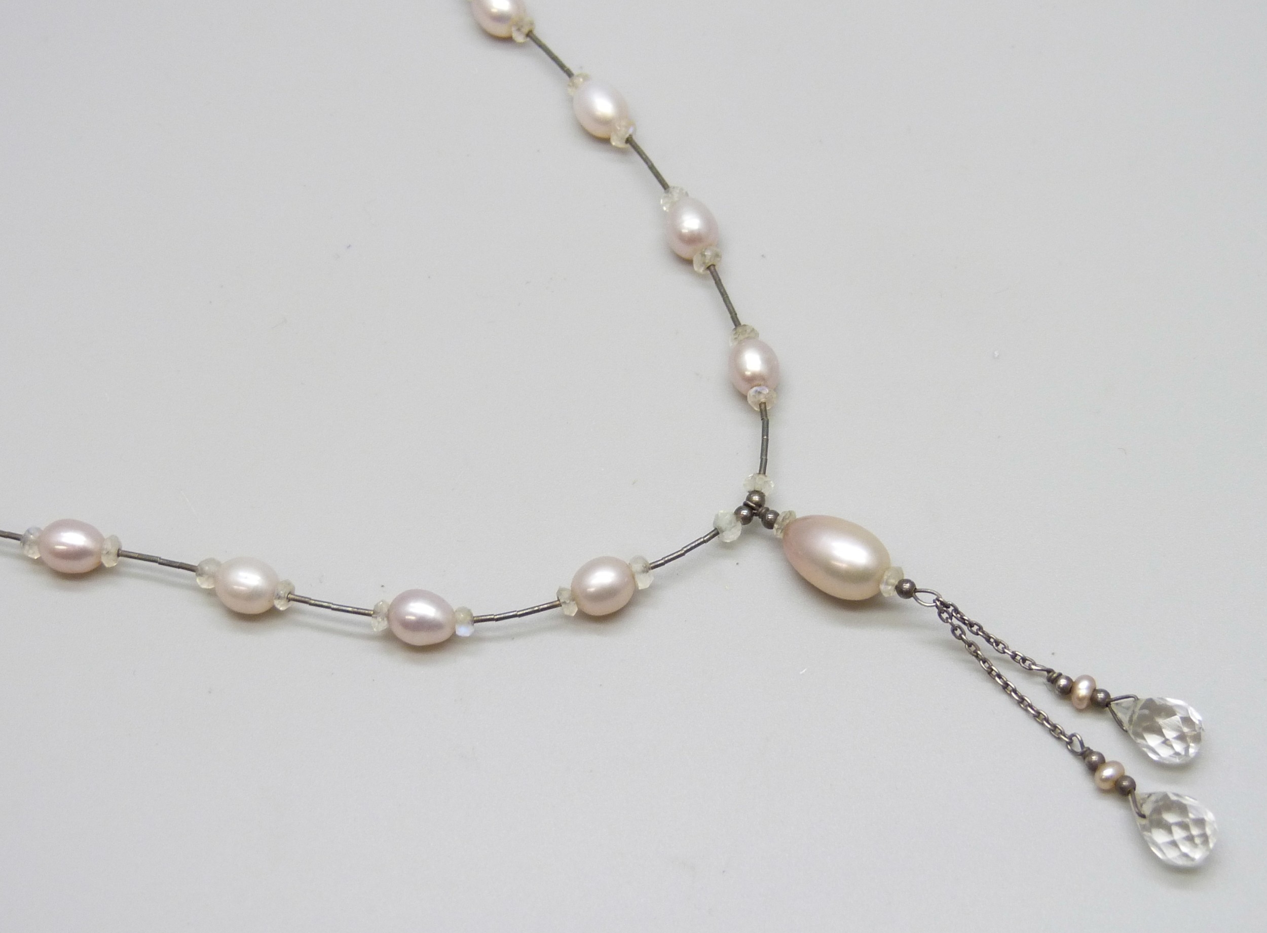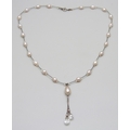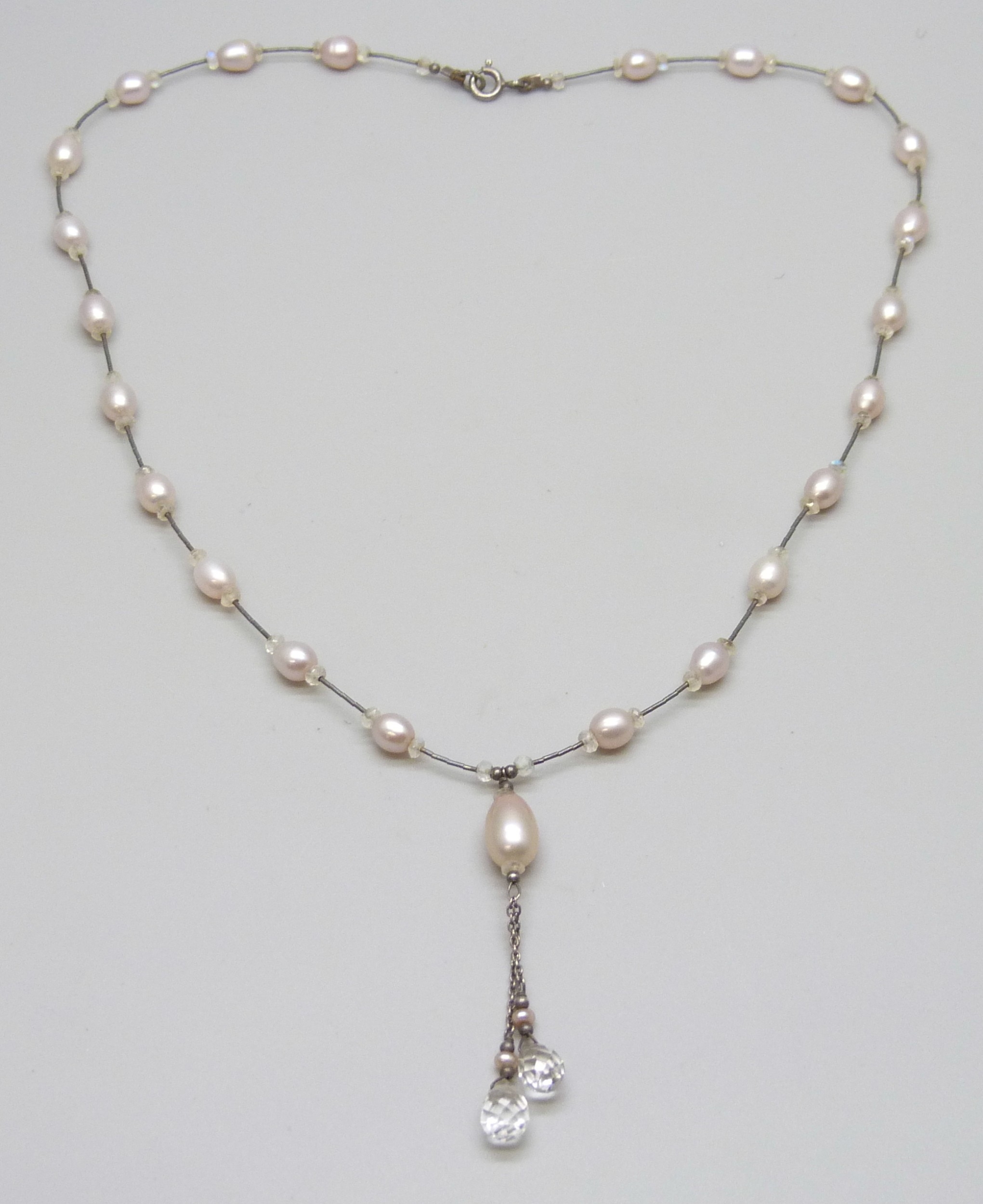 A silver and pearl necklace, the pendant set with two faceted clear drops, 46cm