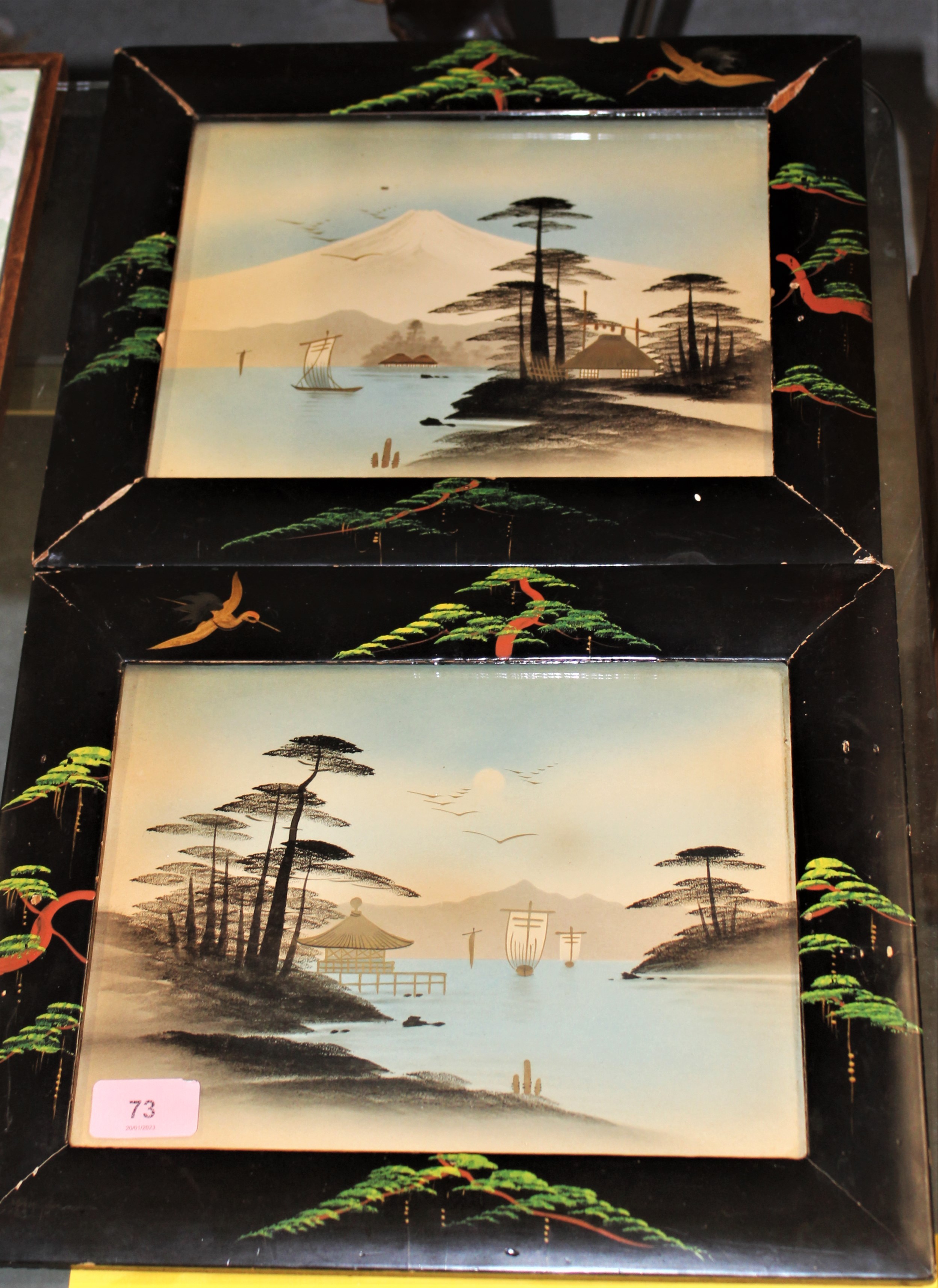 Pair of Oriental Lake Scenes having Gilt Re-Touching and Framed in Hand-Painted Oriental Style Frames (under Glass)