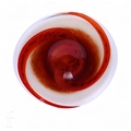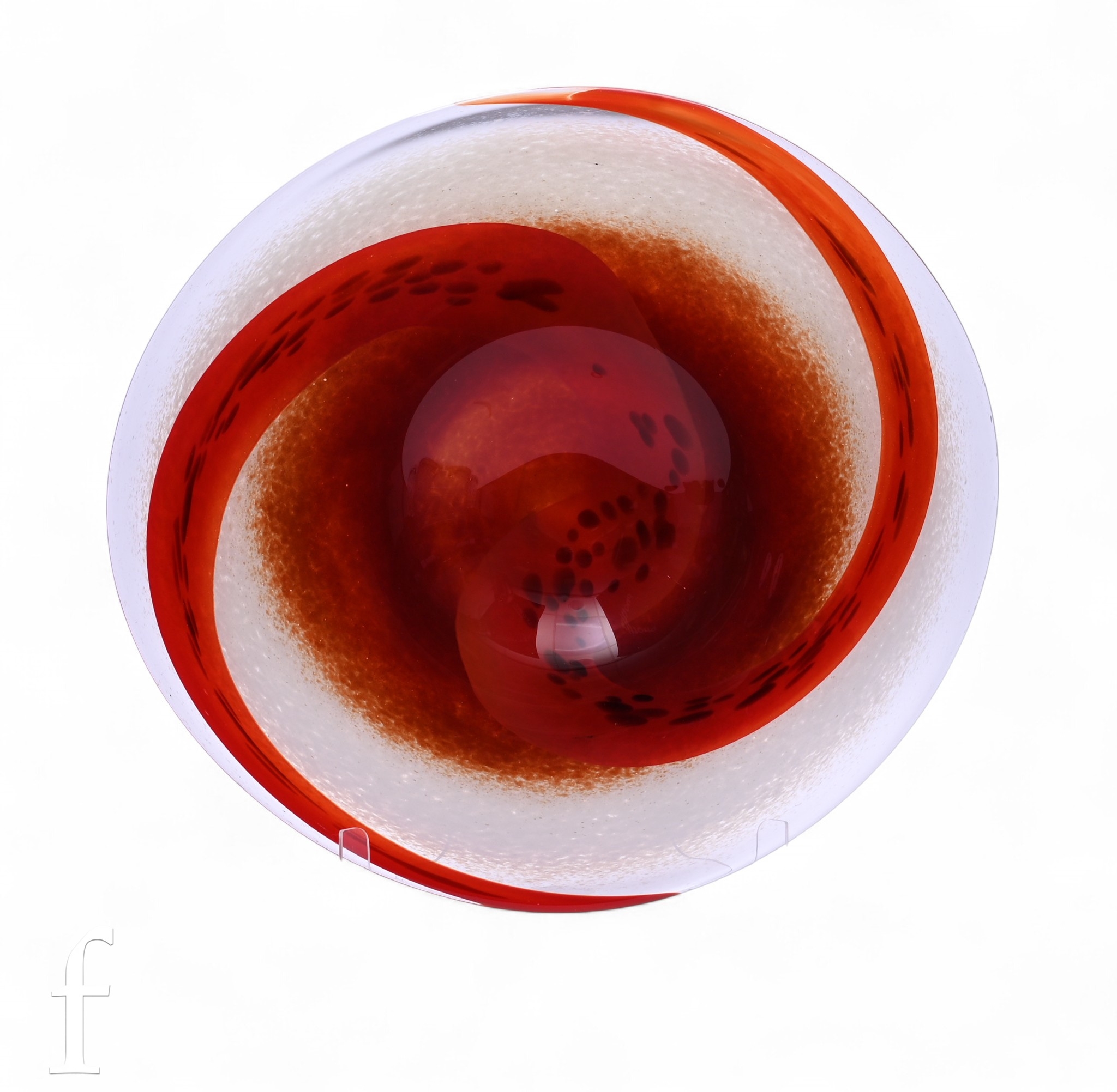 A large contemporary glass bowl by Svaja, the shallow rounded bowl cased in clear crystal over white, red and brown with a spiral design over a mottled ground, acid mark to the base, width 50cm.