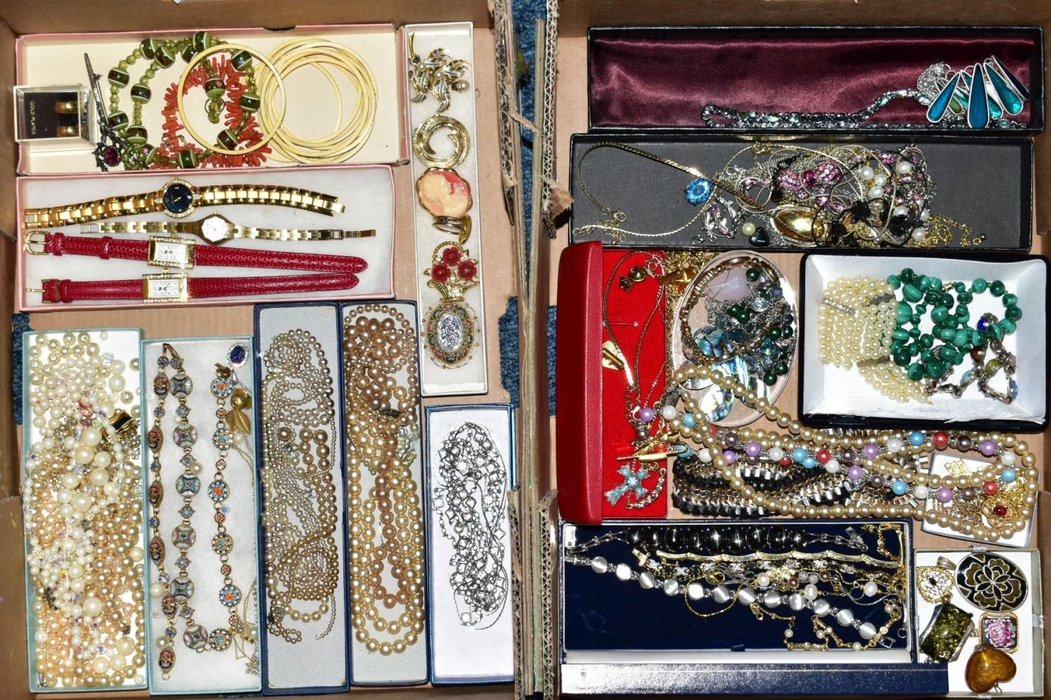 TWO BOXES OF COSTUME JEWELLERY, to include three micro mosaic bracelets and a brooch, a malachite bead necklace, imitation pearl necklaces, further necklaces, bracelets, bangles, pendants, brooches etc