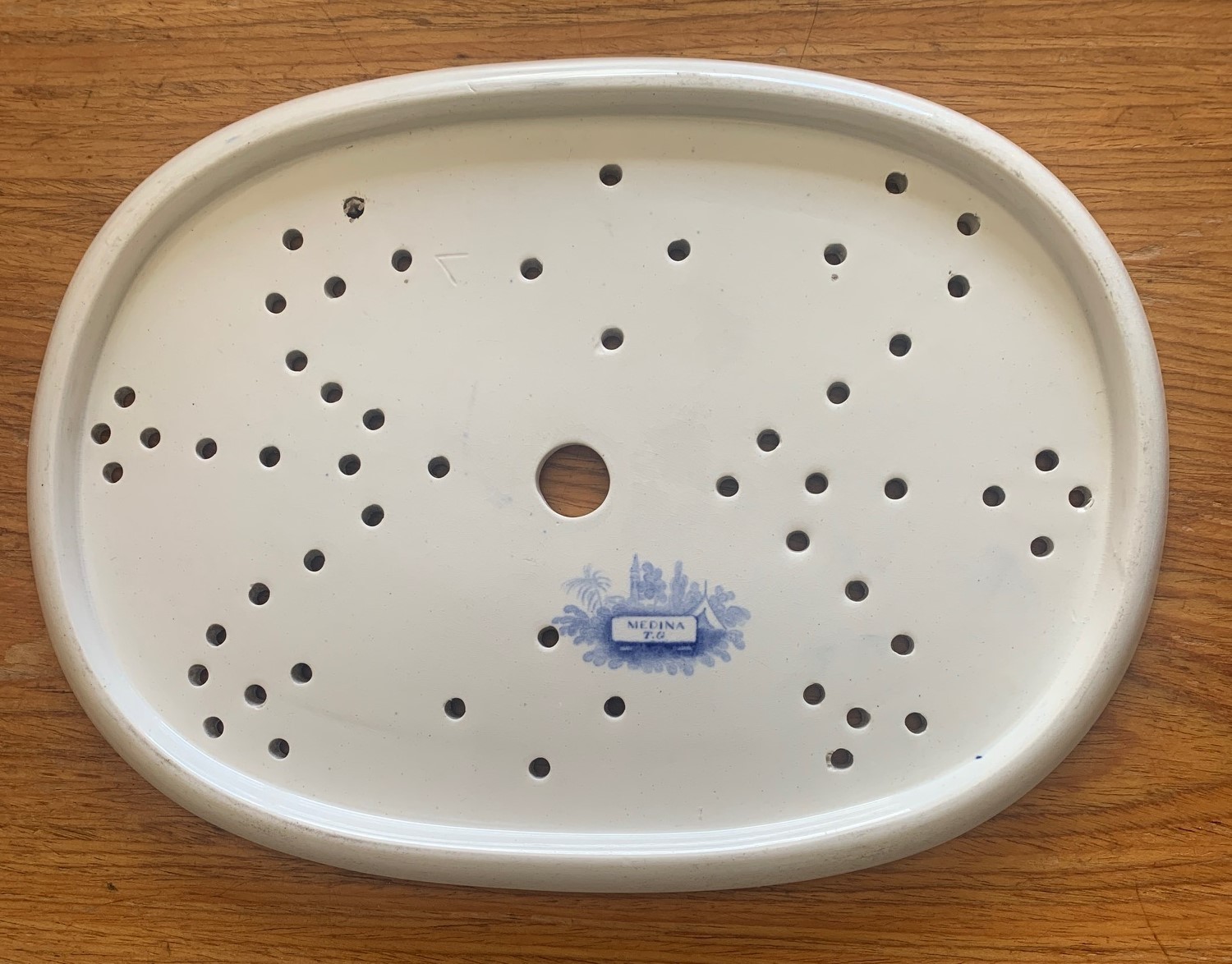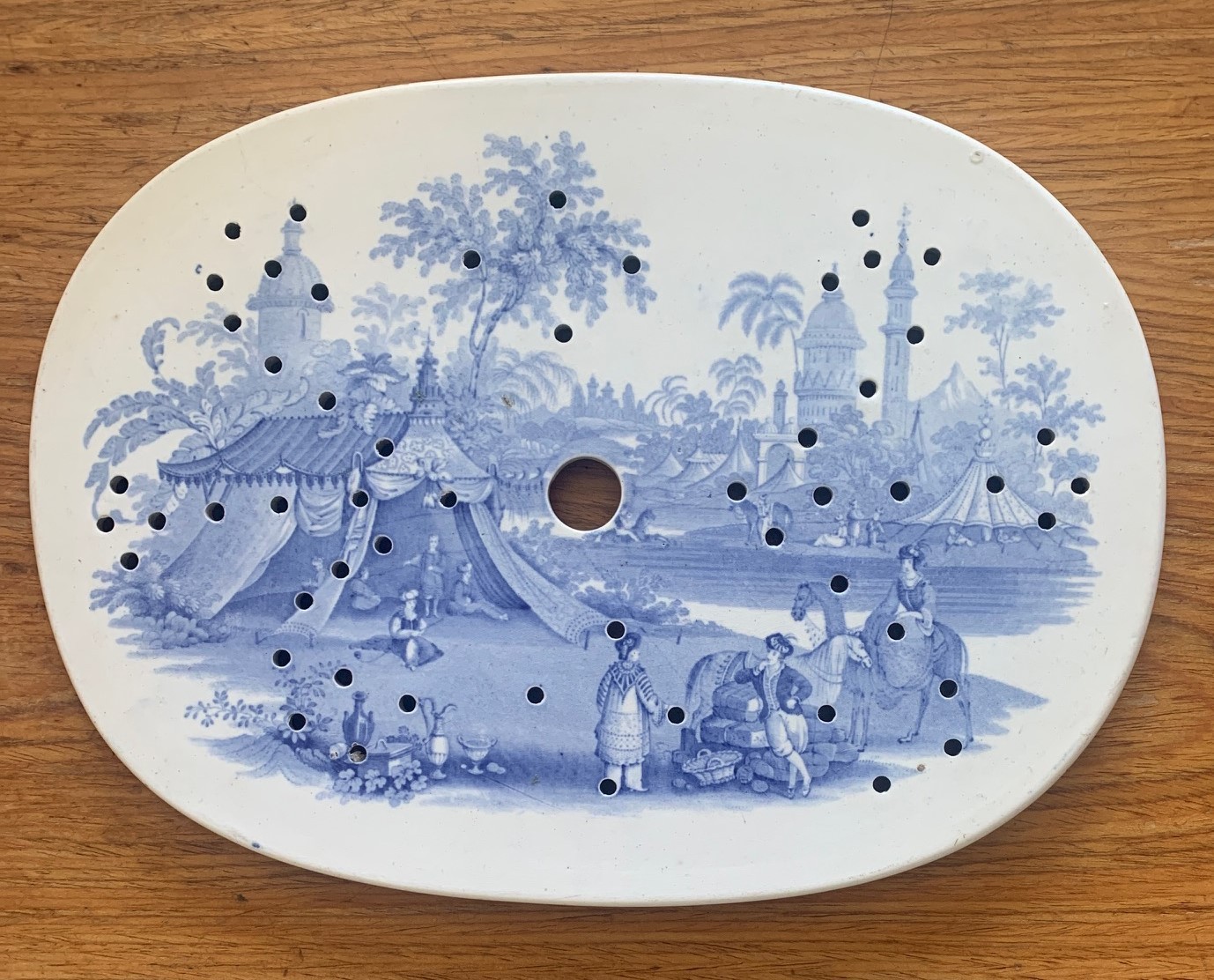 Staffordshire blue and white transfer ware meat platter drainer, decorated in the Medina pattern, 23 x 31cm.