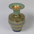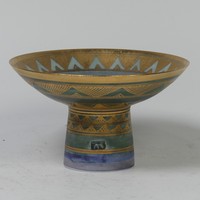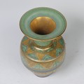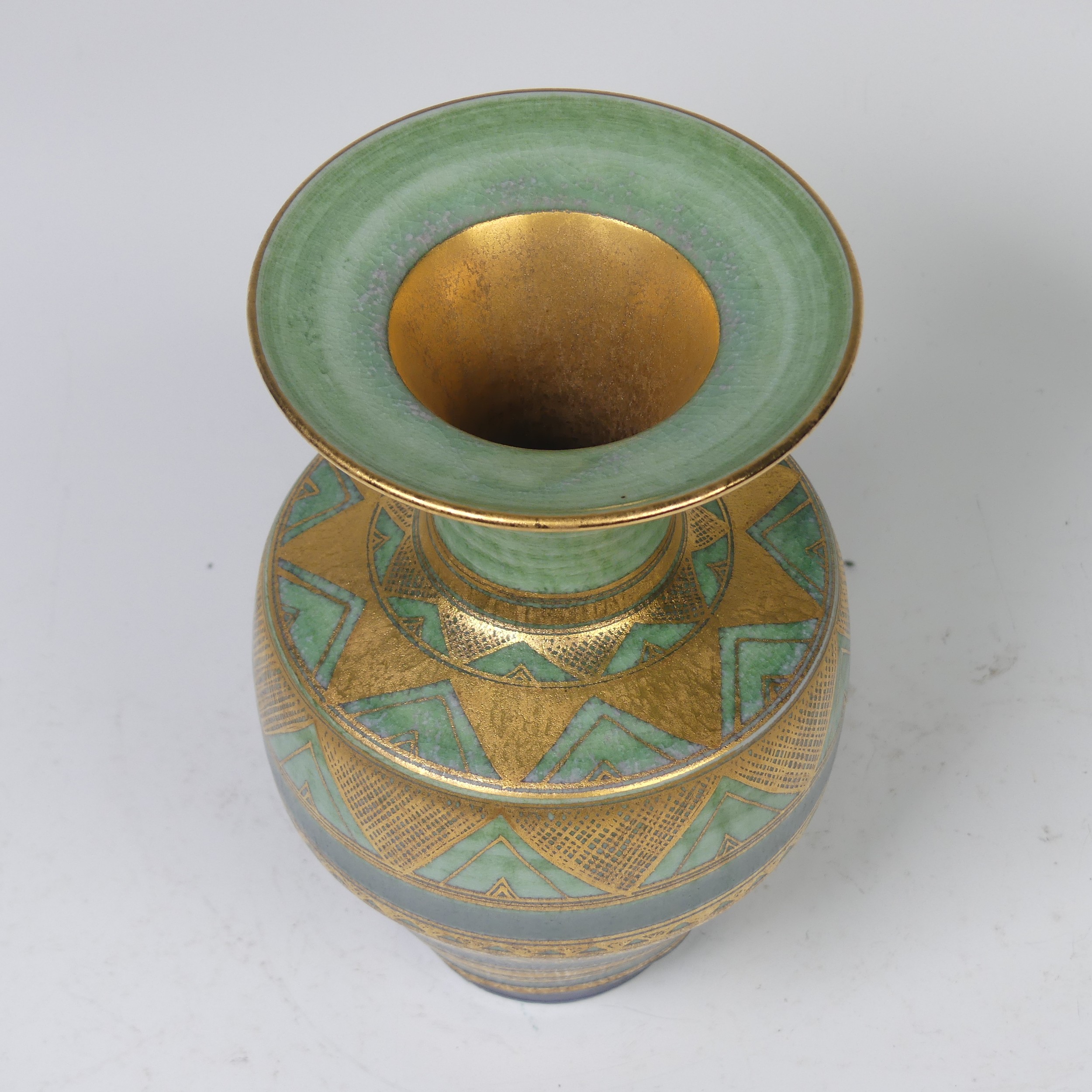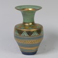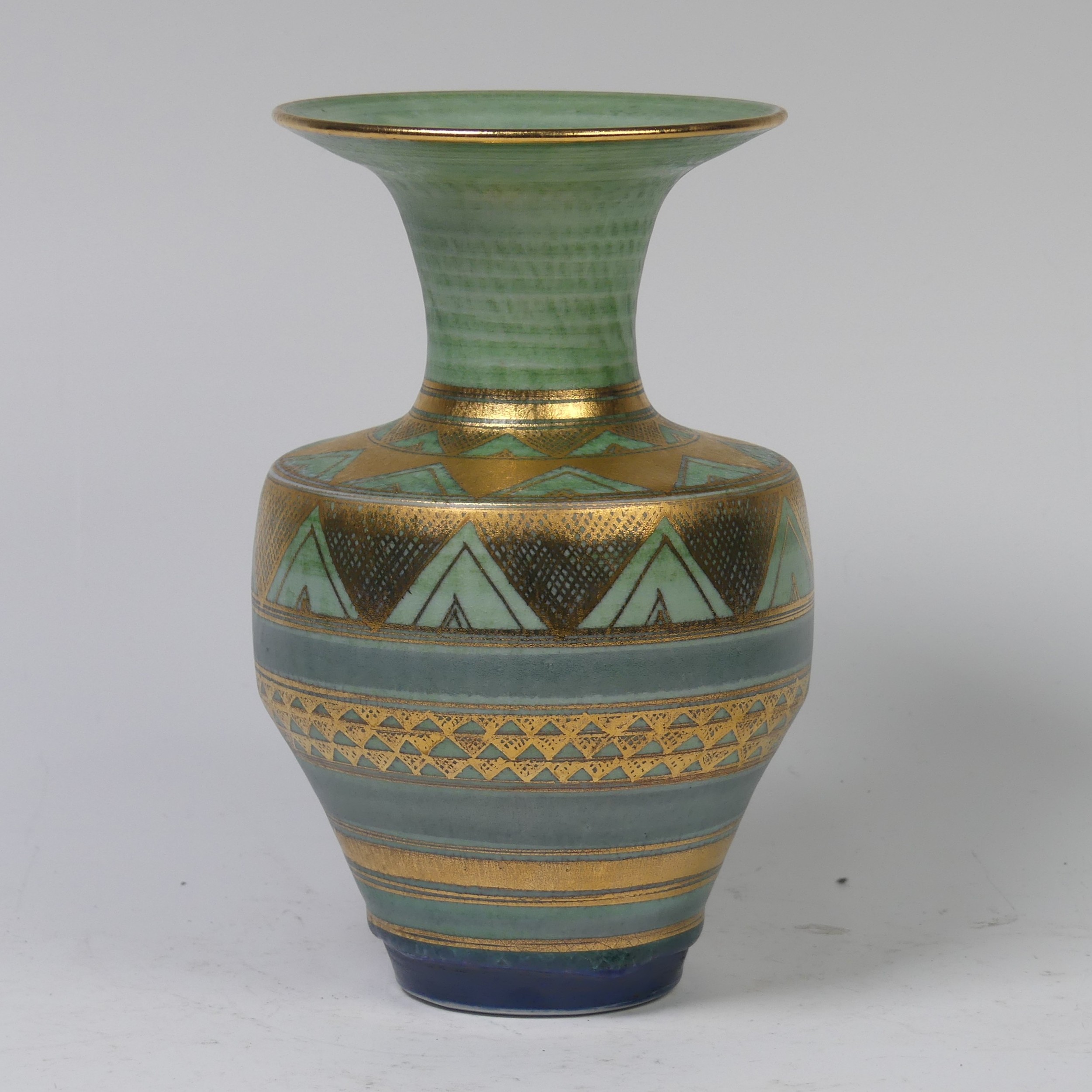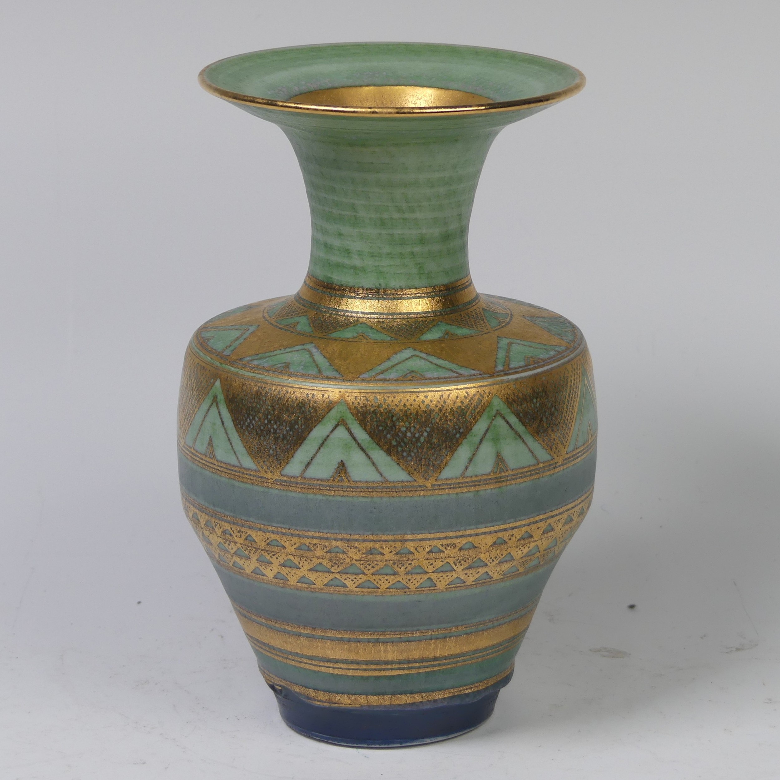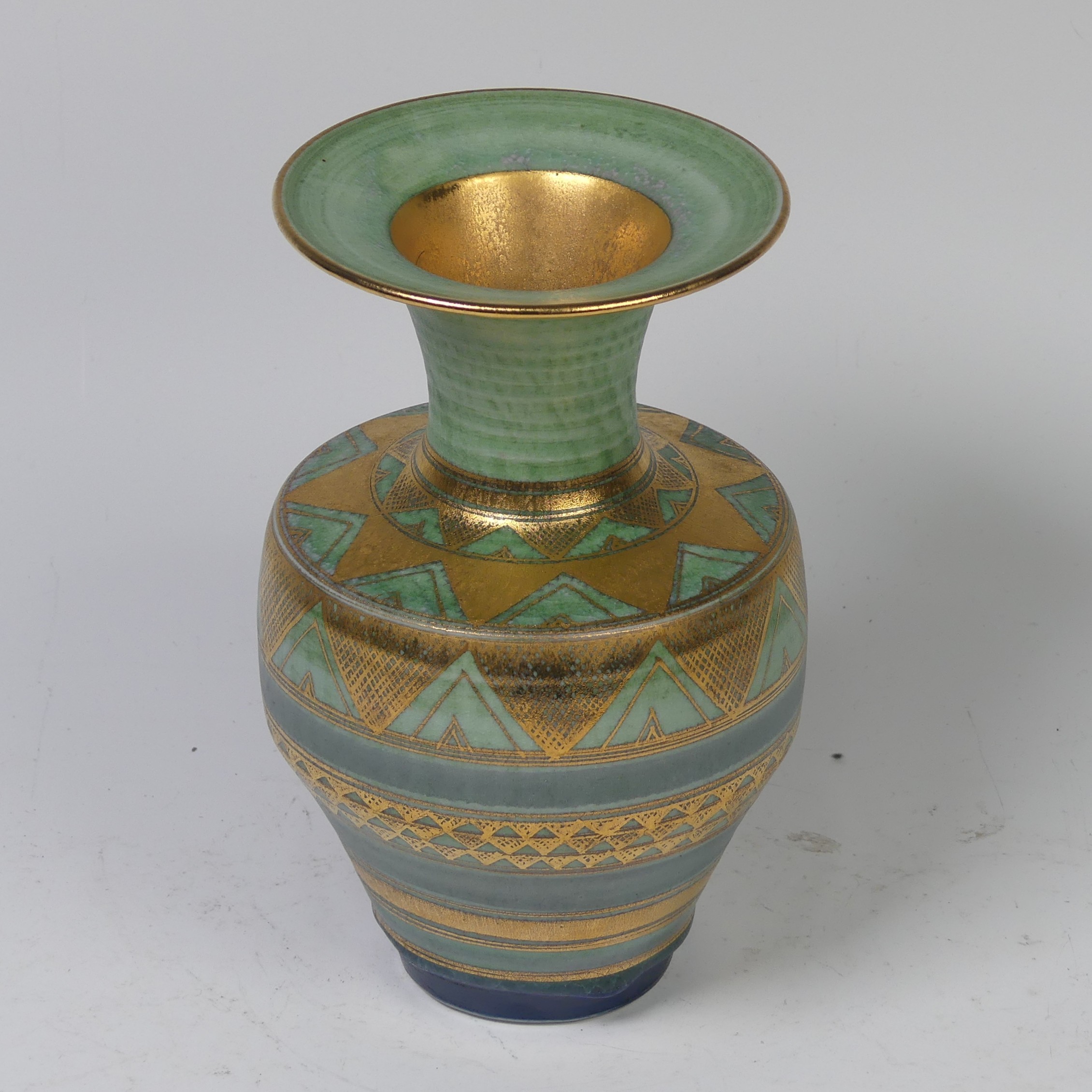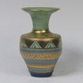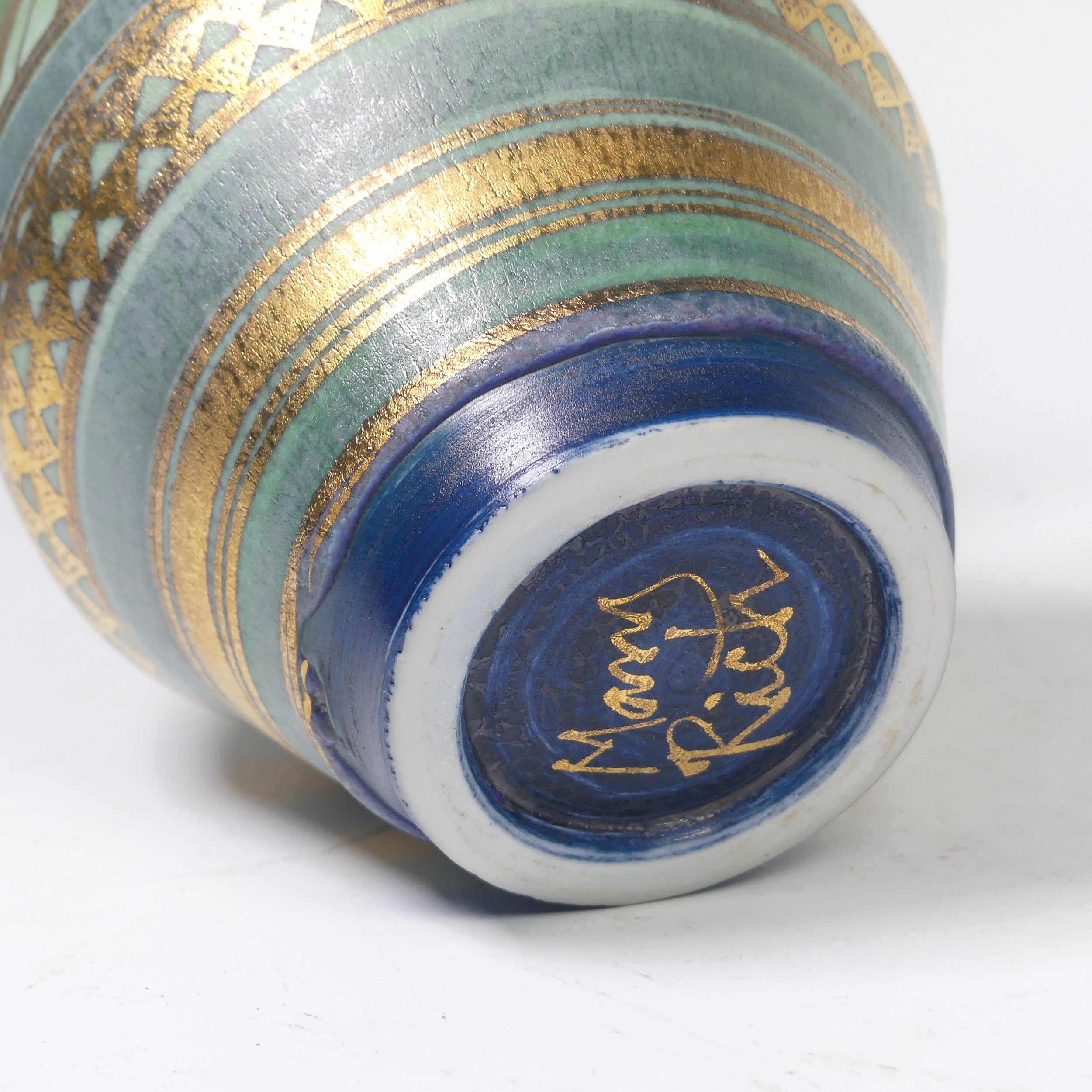 Mary Rich (British, 1940-2022) a studio pottery Vase, decorated with a rich colour palate of green, blue and gold, signed on base, 20cm high.