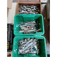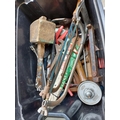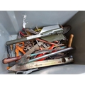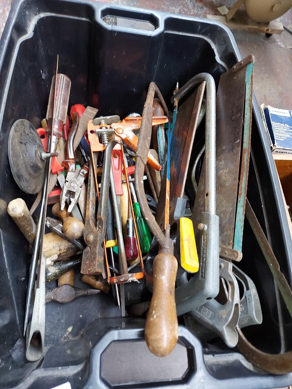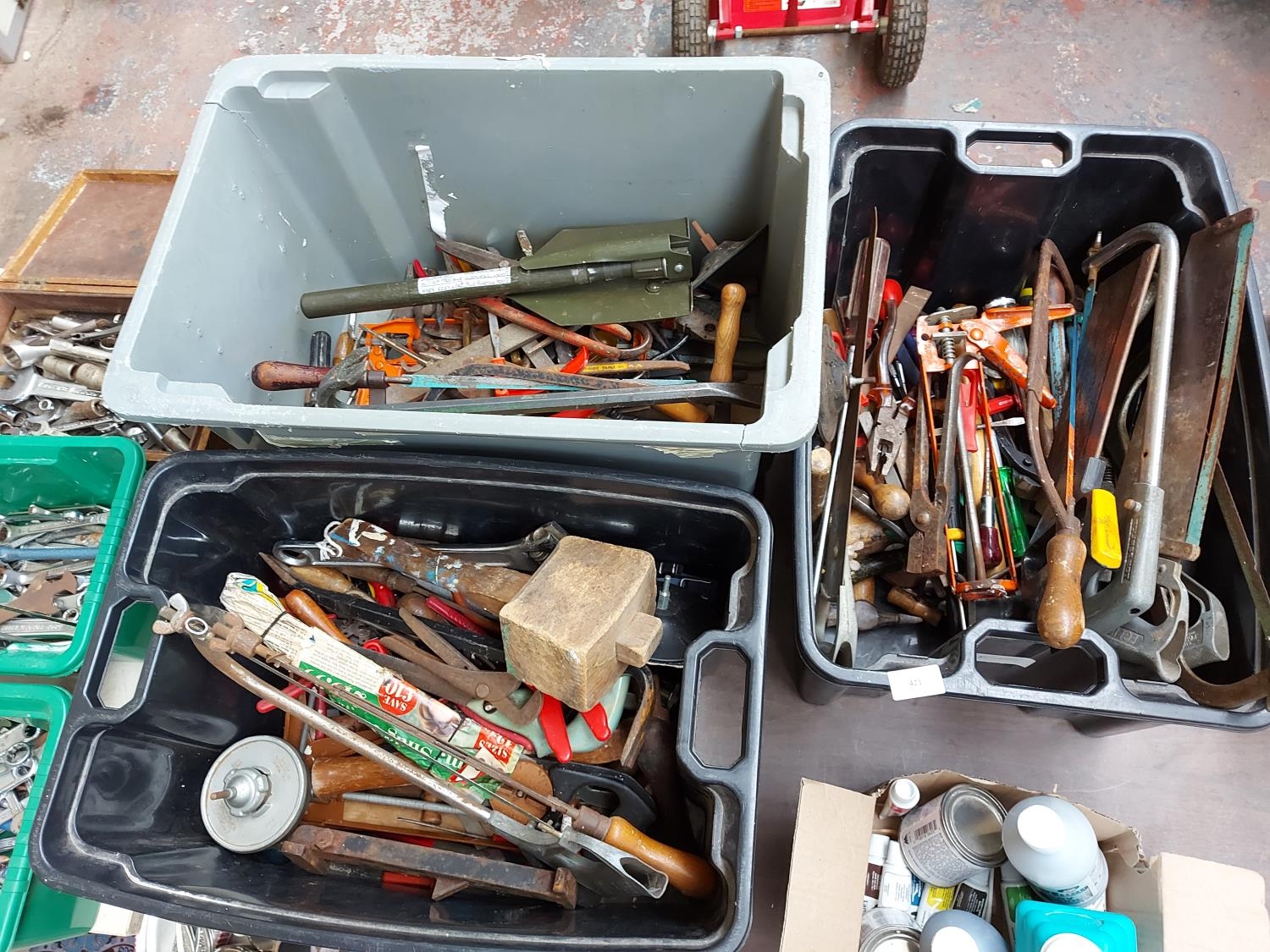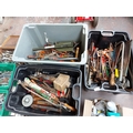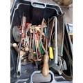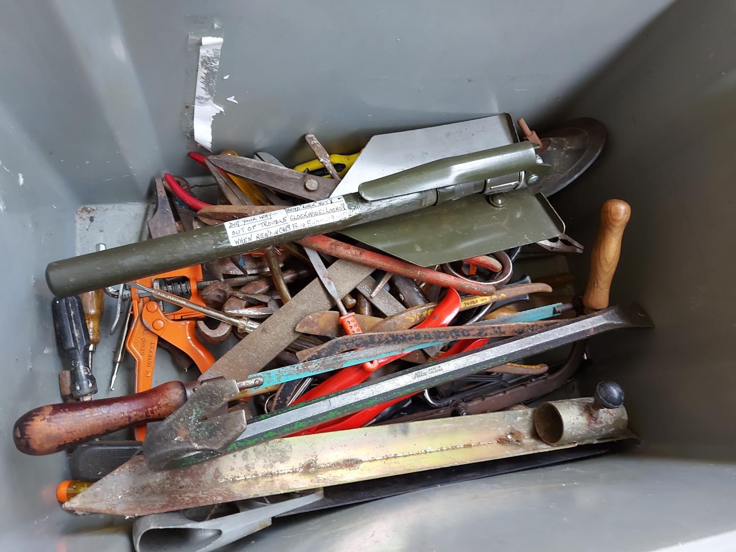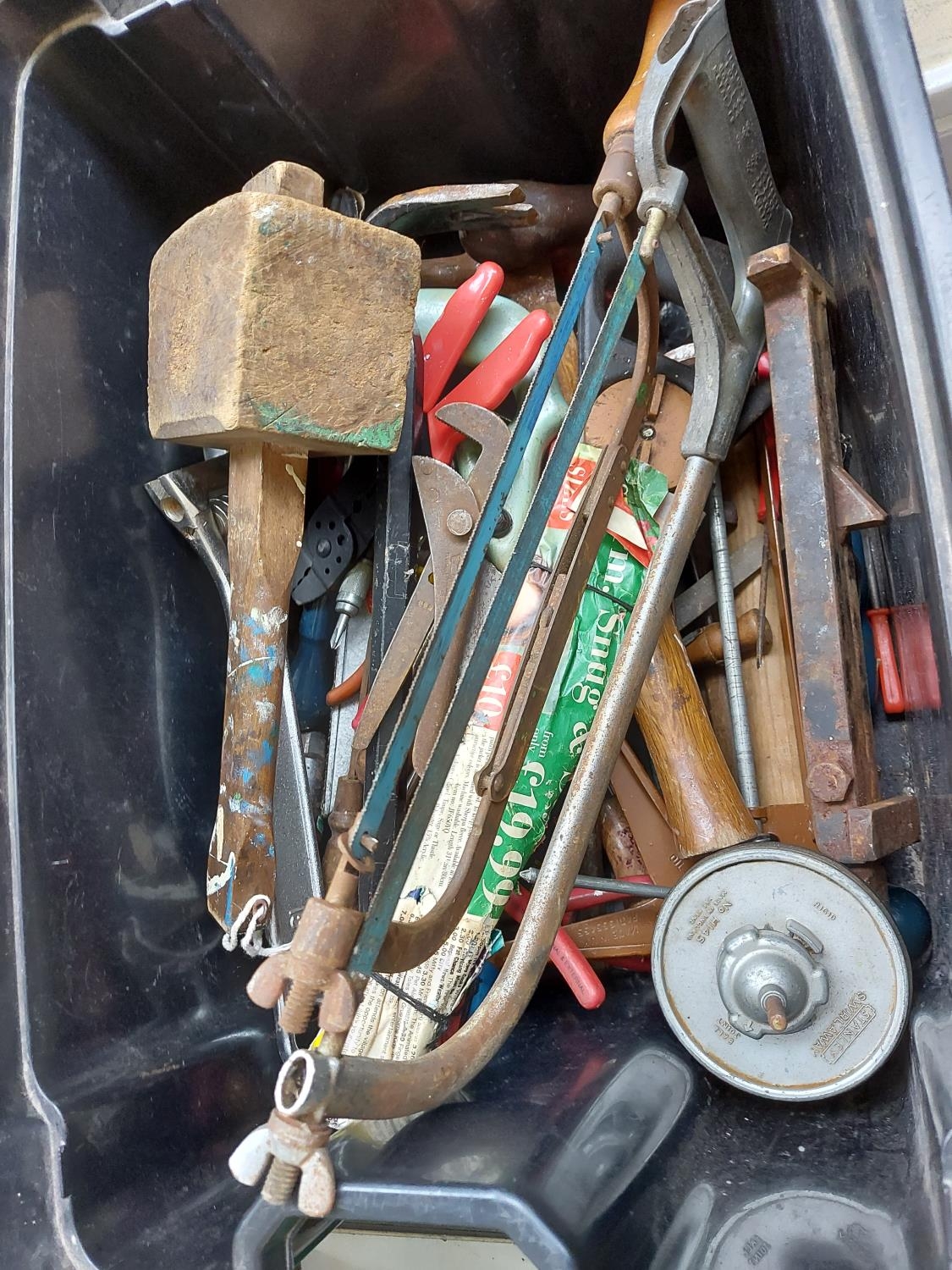 Three boxes containing army trenching shovel, Eclipse hacksaw, wooden mallet, nail bar, files etc.