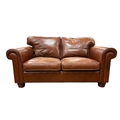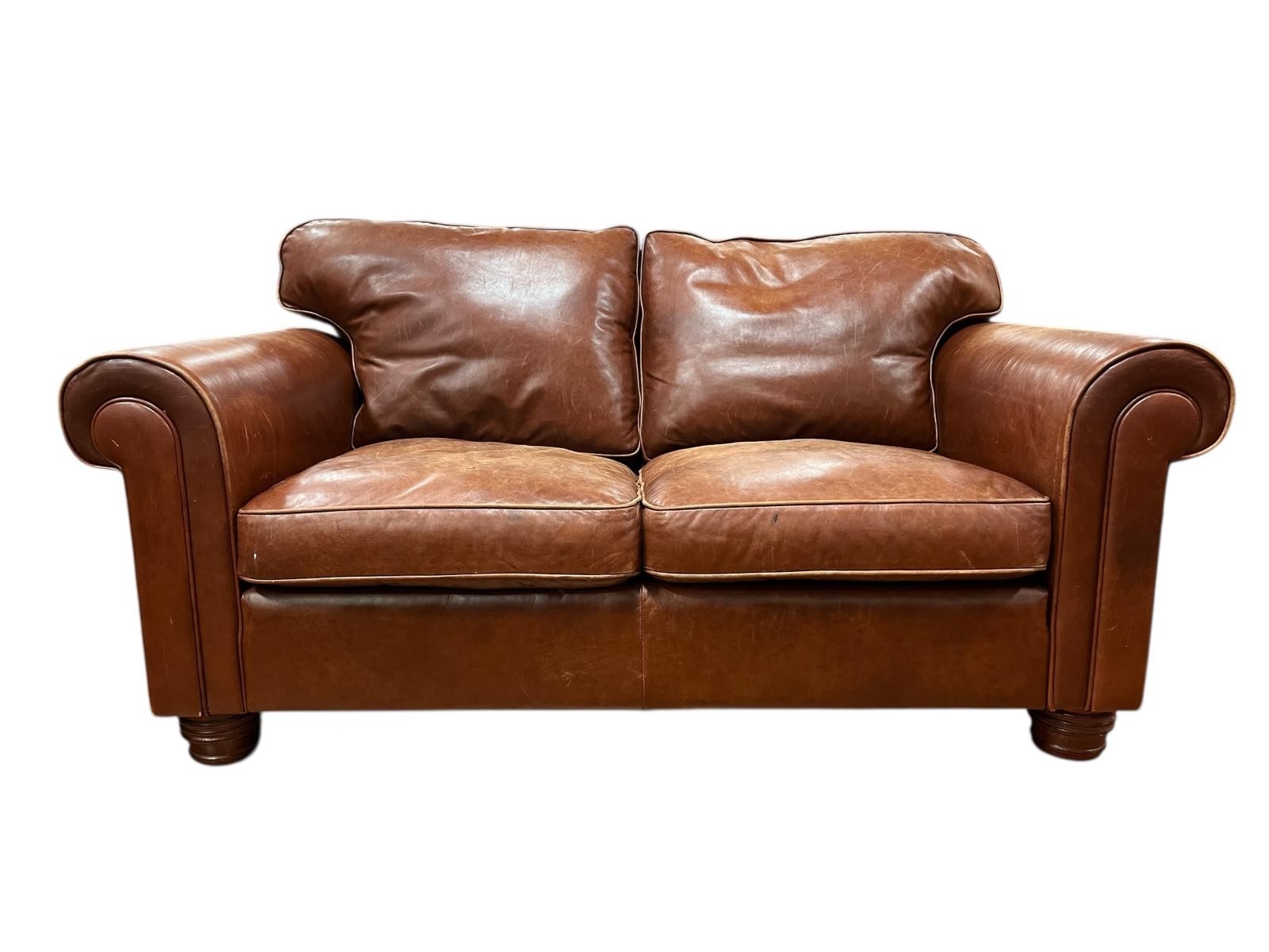 A BROWN HIDE UPHOLSTERED TWO SEATER SETTEE with loose cushions and scroll over arms on turned legs 72(h)cm 158cm(w) 95.5cm(d)
