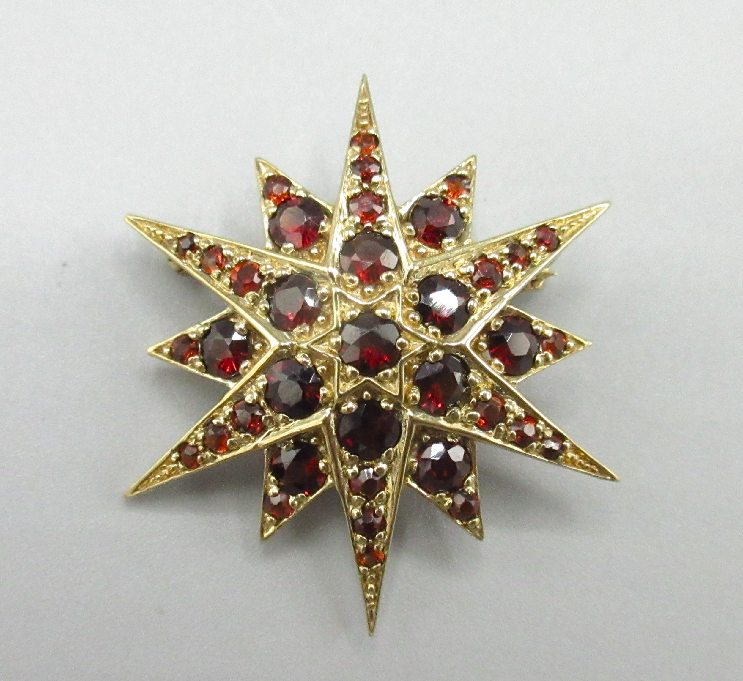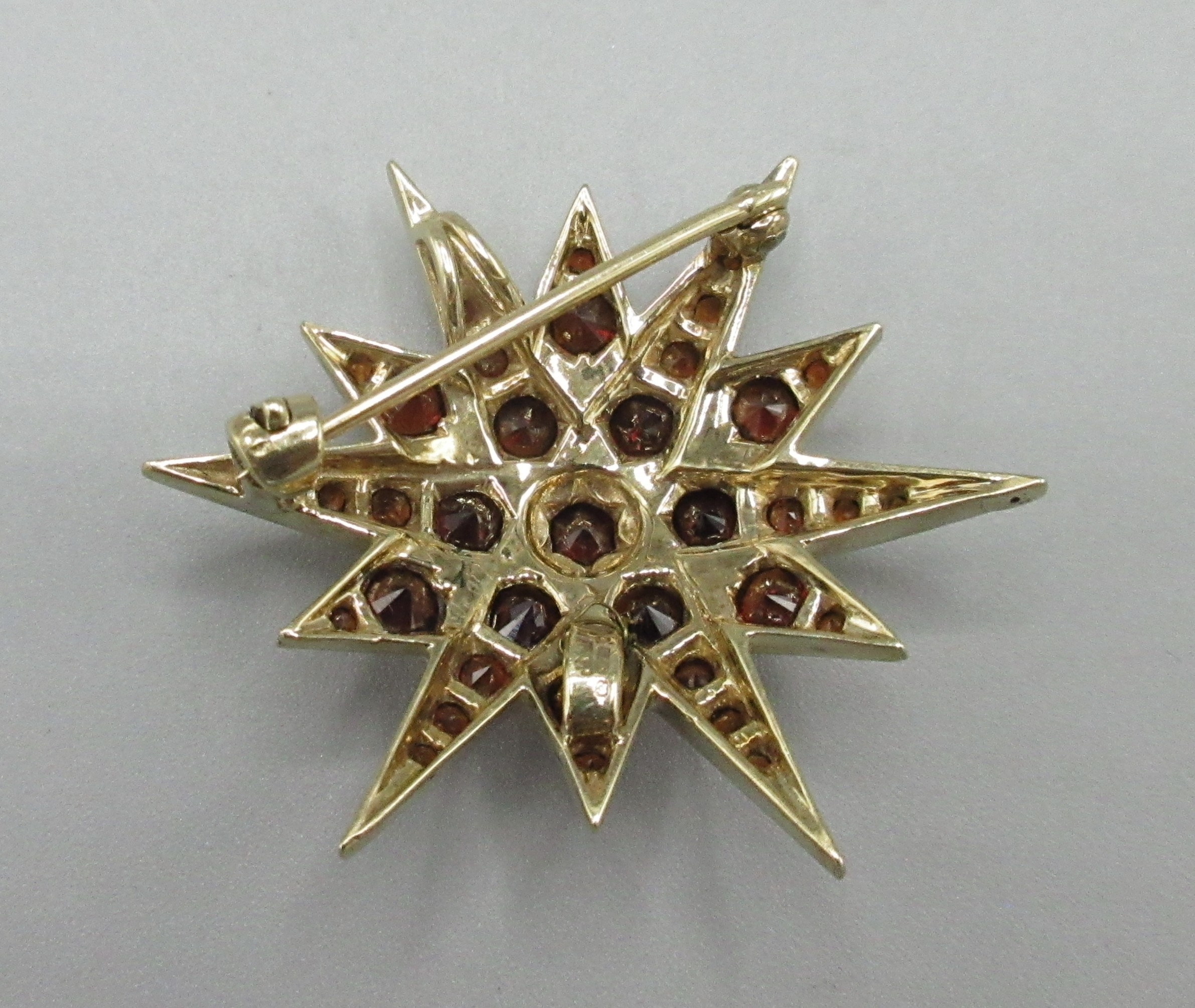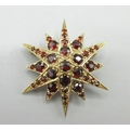 Victorian style 9ct yellow gold starburst brooch set with garnets, stamped 375, L4cm, 7.8g
