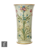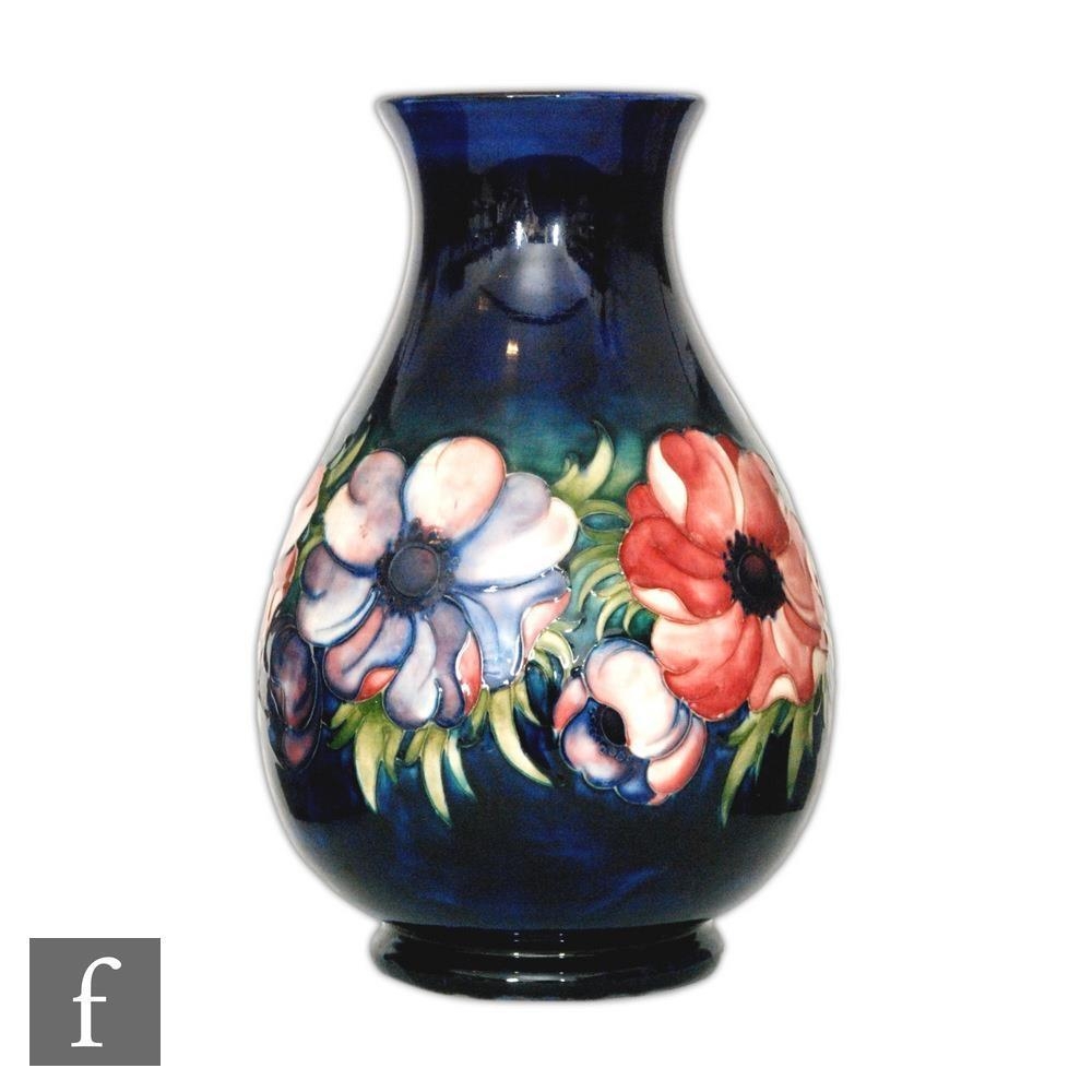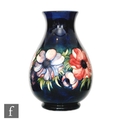 A large William Moorcroft baluster vase decorated in the Anemone pattern with a band of flowers and foliage against a blue wash ground, impressed signature mark and initialled in blue, height 33cm, restored.