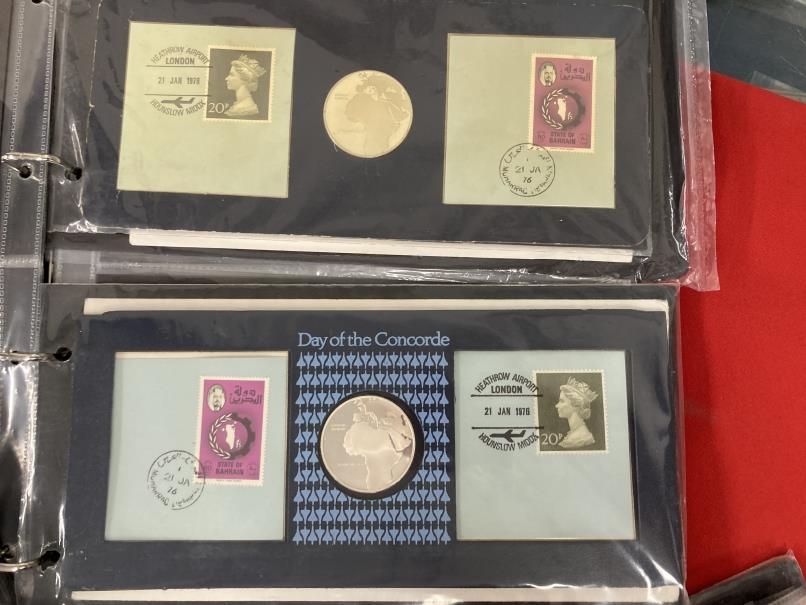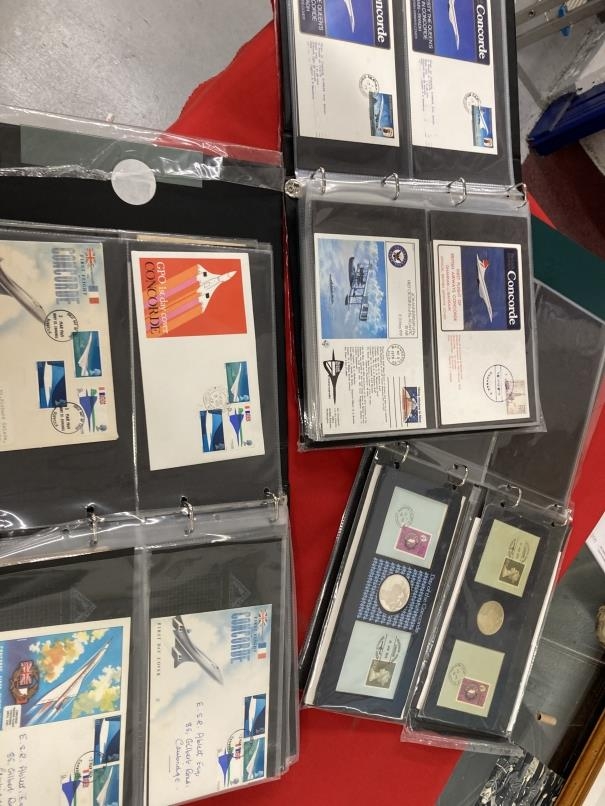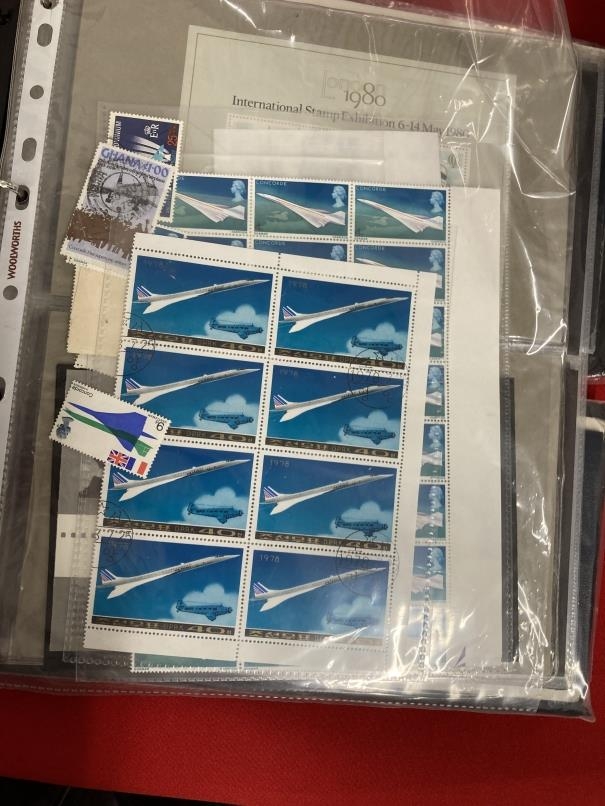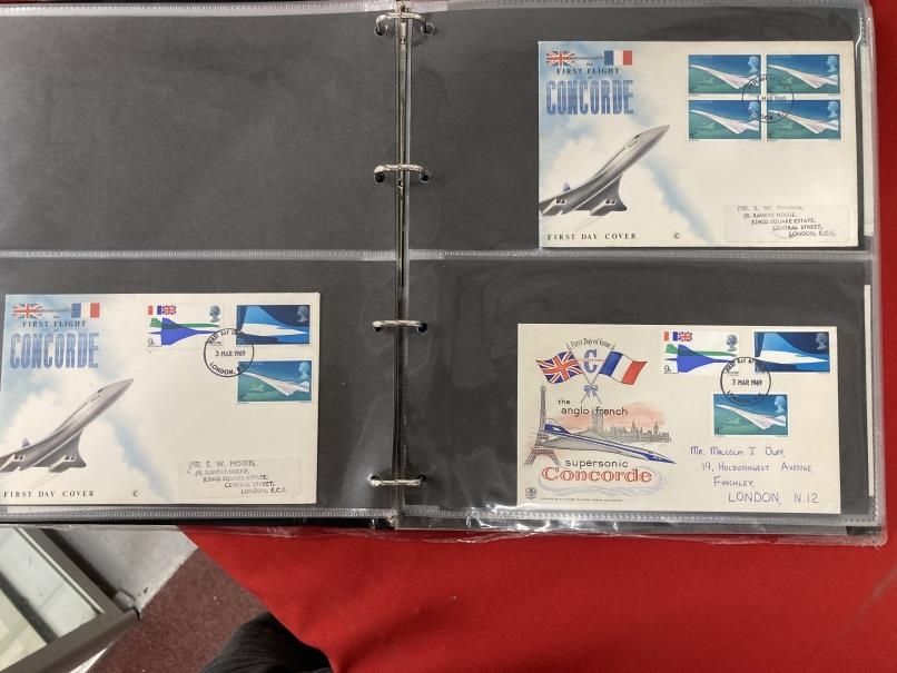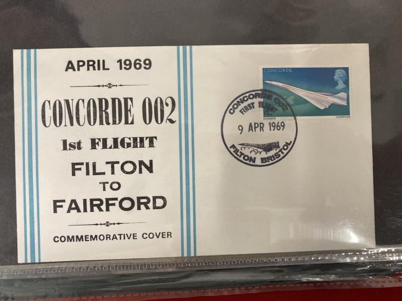 Stamps: Concorde commemorative covers in three looseleaf albums, many first day covers of landmark events including First Flight of 02, April 1969, First Flight at Mack 2 November 1970, First Scheduled Commercial Service London - Bahrain and Paris - Rio de Janeiro. One hundred and sixty seven covers plus sheet of unused GB issue stamps.