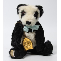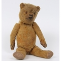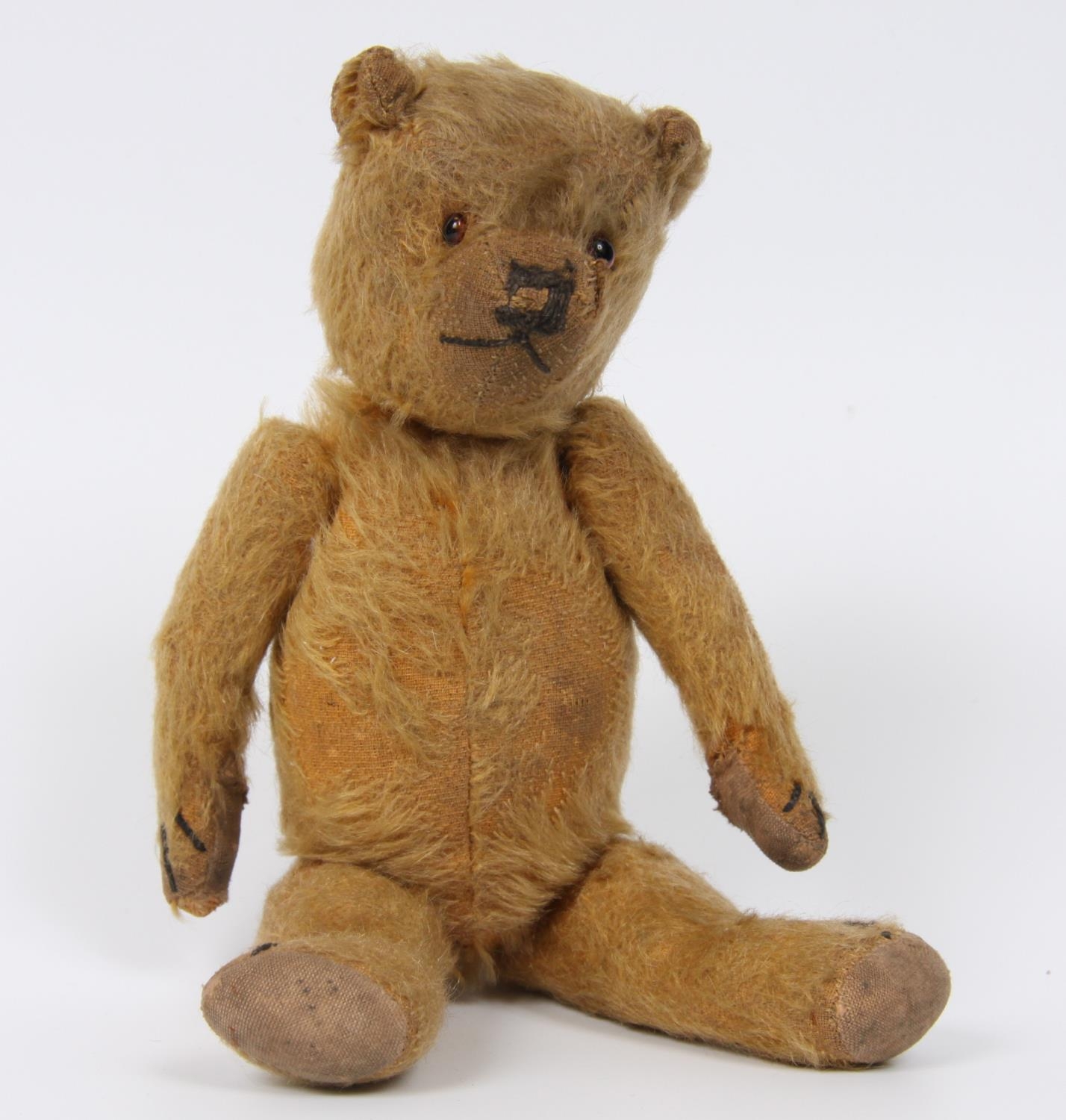 A blonde mohair straw filled teddy bear, amber and black plastic eyes and a pronounced snout , vertically brown stitched nose and mouth, long limbs with cloth type pads to hands and feet, fitted with a growl box 30cm tall