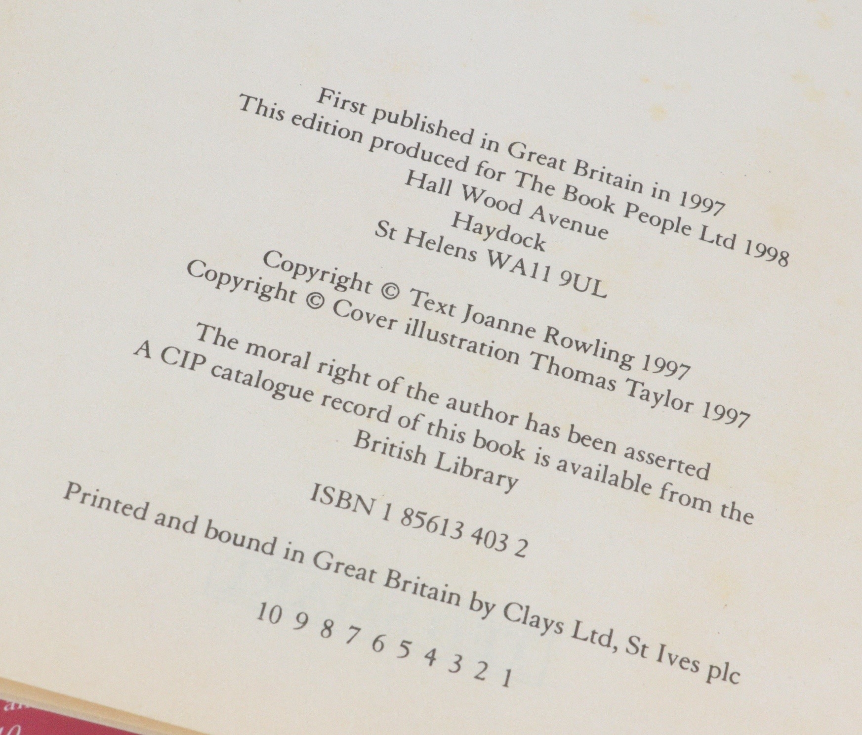 Harry Potter and the Philosopher's stone Ted Smart The Book People 1st edition first print 1998, with copy page showing 10 9 8 7 6 5 4 3 2 1, with dust jacket unclipped,