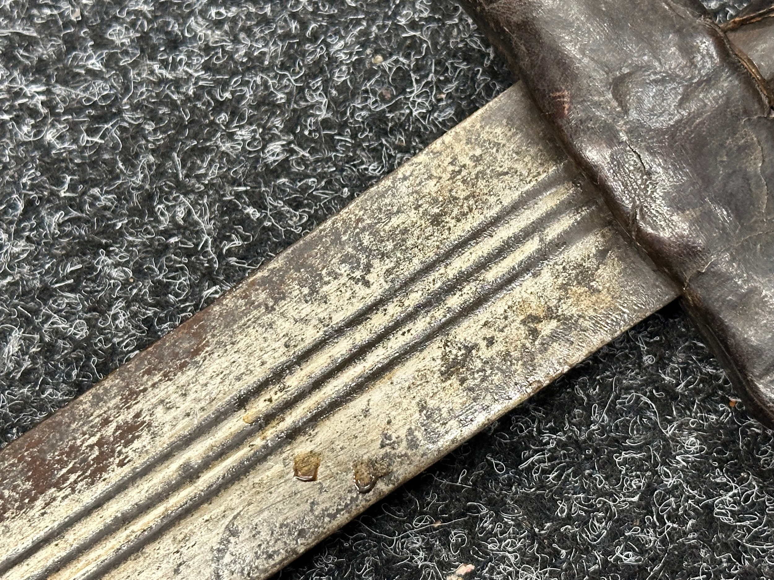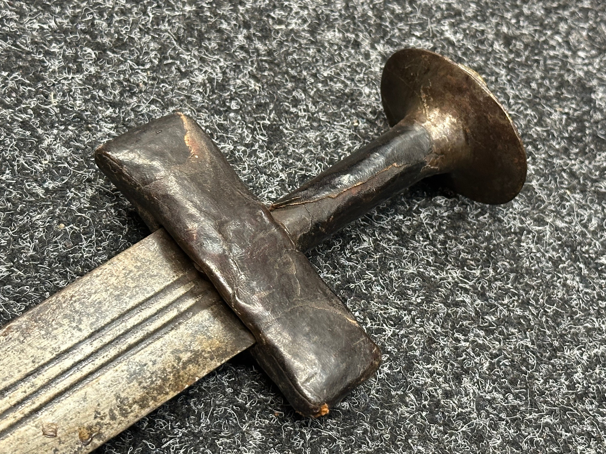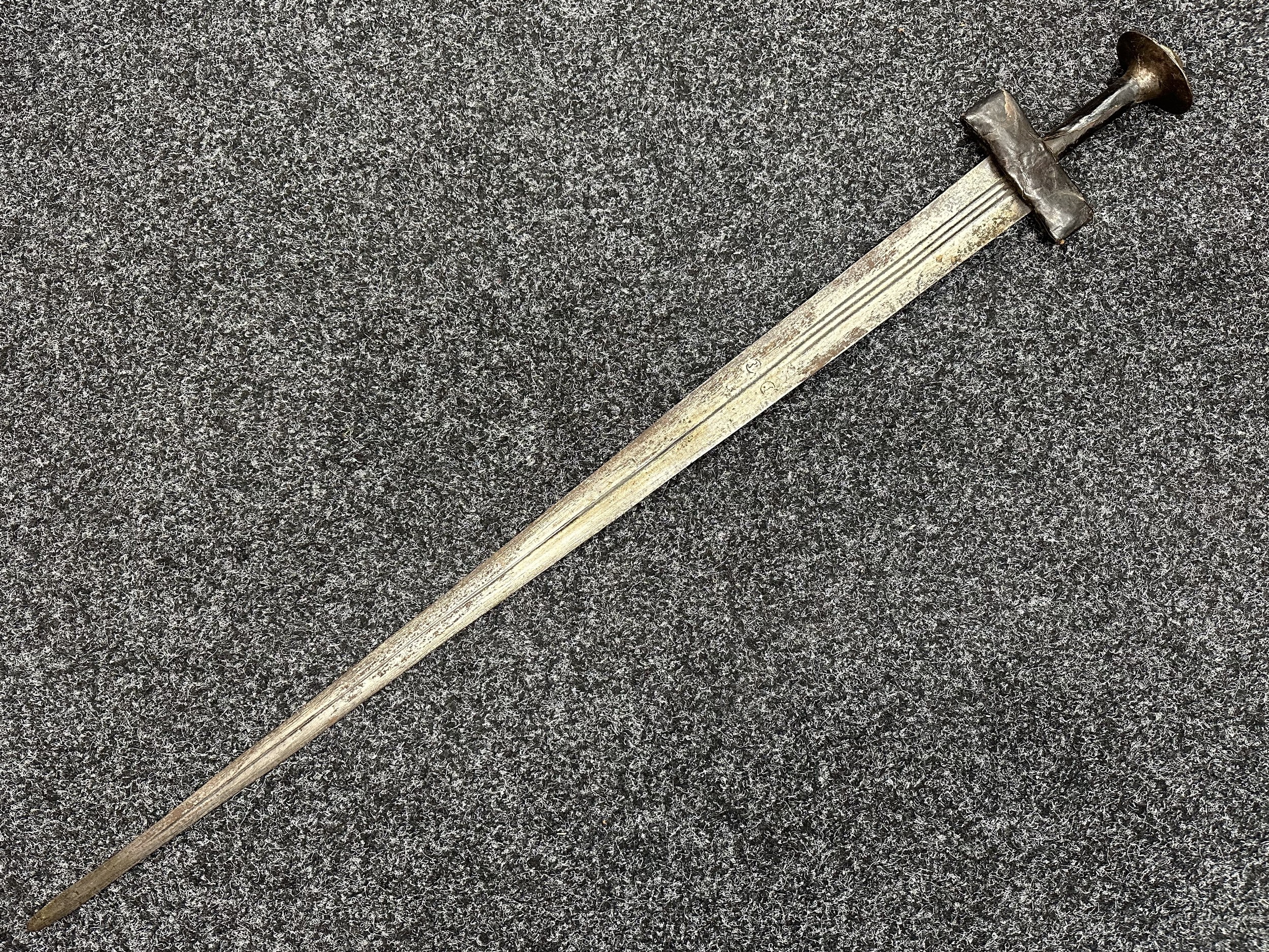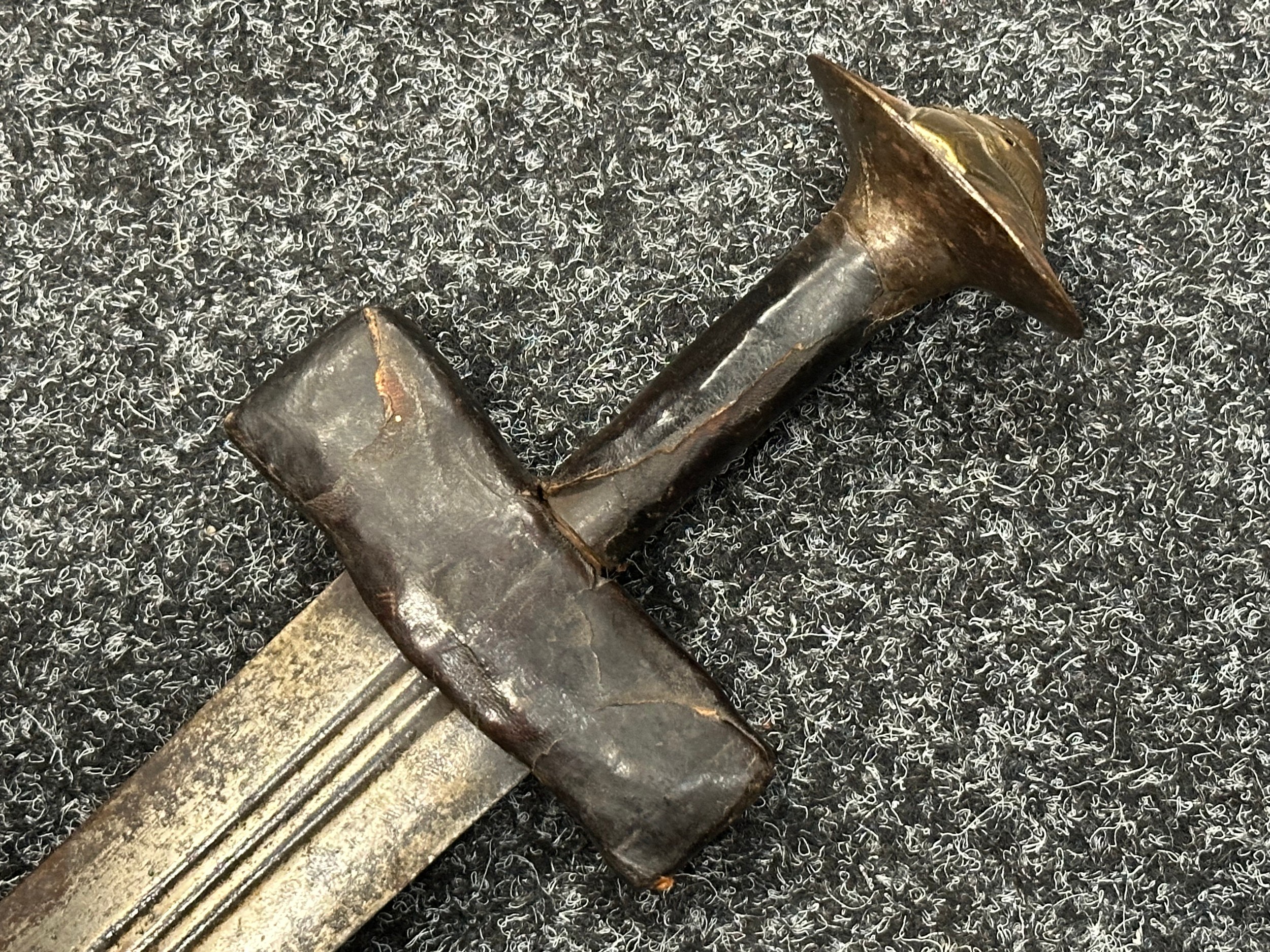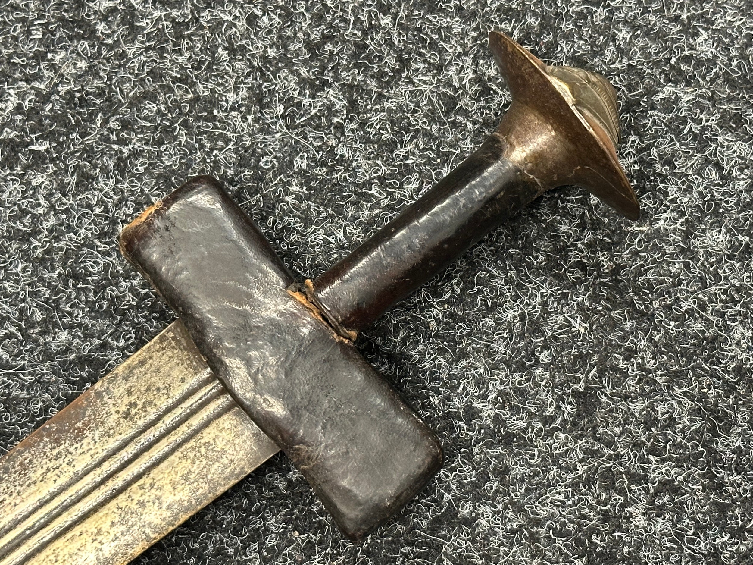 Sudanese Kaskara Sword with fullered double edged blade 834mm in length, marked with half moon markings. Leather covered crossguard and grip. Steel pommel with brass decoration. Overall length 970mm. No scabbard.