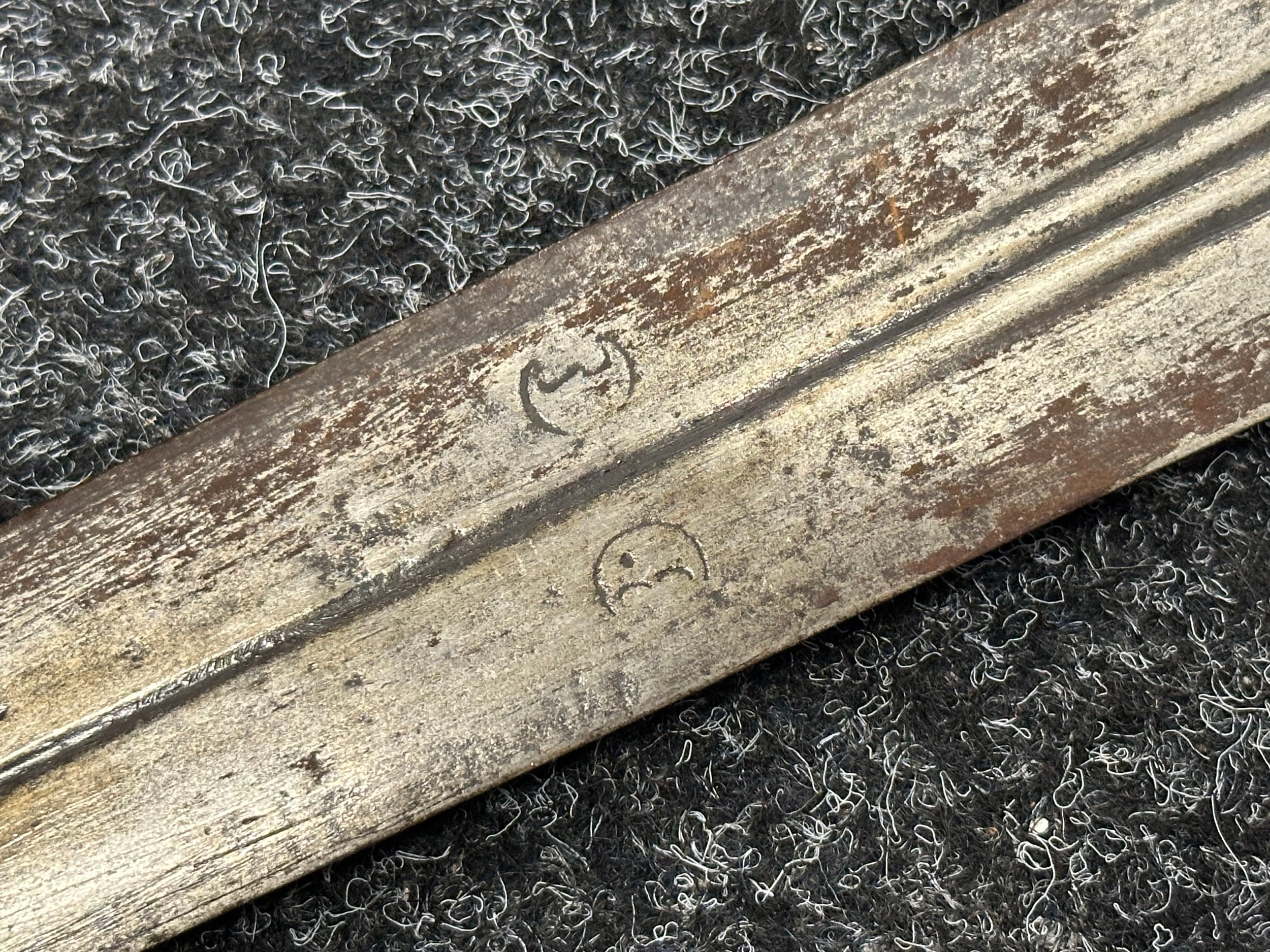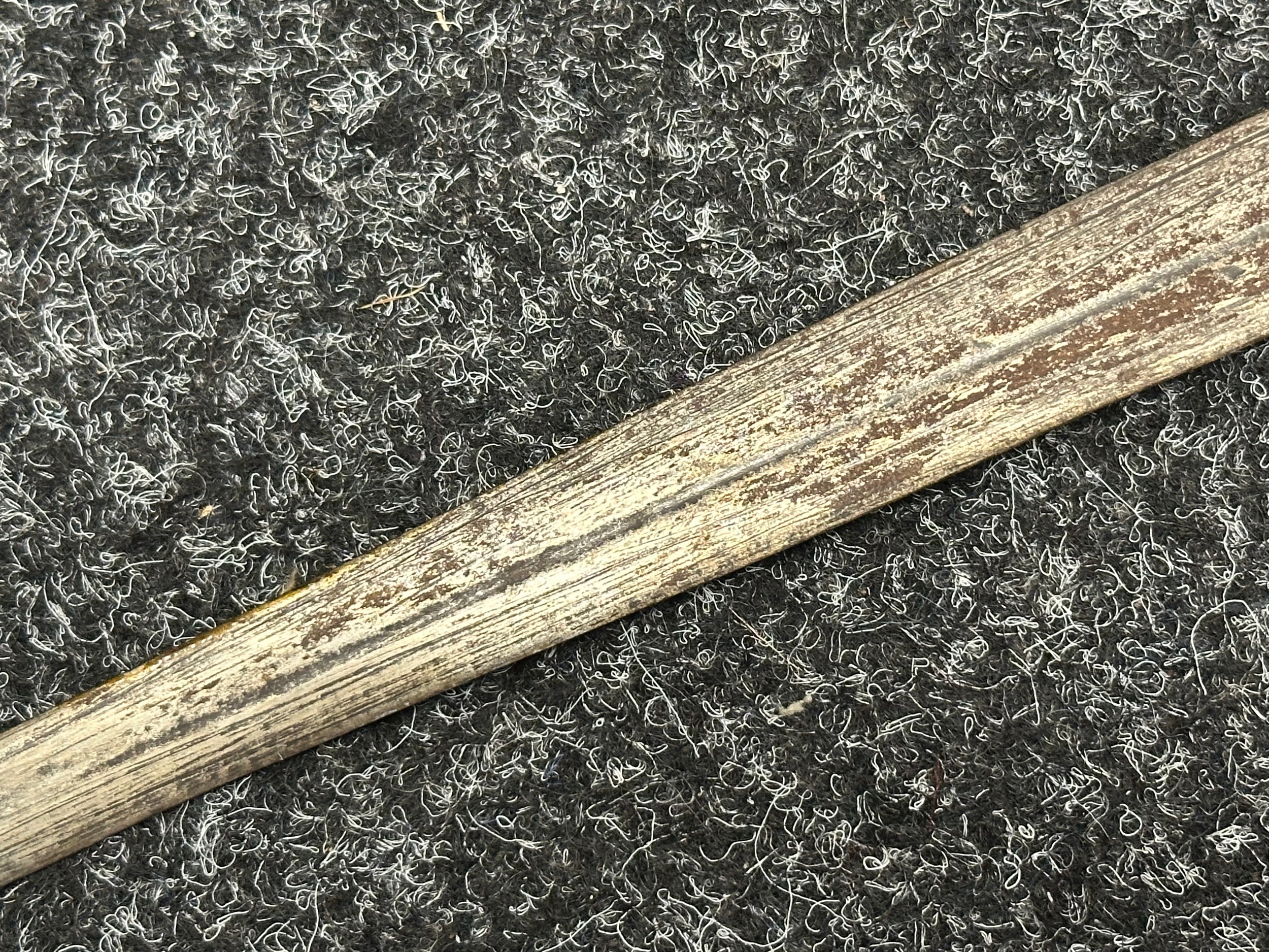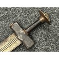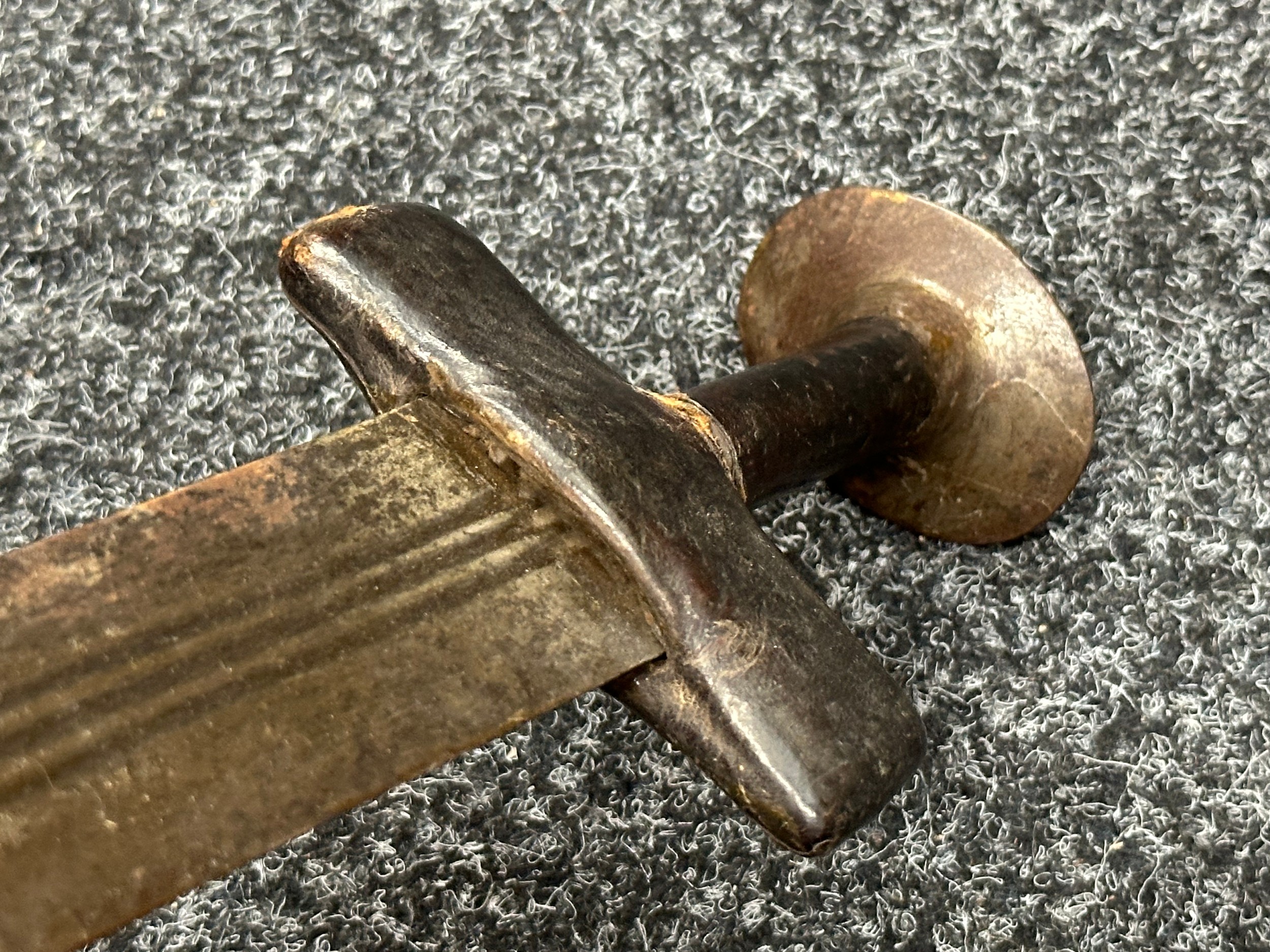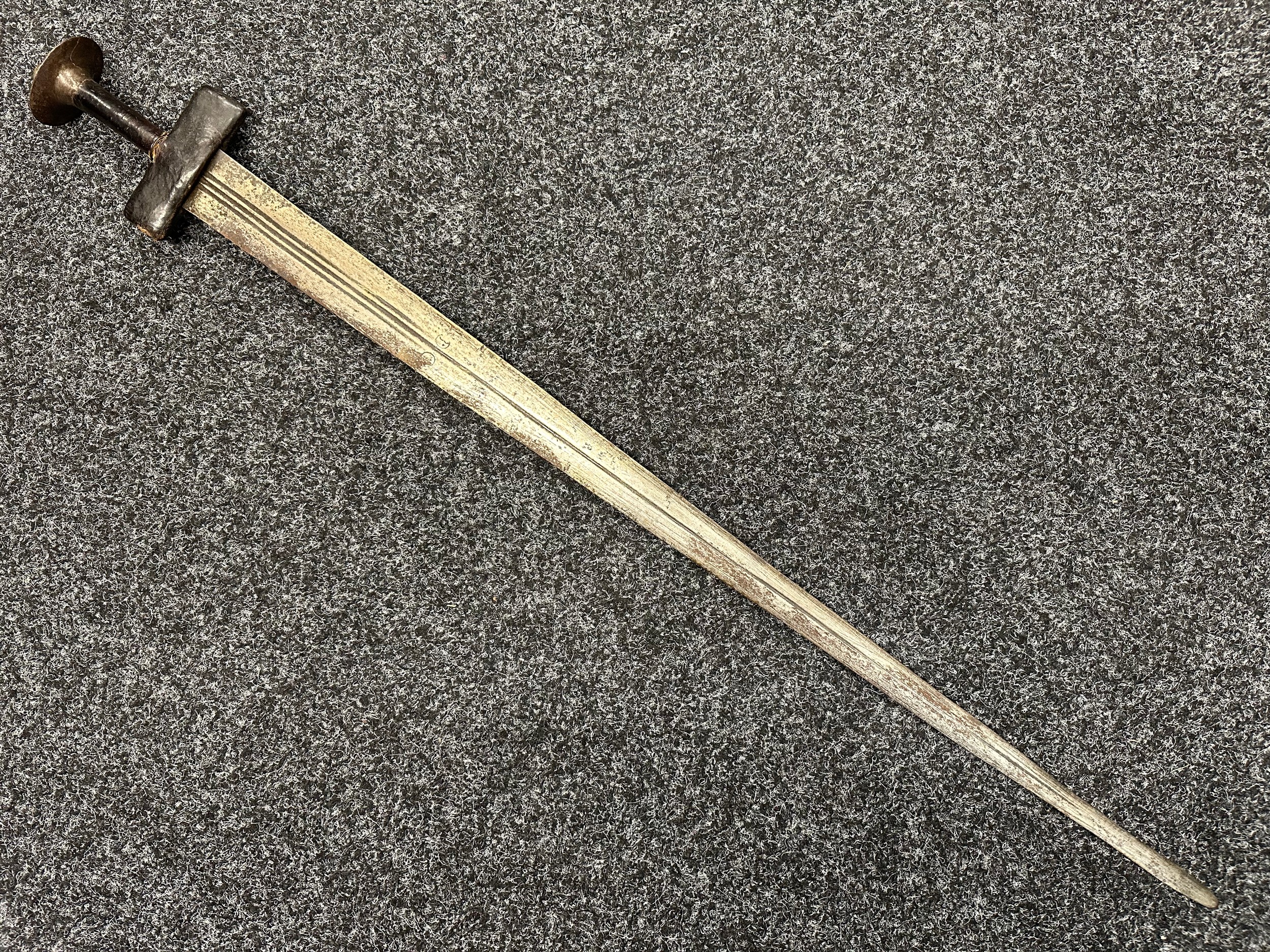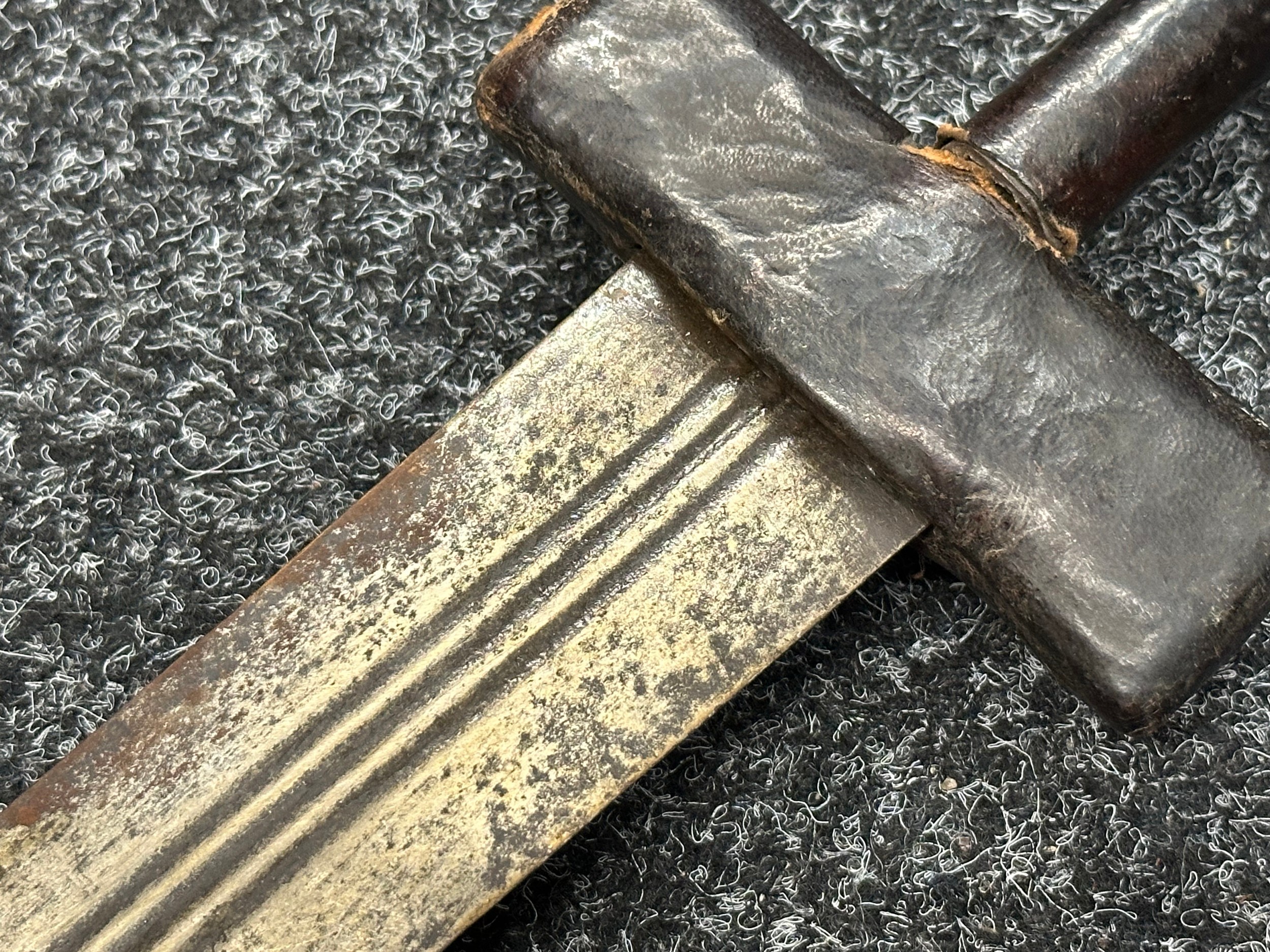 Sudanese Kaskara Sword with fullered double edged blade 834mm in length, marked with half moon markings. Leather covered crossguard and grip. Steel pommel with brass decoration. Overall length 970mm. No scabbard.