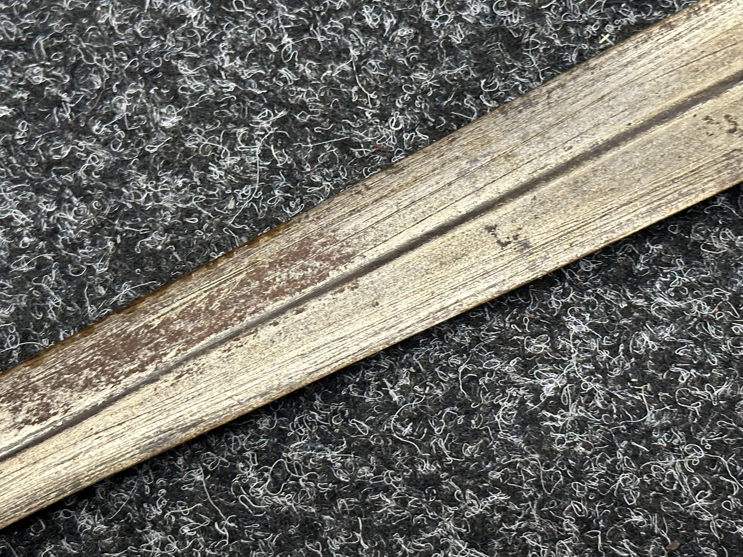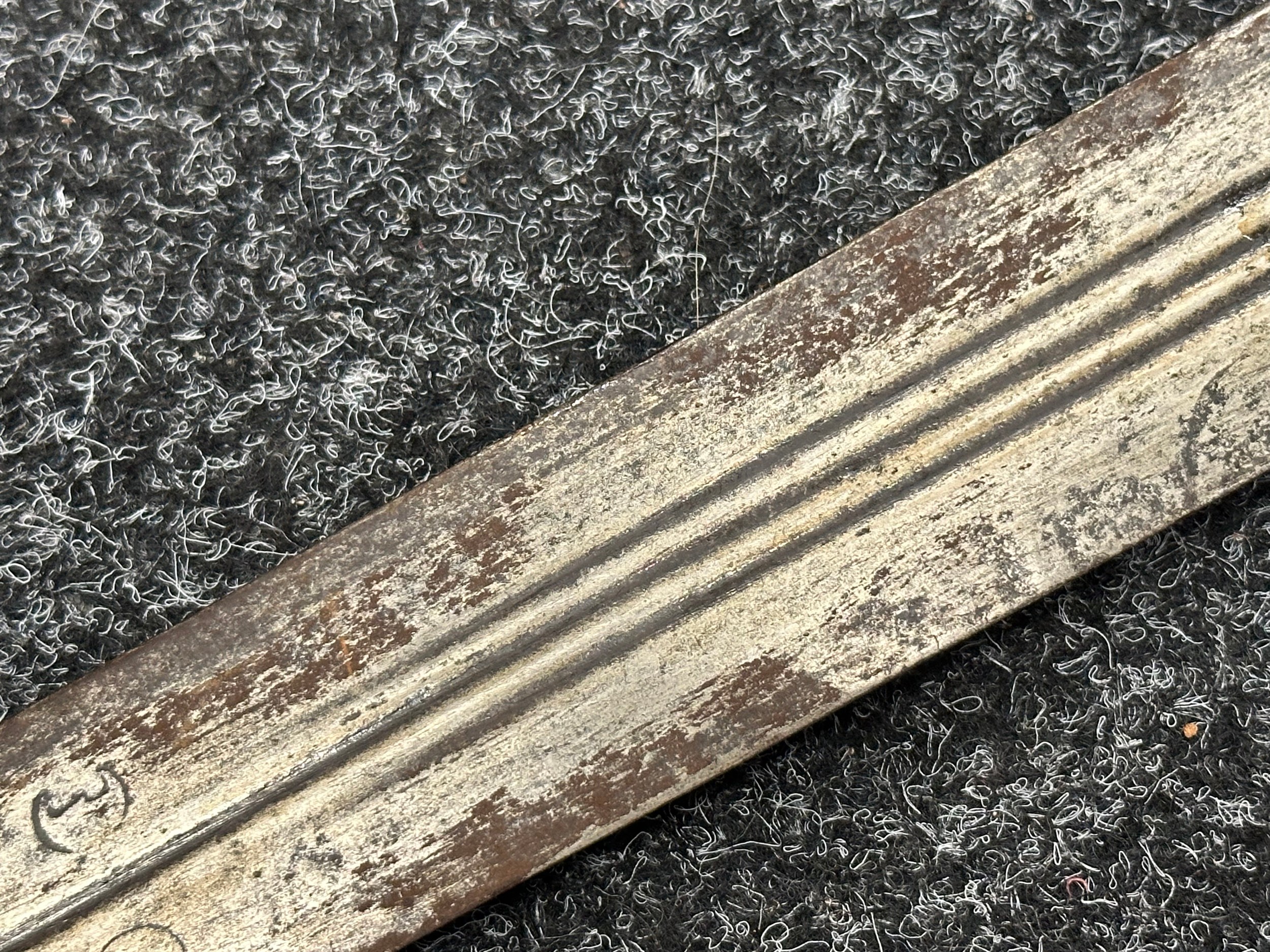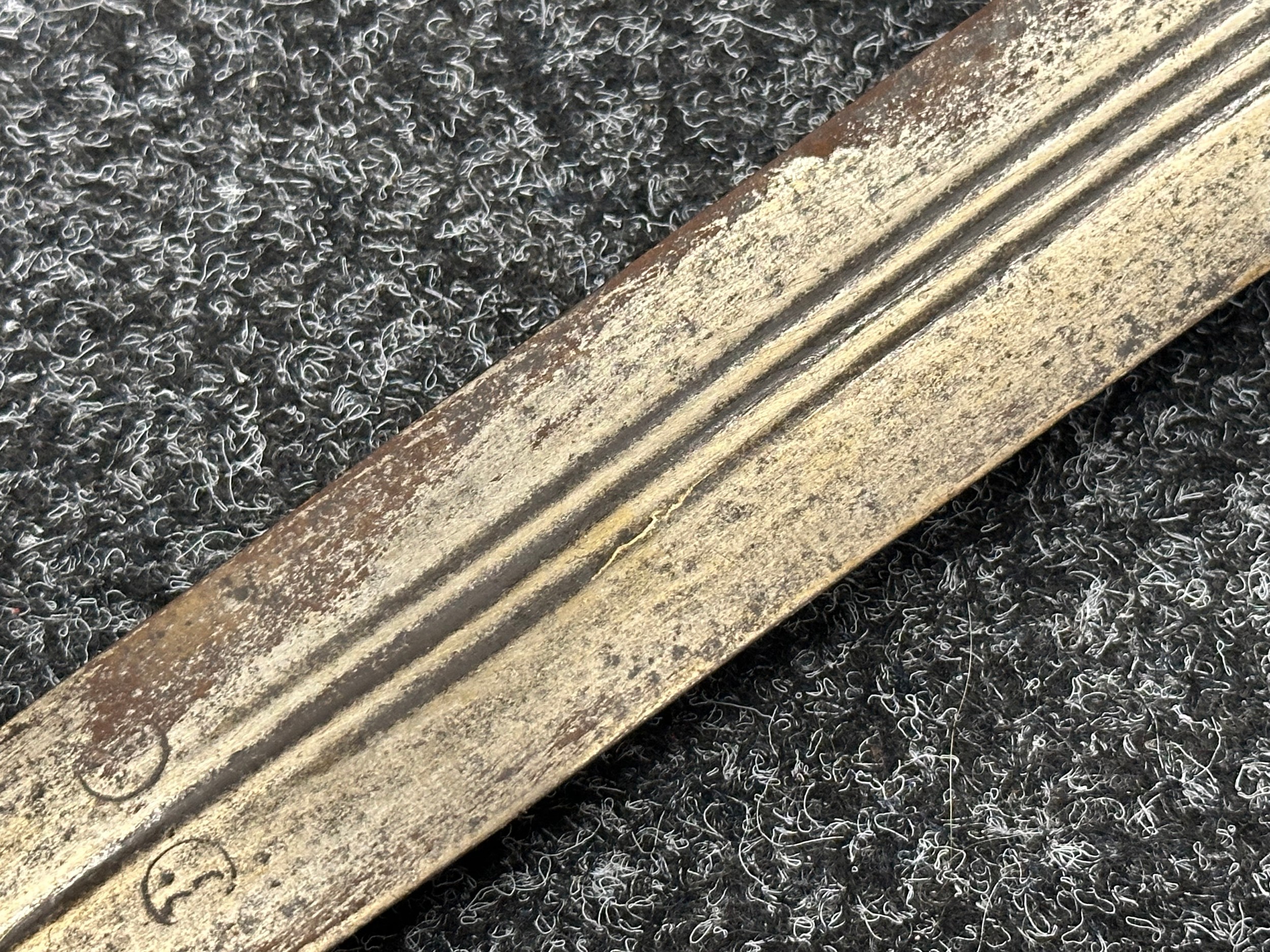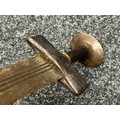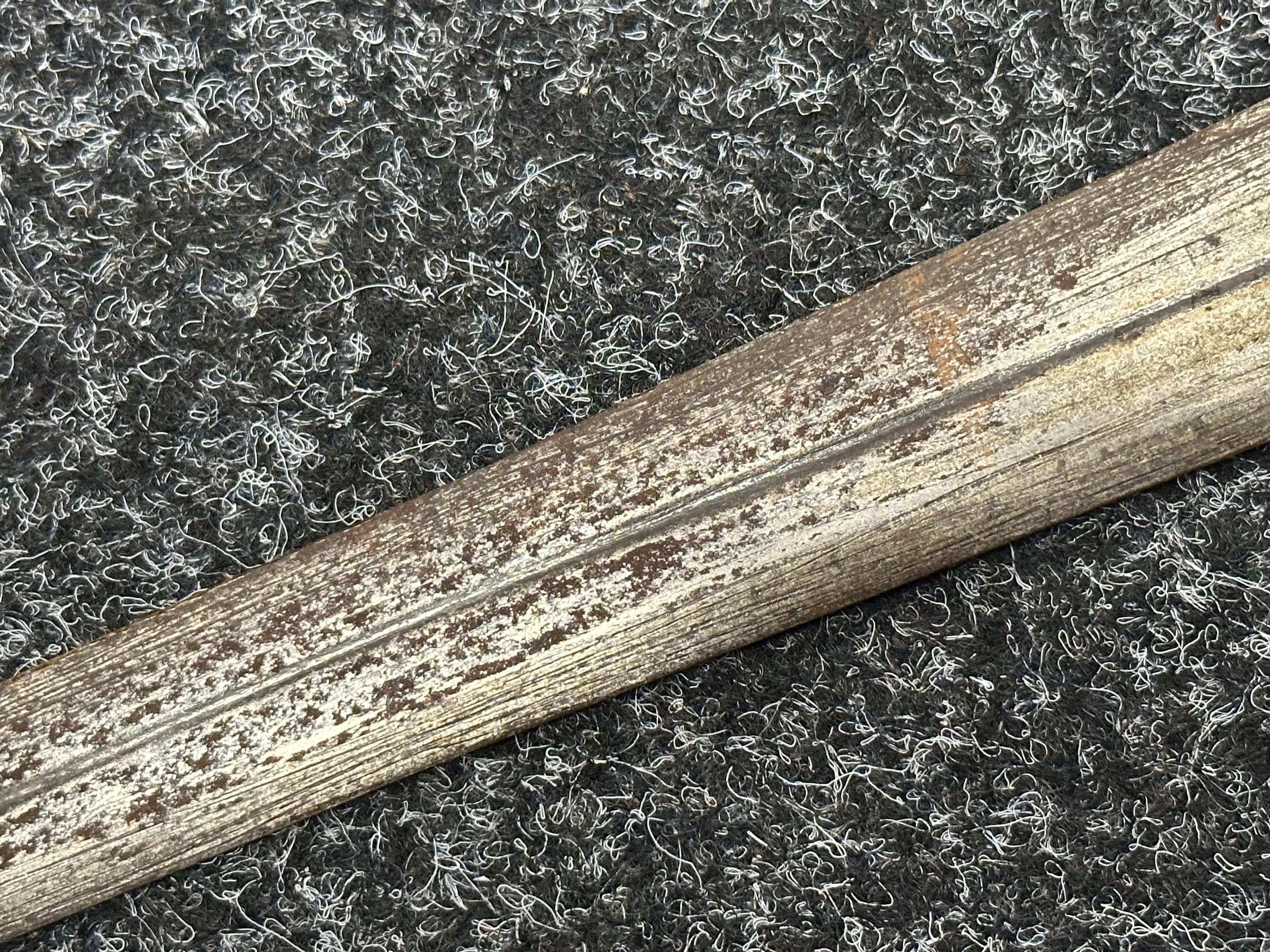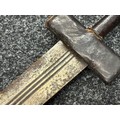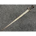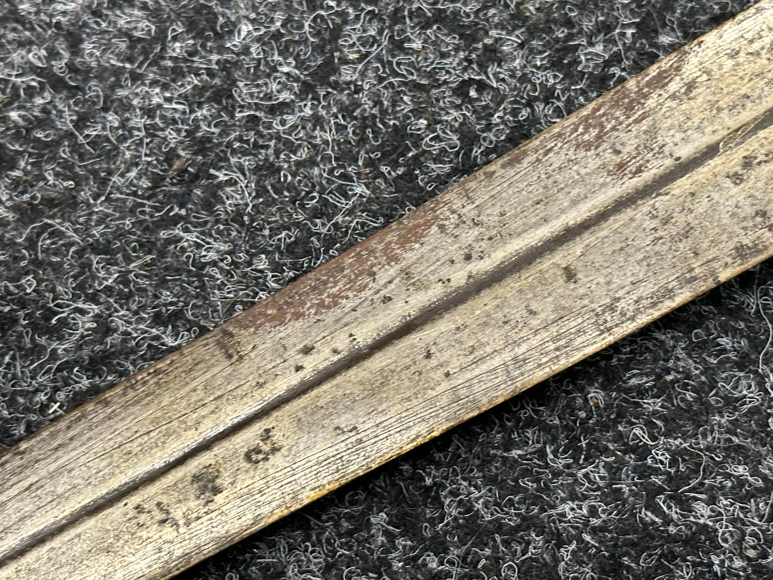 Sudanese Kaskara Sword with fullered double edged blade 834mm in length, marked with half moon markings. Leather covered crossguard and grip. Steel pommel with brass decoration. Overall length 970mm. No scabbard.