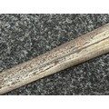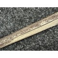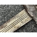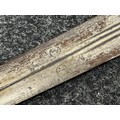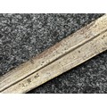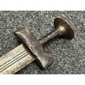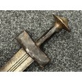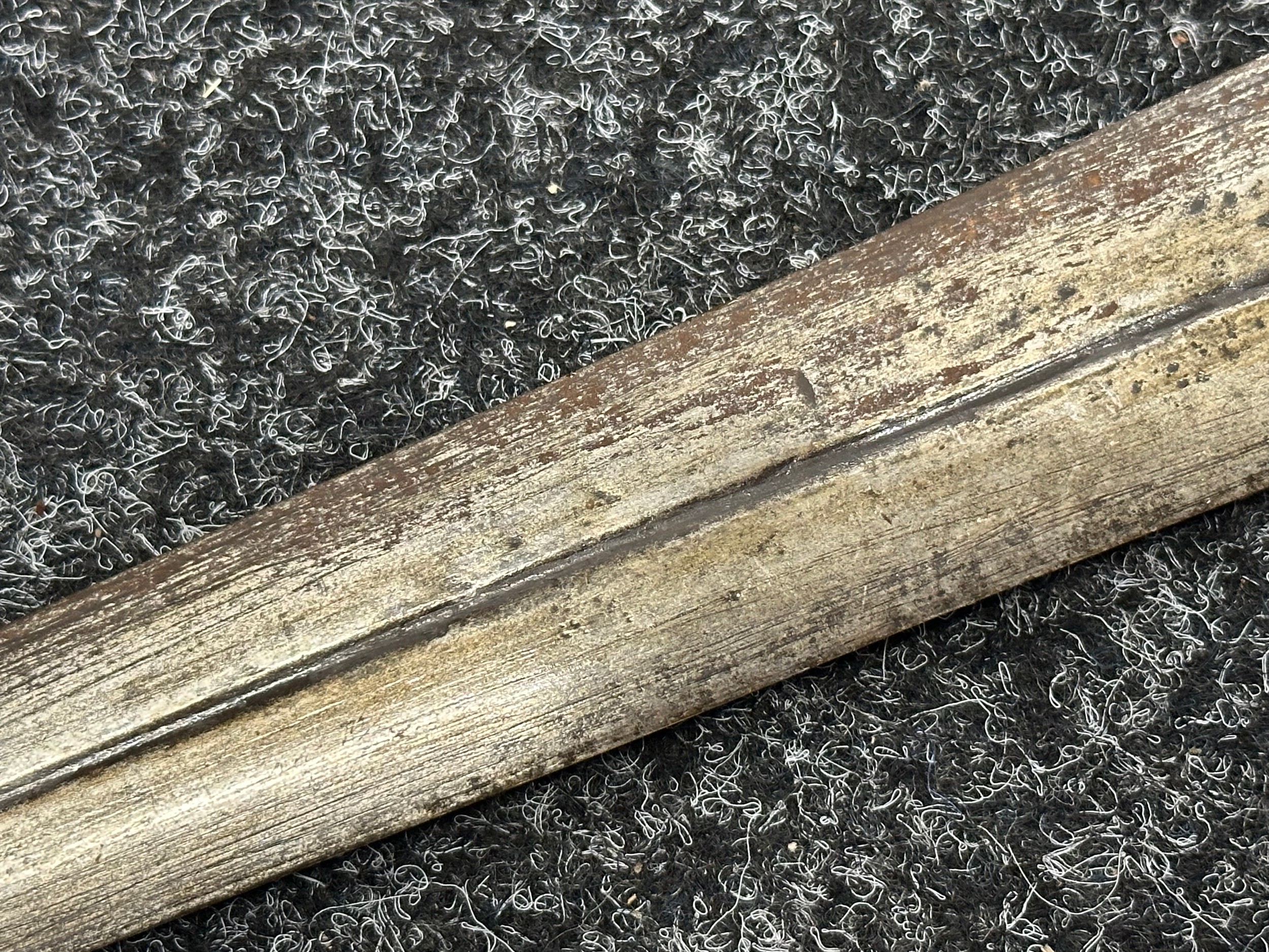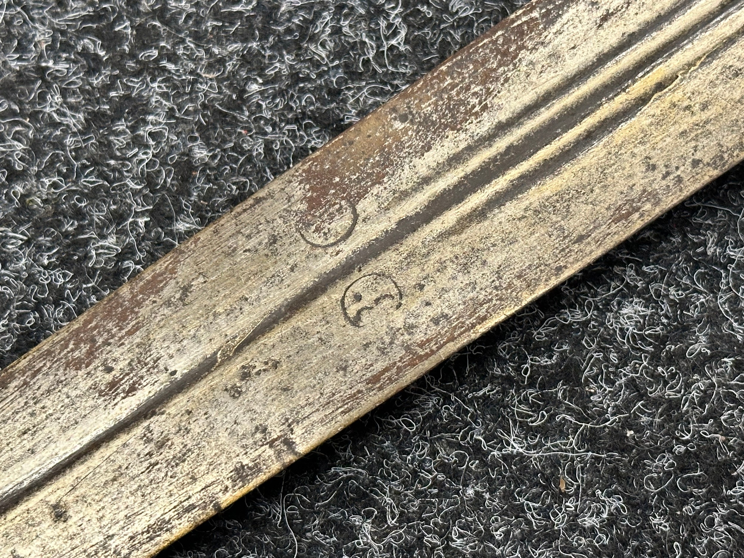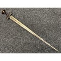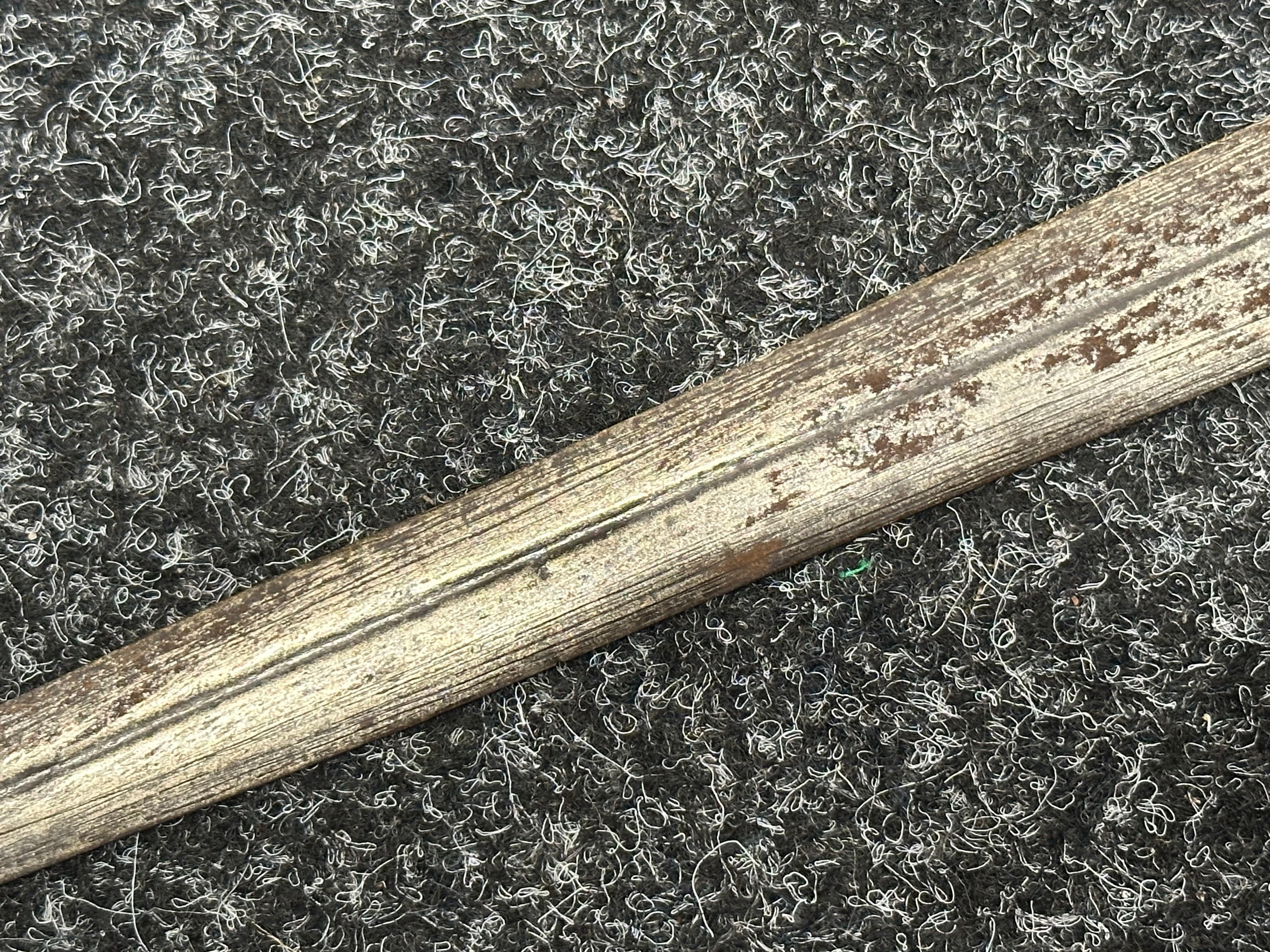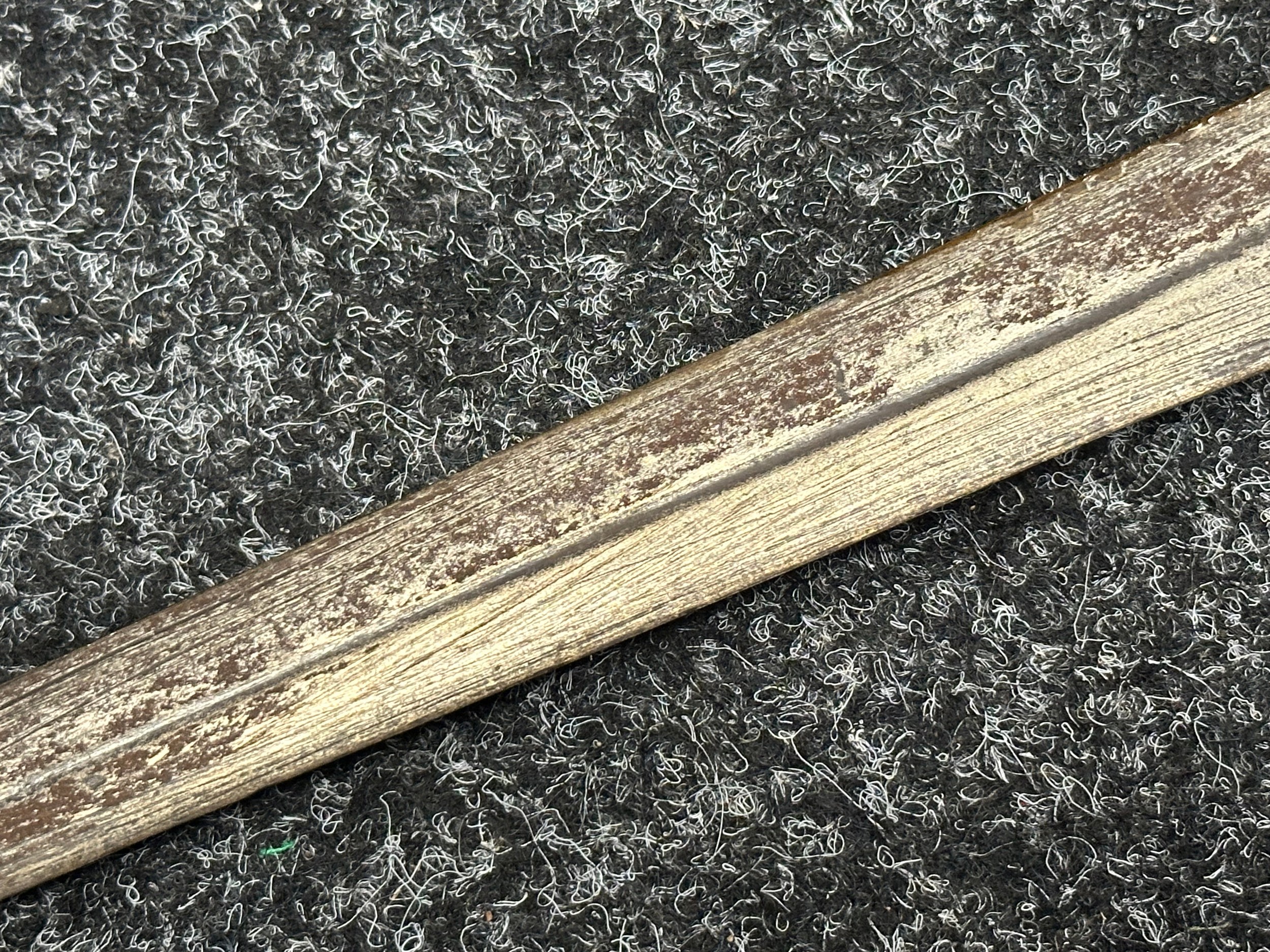 Sudanese Kaskara Sword with fullered double edged blade 834mm in length, marked with half moon markings. Leather covered crossguard and grip. Steel pommel with brass decoration. Overall length 970mm. No scabbard.